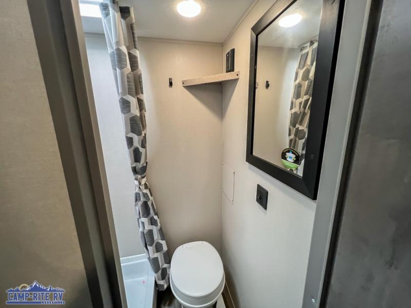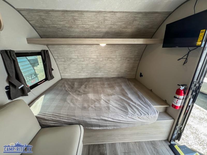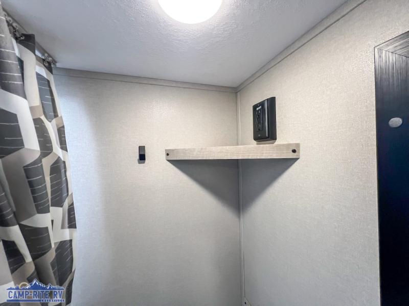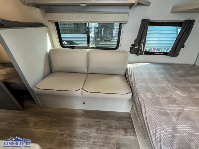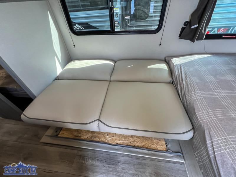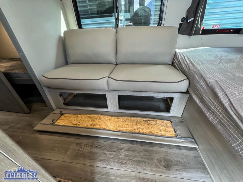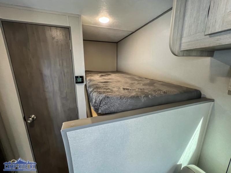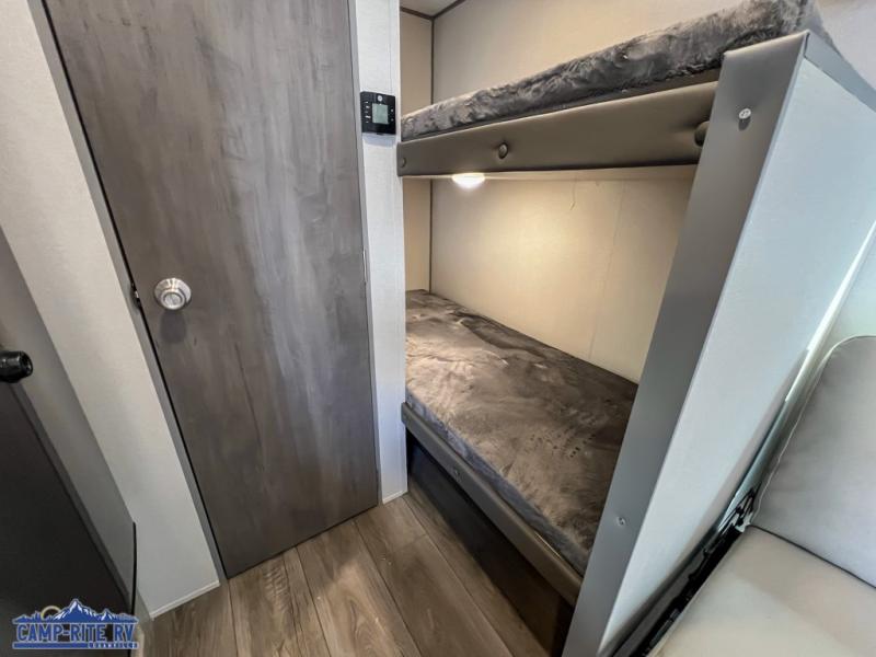 This travel trailers is perfect for a young family or smaller group. You can easily sleep four or more with the rear set of bunk beds and queen bed up front. There is also a 60" sofa for inside down-time, as well as complete kitchen and bath amenities so you can cook and stay clean while traveling. The rear corner bath features a toilet and 36" x 30" shower, and it's conveniently located next to the bunk beds which is great for little ones at night. Cooking inside will be easy with a GE stainless two-burner cooktop and single sink, plus there is also a GE microwave oven for snacks and things that you can easily warm up. If you plan to spend most of your time outdoors, you will find plenty of storage space in the front exterior storage compartment, and there is also plenty of storage inside as well.