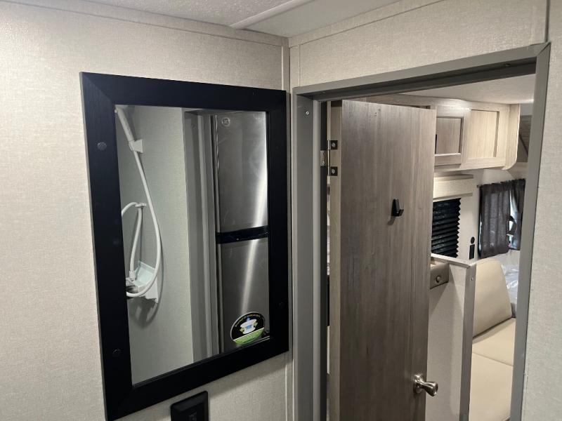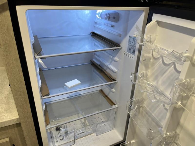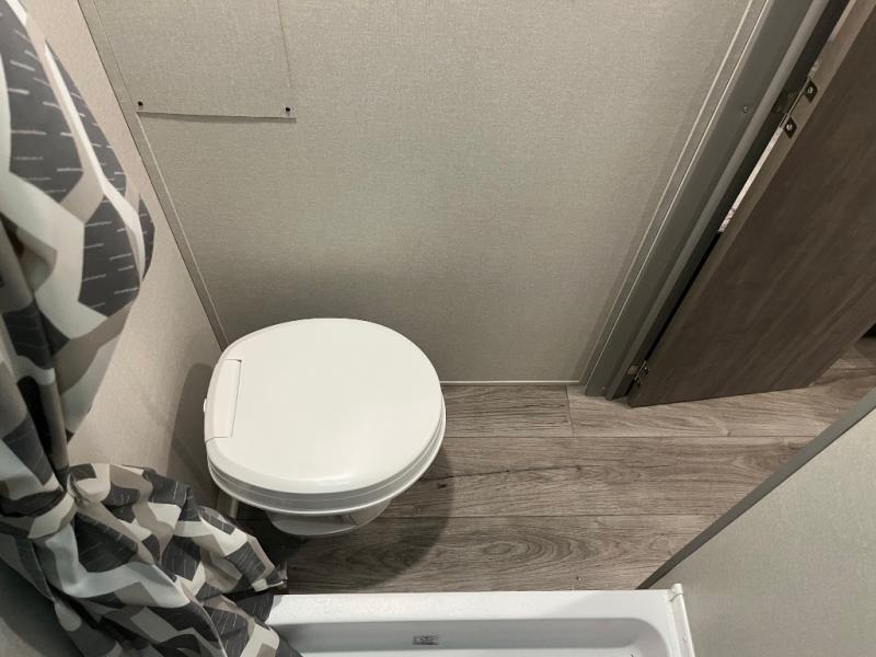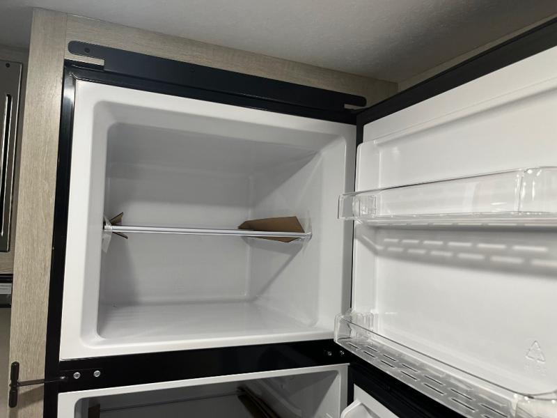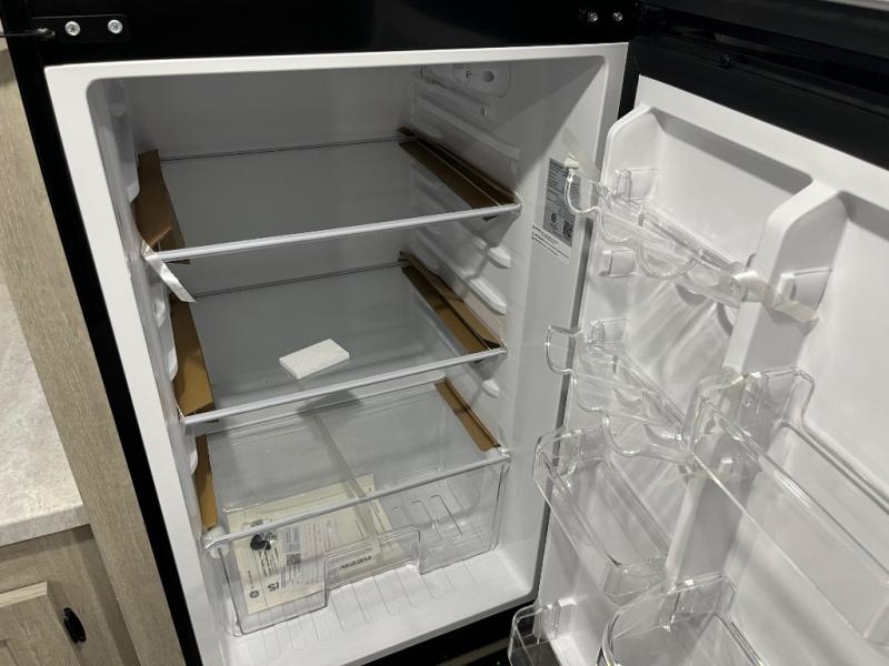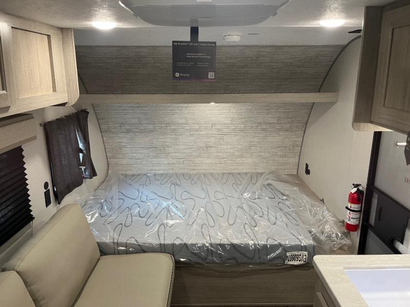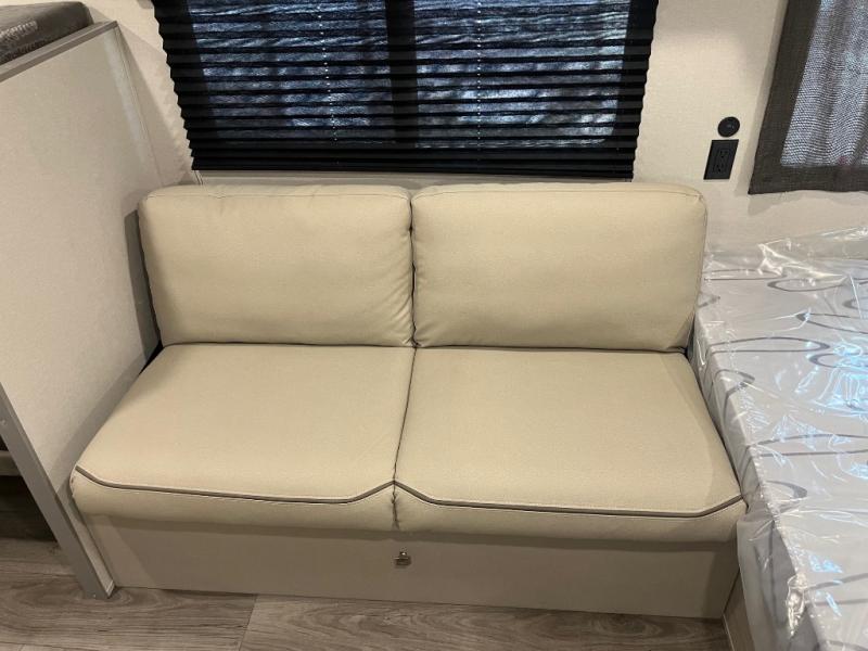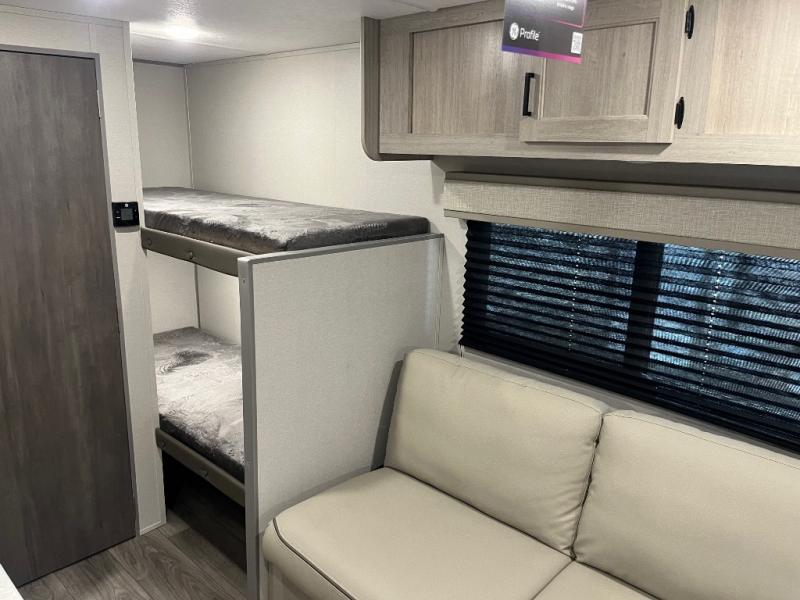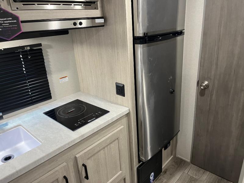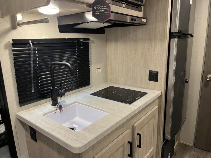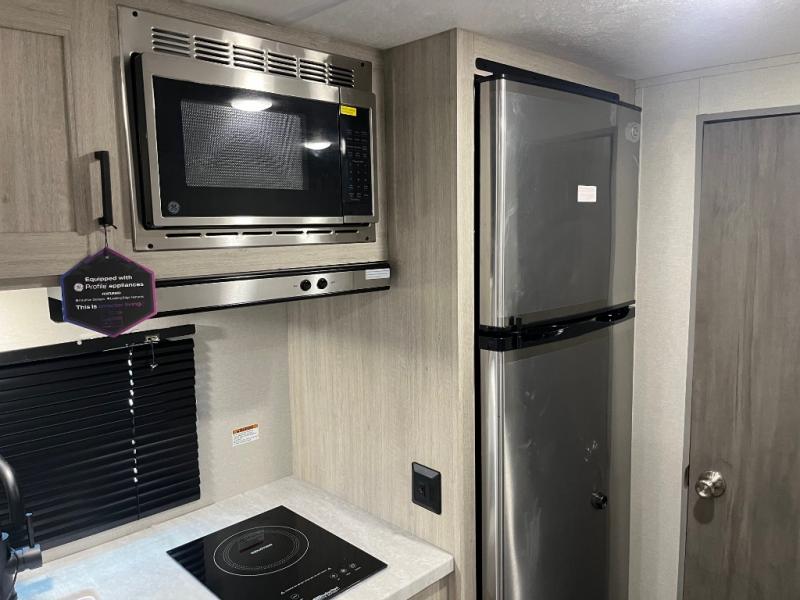 This travel trailers is perfect for a young family or smaller group. You can easily sleep four or more with the rear set of bunk beds and queen bed up front. There is also a 60" sofa for inside down-time, as well as complete kitchen and bath amenities so you can cook and stay clean while traveling. The rear corner bath features a toilet and 36" x 30" shower, and it's conveniently located next to the bunk beds which is great for little ones at night. Cooking inside will be easy with a GE stainless two-burner cooktop and single sink, plus there is also a GE microwave oven for snacks and things that you can easily warm up. If you plan to spend most of your time outdoors, you will find plenty of storage space in the front exterior storage compartment, and there is also plenty of storage inside as well.