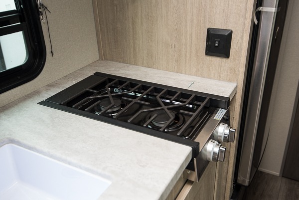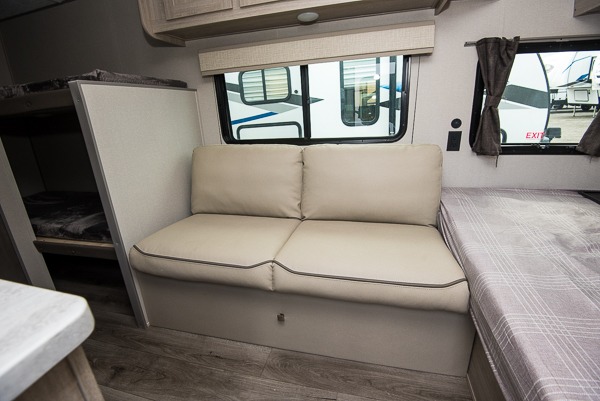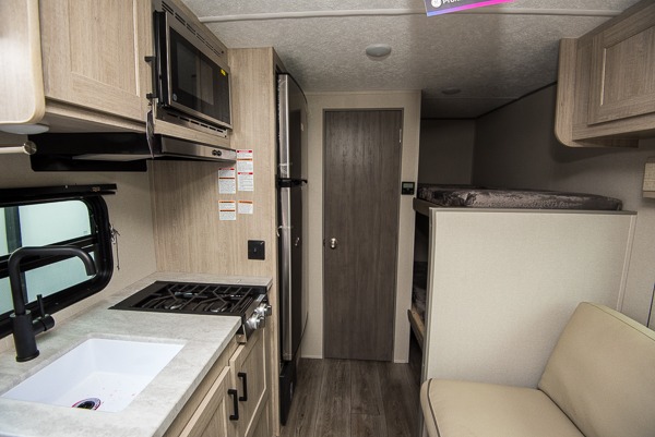 This travel trailers is perfect for a young family or smaller group. You can easily sleep four or more with the rear set of bunk beds and queen bed up front. There is also a 60" sofa for inside down-time, as well as complete kitchen and bath amenities so you can cook and stay clean while traveling. The rear corner bath features a toilet and 36" x 30" shower, and it's conveniently located next to the bunk beds which is great for little ones at night. Cooking inside will be easy with a GE stainless two-burner cooktop and single sink, plus there is also a GE microwave oven for snacks and things that you can easily warm up. If you plan to spend most of your time outdoors, you will find plenty of storage space in the front exterior storage compartment, and there is also plenty of storage inside as well.