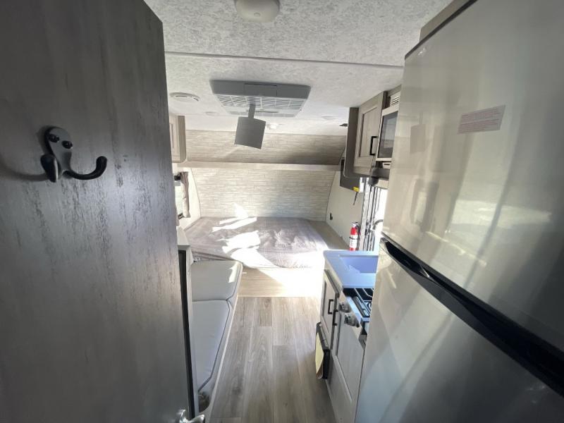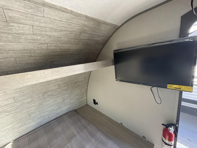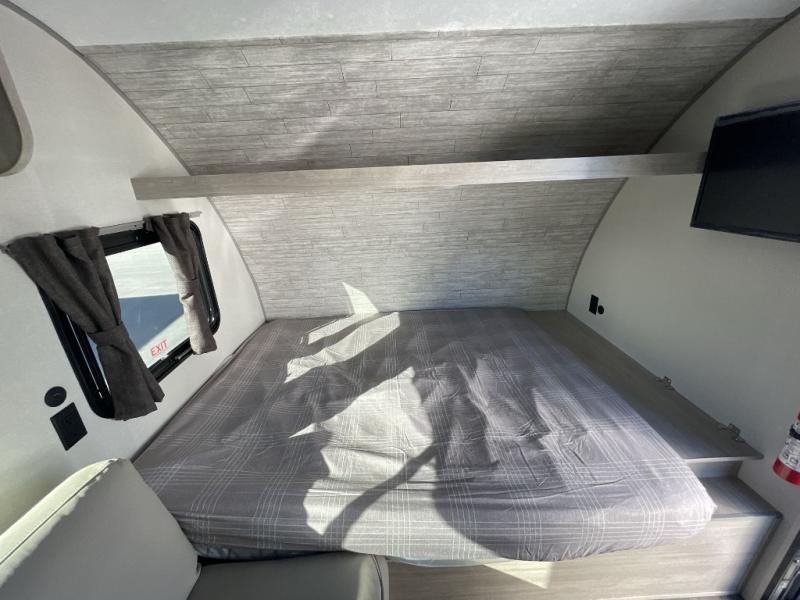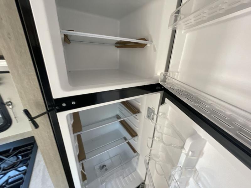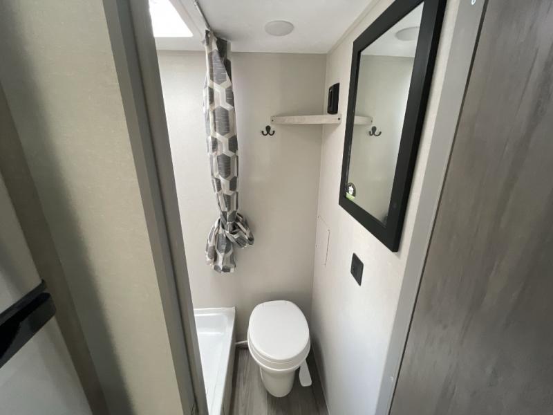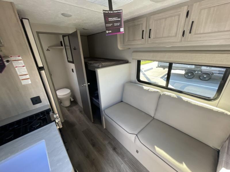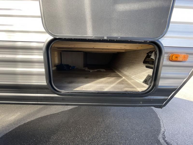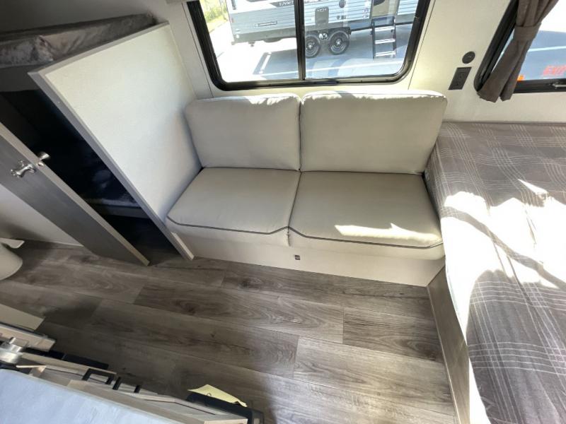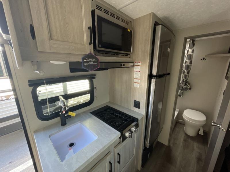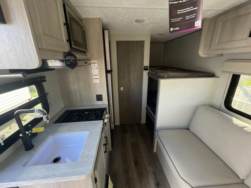This travel trailers is perfect for a young family or smaller group. You can easily sleep four or more with the rear set of bunk beds and queen bed up front. There is also a 60" sofa for inside down-time, as well as complete kitchen and bath amenities so you can cook and stay clean while traveling. The rear corner bath features a toilet and 36" x 30" shower, and it's conveniently located next to the bunk beds which is great for little ones at night. Cooking inside will be easy with a GE stainless two-burner cooktop and single sink, plus there is also a GE microwave oven for snacks and things that you can easily warm up. If you plan to spend most of your time outdoors, you will find plenty of storage space in the front exterior storage compartment, and there is also plenty of storage inside as well.