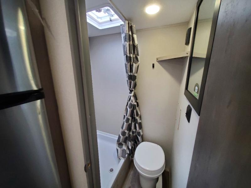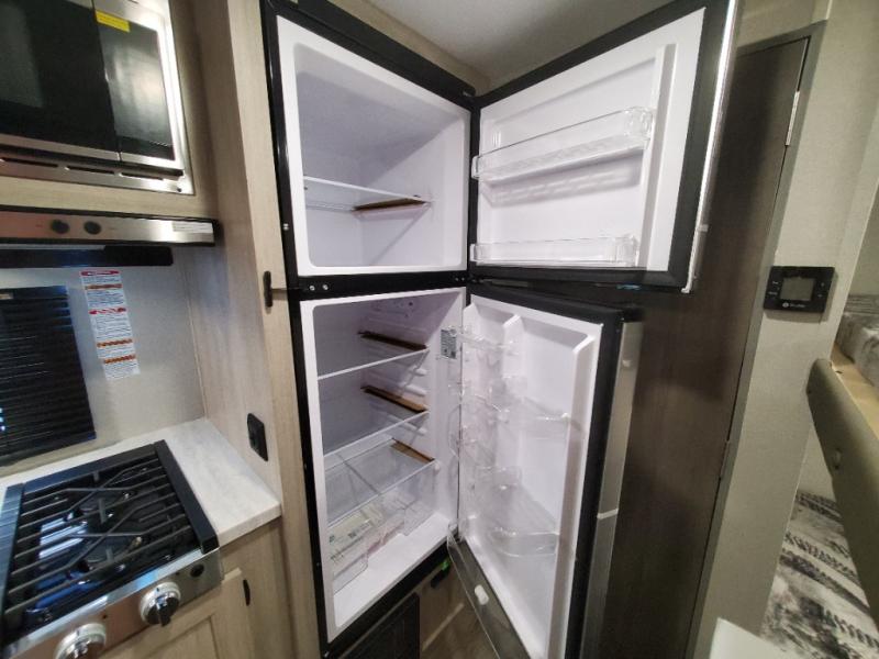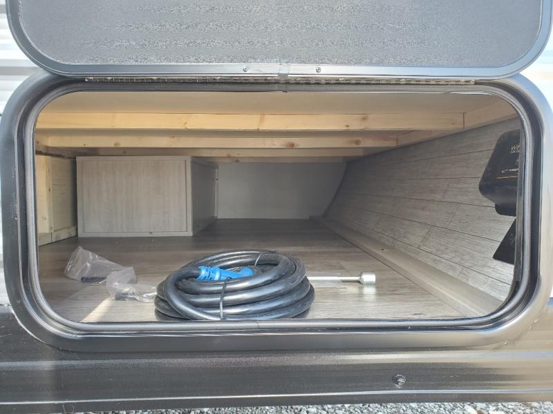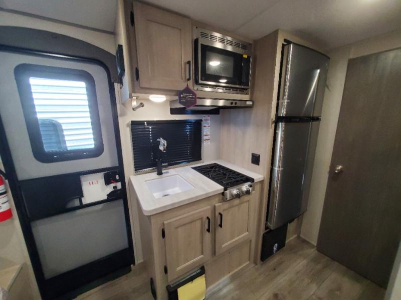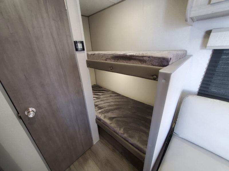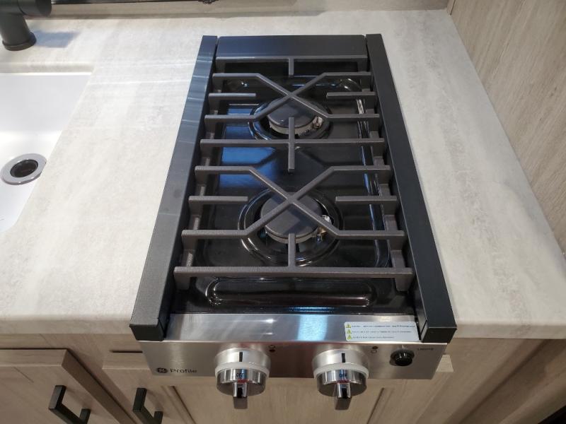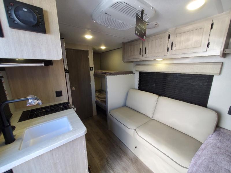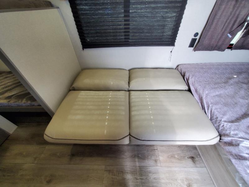 This travel trailers is perfect for a young family or smaller group. You can easily sleep four or more with the rear set of bunk beds and queen bed up front. There is also a 60" sofa for inside down-time, as well as complete kitchen and bath amenities so you can cook and stay clean while traveling. The rear corner bath features a toilet and 36" x 30" shower, and it's conveniently located next to the bunk beds which is great for little ones at night. Cooking inside will be easy with a GE stainless two-burner cooktop and single sink, plus there is also a GE microwave oven for snacks and things that you can easily warm up. If you plan to spend most of your time outdoors, you will find plenty of storage space in the front exterior storage compartment, and there is also plenty of storage inside as well.