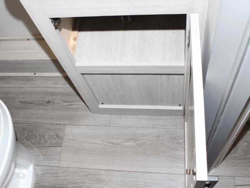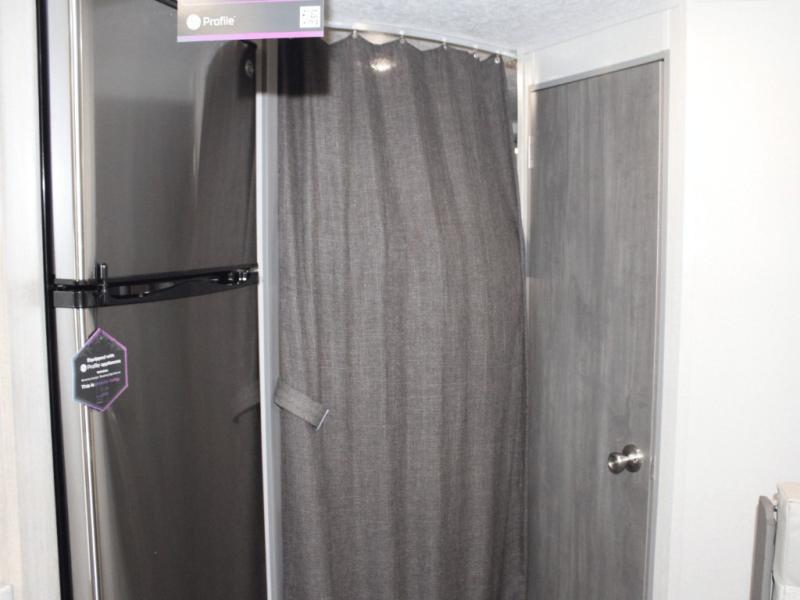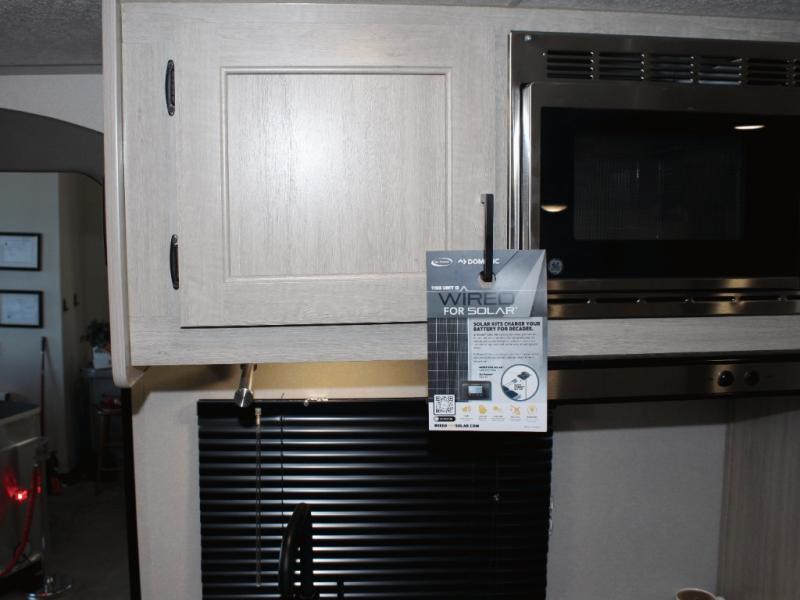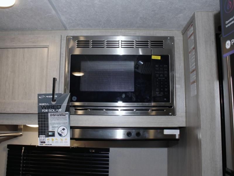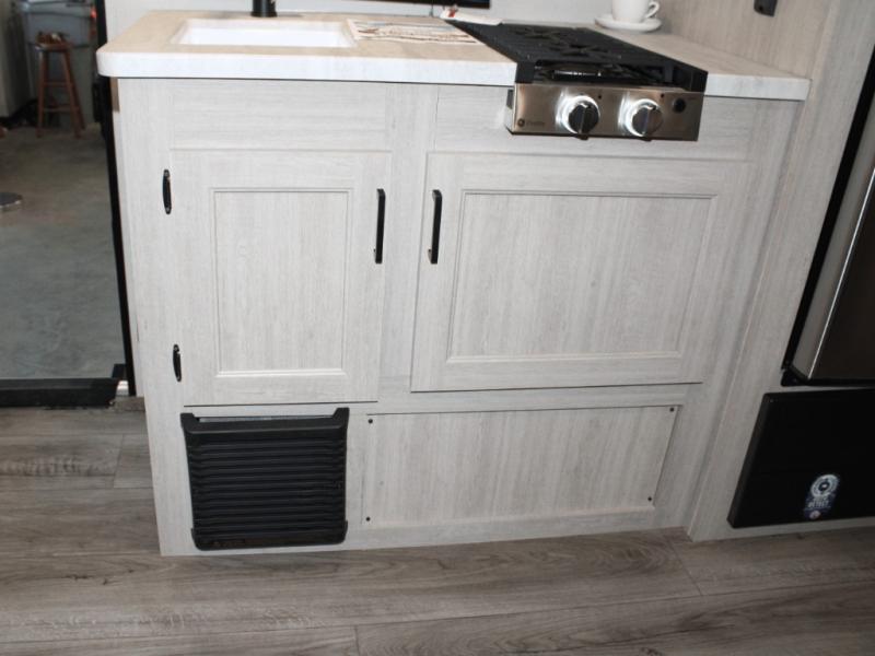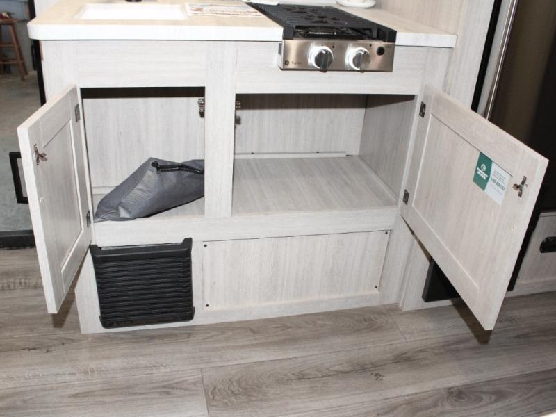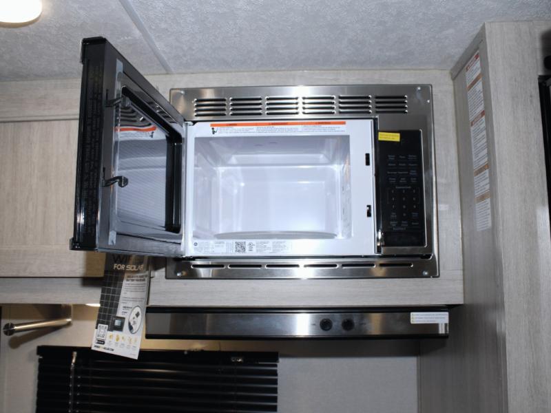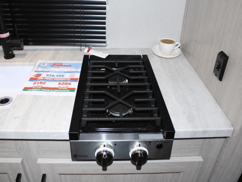 Make mealtime easy with a GE two-burner cooktop, microwave oven, deep basin farm-style sink, and a 10.7 cu. ft. 12V refrigerator—plenty of space for cold drinks and leftovers. With seamless Thermofoil countertops, clean-up is a breeze, so you can spend more time relaxing.