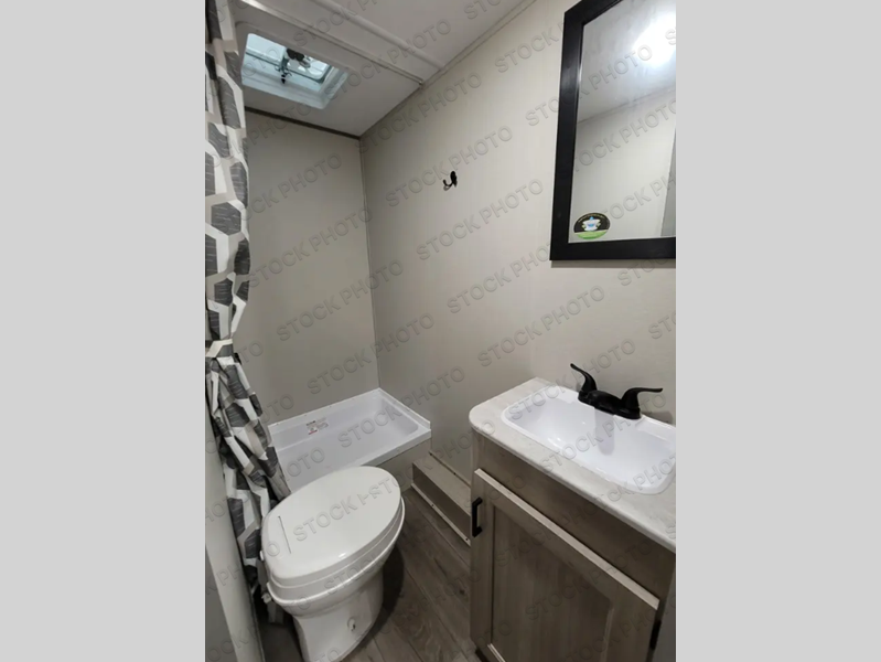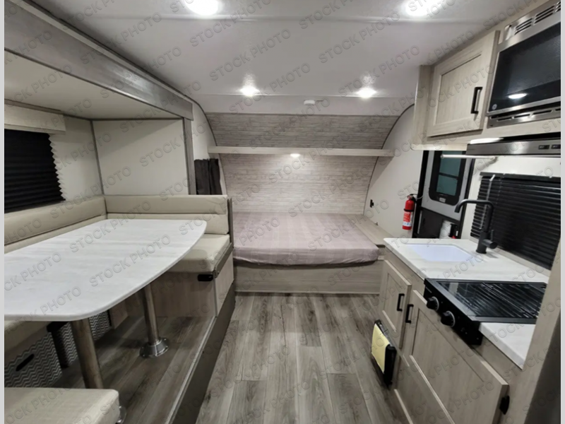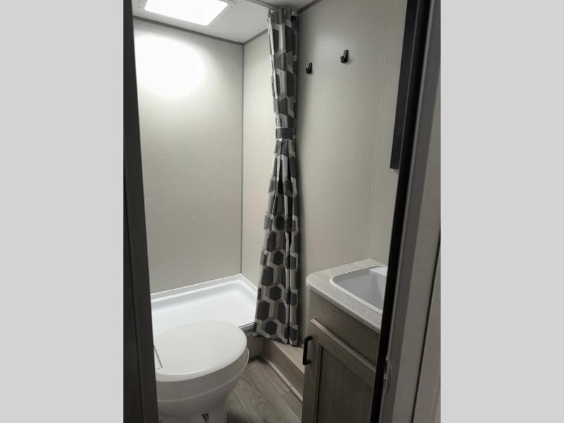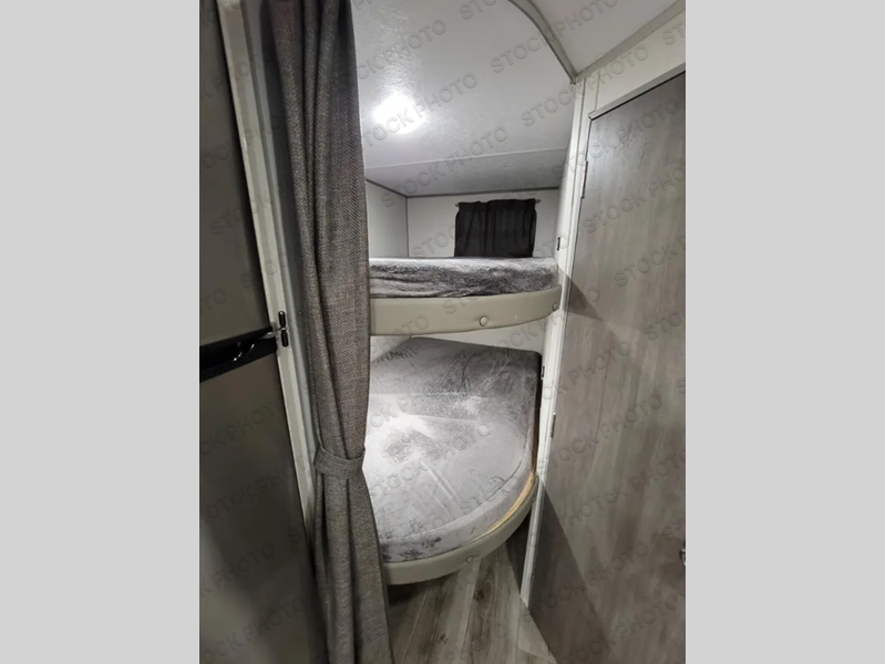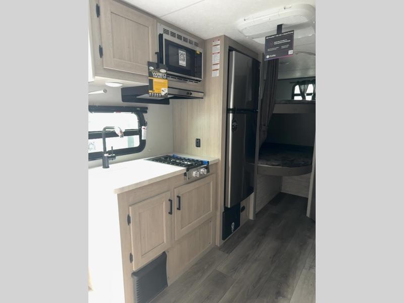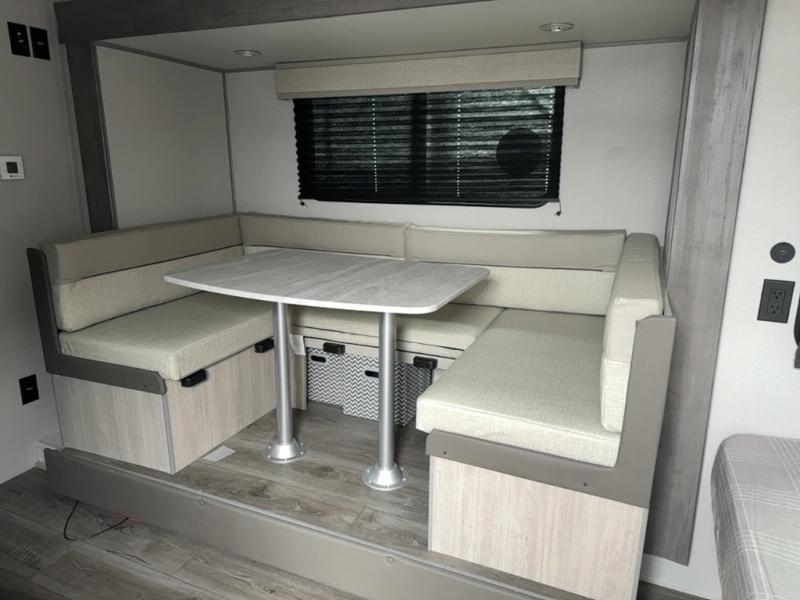 This spacious travel trailer can sleep eight campers each night thanks to the double-size bunks in the back, the U-shaped dinette within the slide out, and the queen bed up front! You can easily make meals for your crew with the two burner cooktop and microwave oven, and leftovers can go in the 10.7 cu. ft. 12V refrigerator! After you've cleaned up in the full bath, head outdoors to relax under the 15' power awning with multicolor LED lights and a remote!
