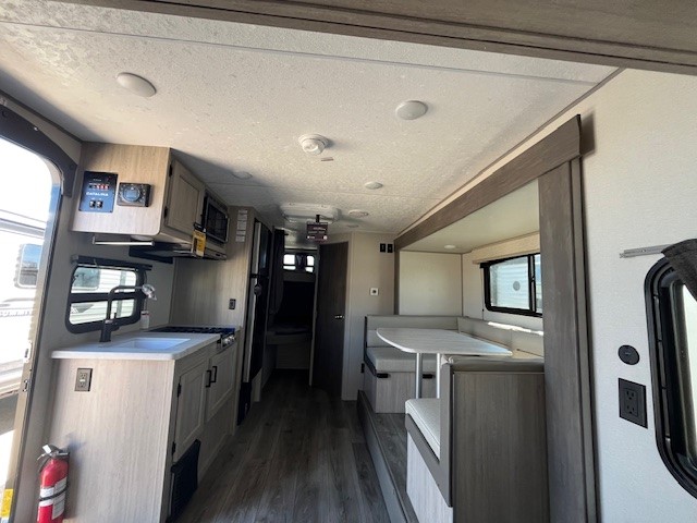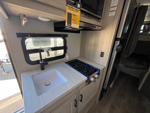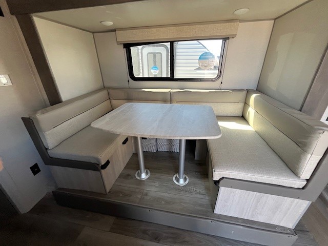 This spacious travel trailer can sleep eight campers each night thanks to the double-size bunks in the back, the U-shaped dinette within the slide out, and the queen bed up front! You can easily make meals for your crew with the two burner cooktop and microwave oven, and leftovers can go in the 10.7 cu. ft. 12V refrigerator! After you've cleaned up in the full bath, head outdoors to relax under the 15' power awning with multicolor LED lights and a remote!