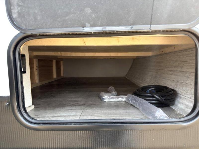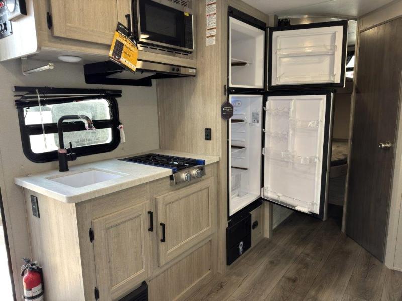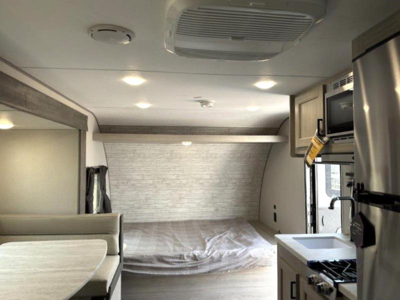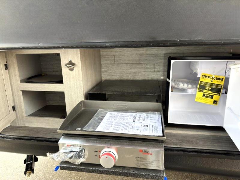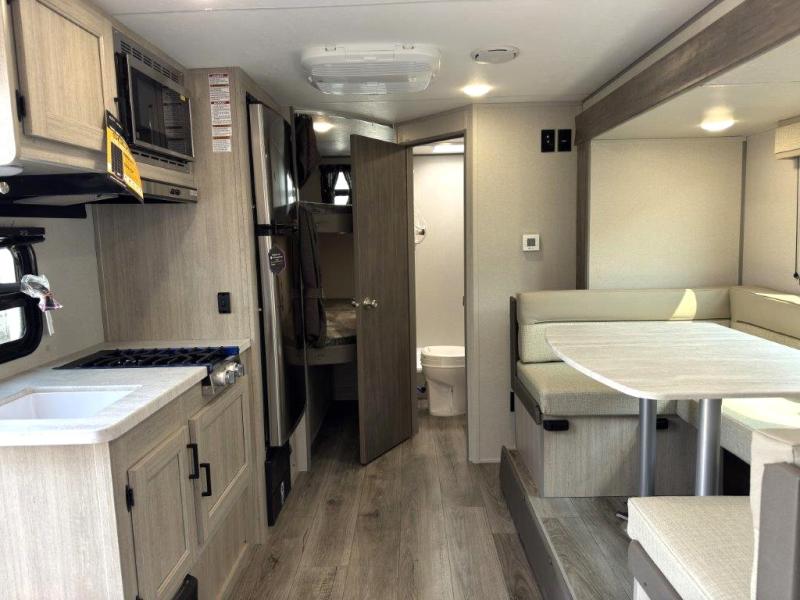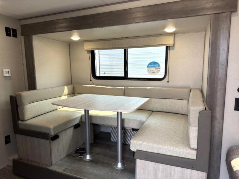 This spacious travel trailer can sleep eight campers each night thanks to the double-size bunks in the back, the U-shaped dinette within the slide out, and the queen bed up front! You can easily make meals for your crew with the two burner cooktop and microwave oven, and leftovers can go in the 10.7 cu. ft. 12V refrigerator! After you've cleaned up in the full bath, head outdoors to relax under the 15' power awning with multicolor LED lights and a remote!
