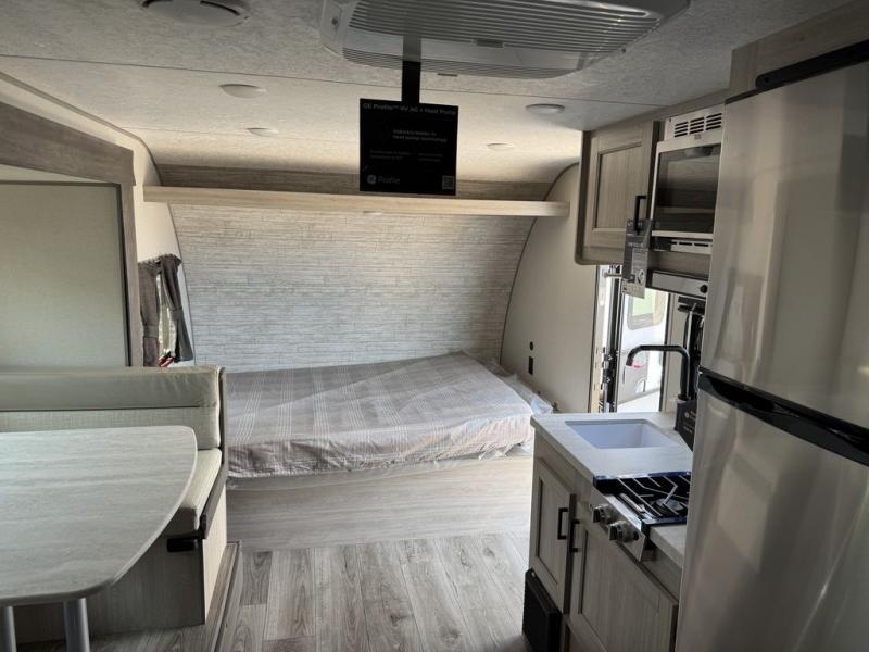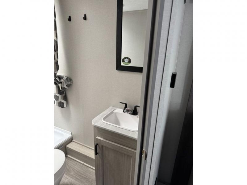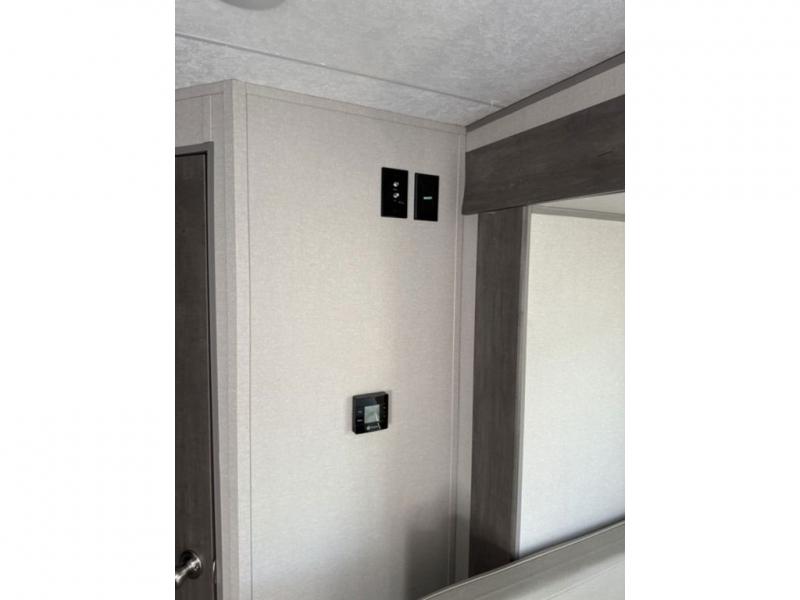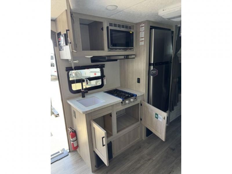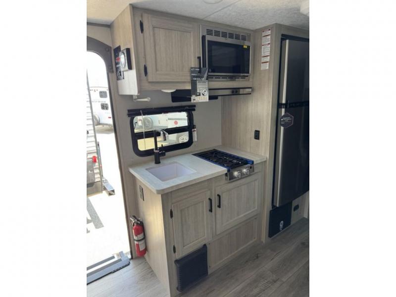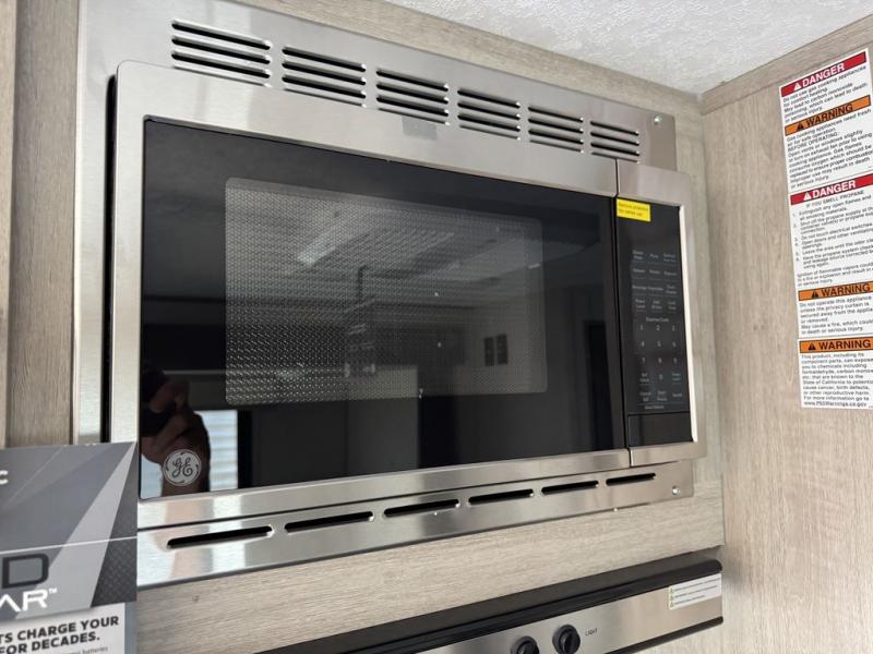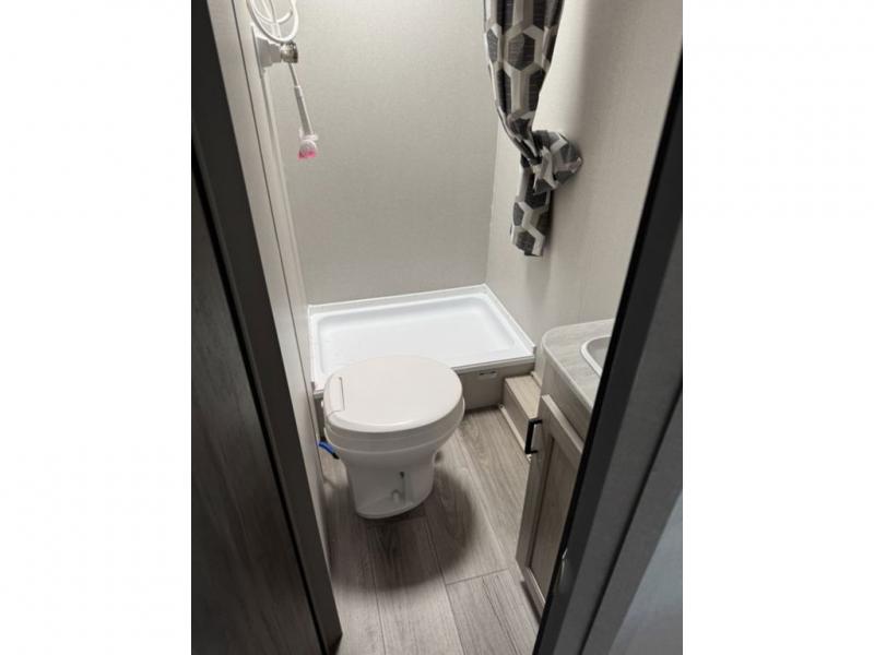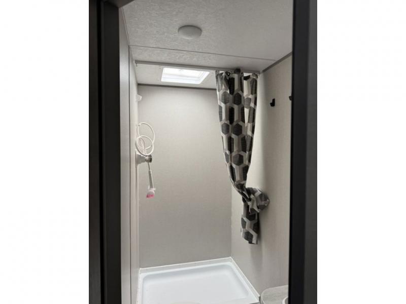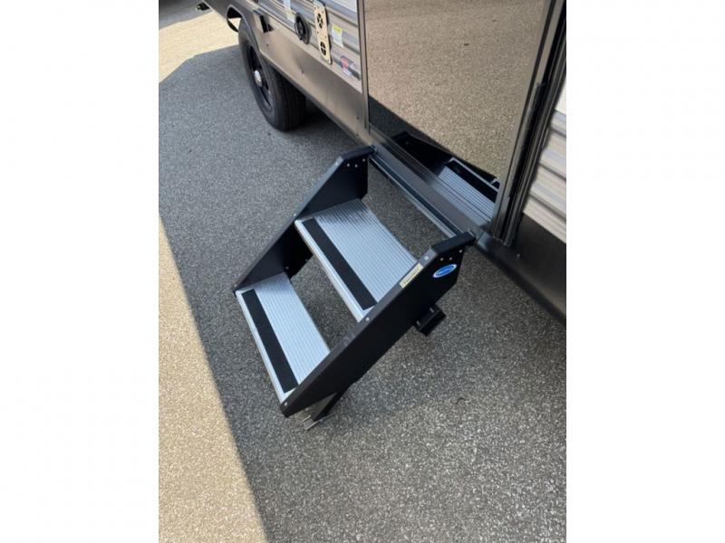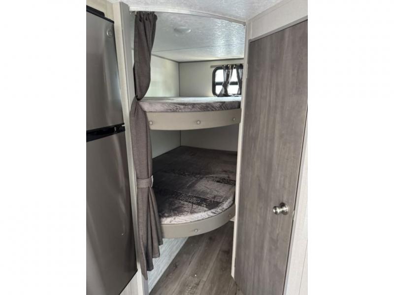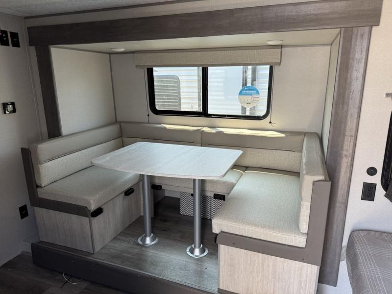 This spacious travel trailer can sleep eight campers each night thanks to the double-size bunks in the back, the U-shaped dinette within the slide out, and the queen bed up front! You can easily make meals for your crew with the two burner cooktop and microwave oven, and leftovers can go in the 10.7 cu. ft. 12V refrigerator! After you've cleaned up in the full bath, head outdoors to relax under the 15' power awning with multicolor LED lights and a remote!