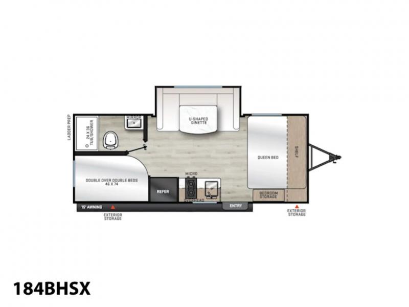This spacious travel trailer can sleep eight campers each night thanks to the double-size bunks in the back, the U-shaped dinette within the slide out, and the queen bed up front! You can easily make meals for your crew with the two burner cooktop and microwave oven, and leftovers can go in the 10.7 cu. ft. 12V refrigerator! After you've cleaned up in the full bath, head outdoors to relax under the 15' power awning with multicolor LED lights and a remote!