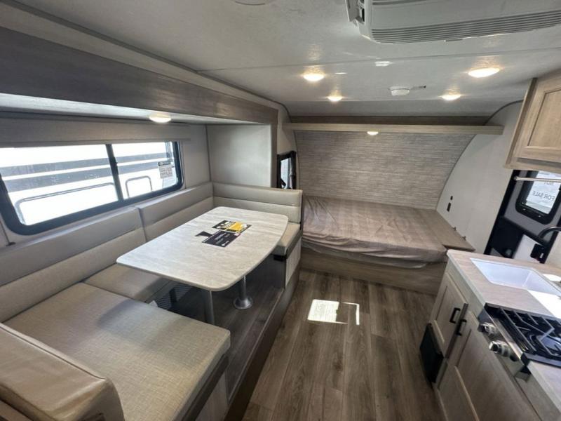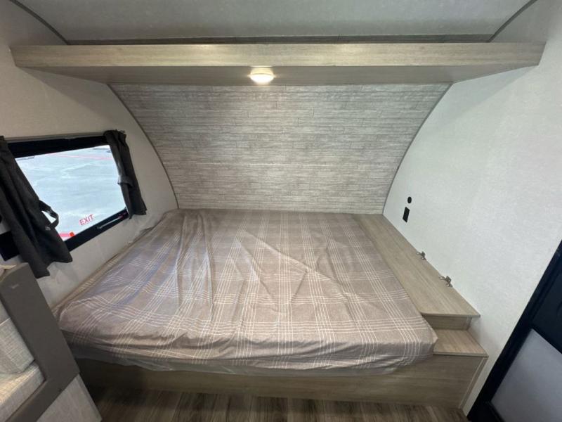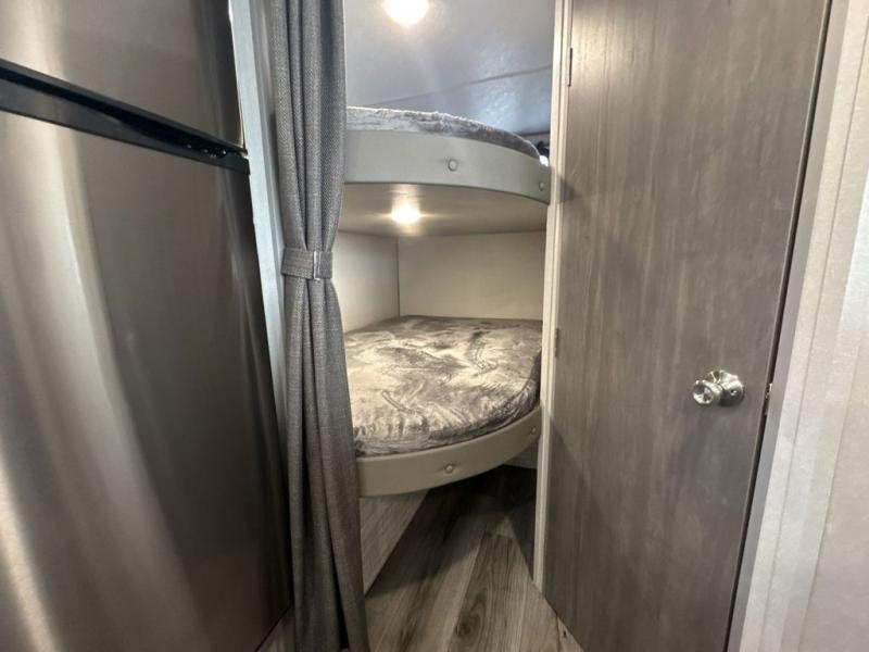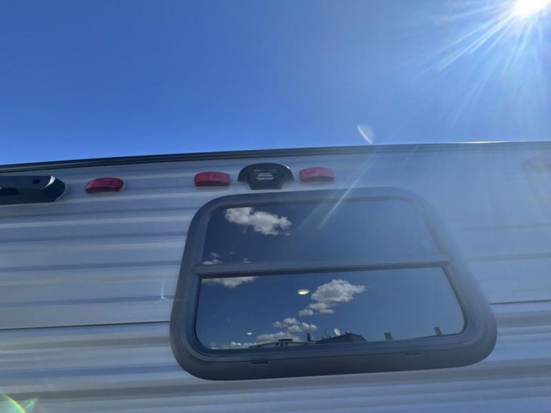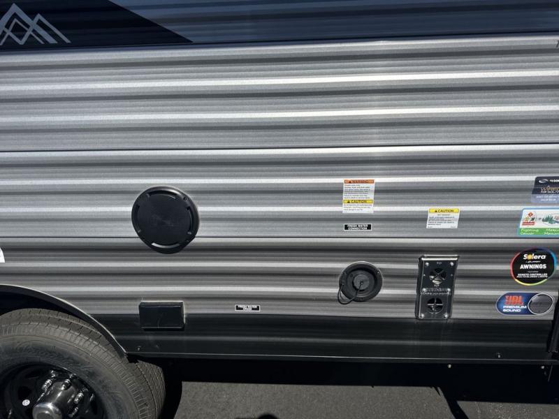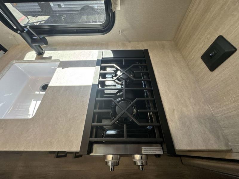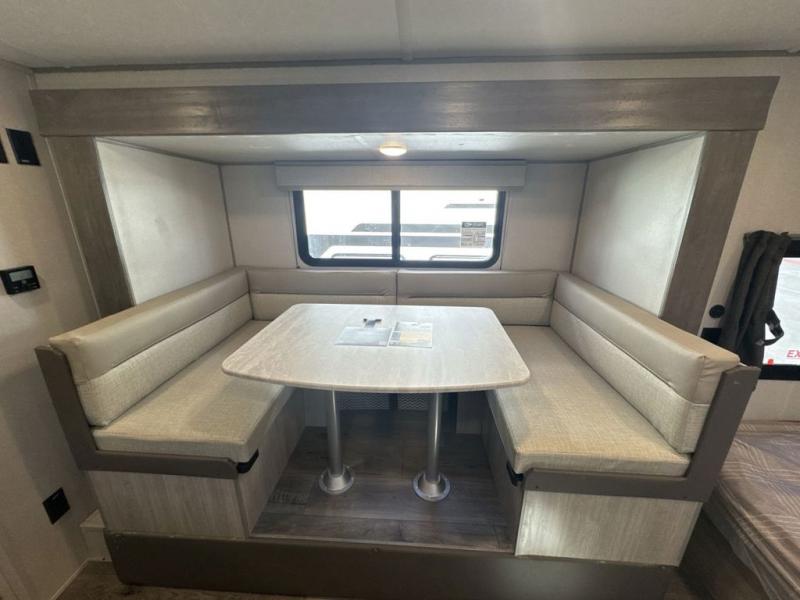 This spacious travel trailer can sleep eight campers each night thanks to the double-size bunks in the back, the U-shaped dinette within the slide out, and the queen bed up front! You can easily make meals for your crew with the two burner cooktop and microwave oven, and leftovers can go in the 10.7 cu. ft. 12V refrigerator! After you've cleaned up in the full bath, head outdoors to relax under the 15' power awning with multicolor LED lights and a remote!