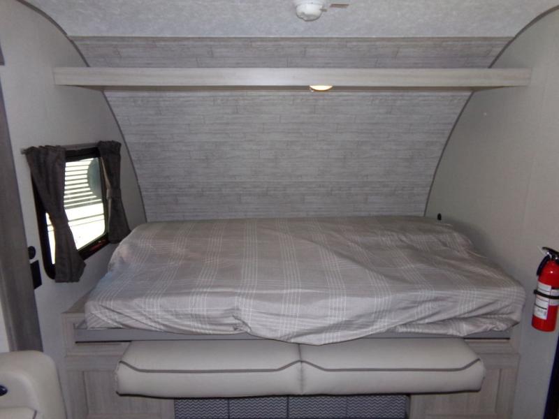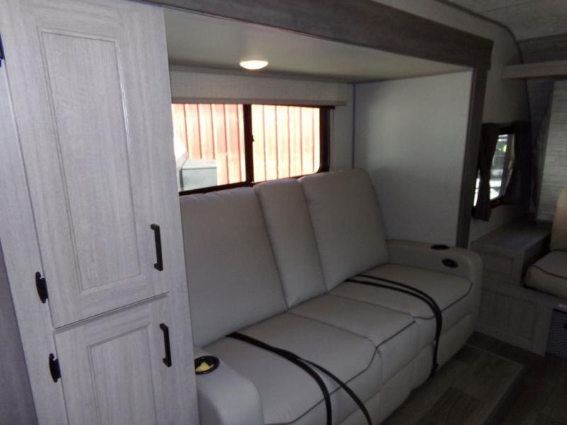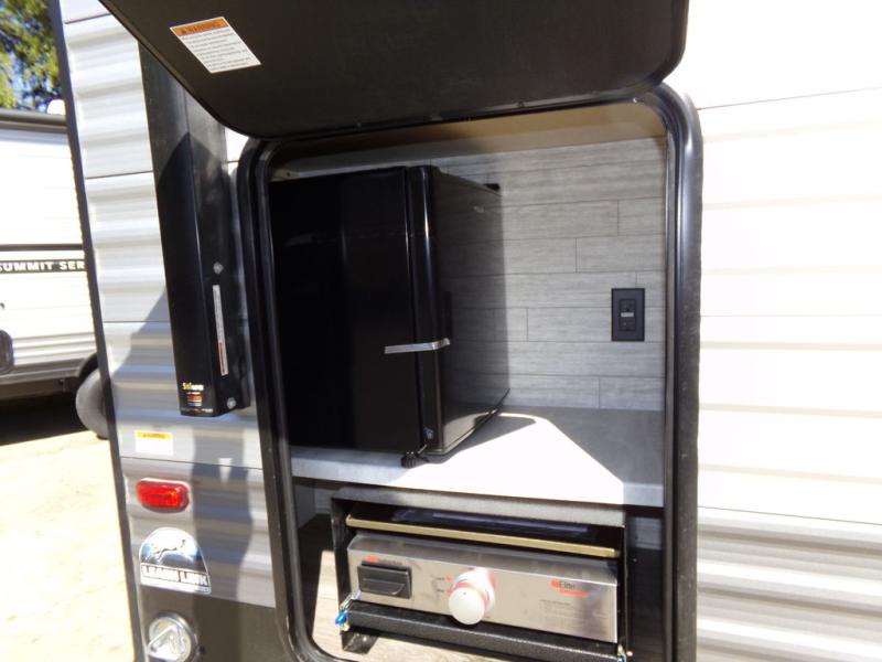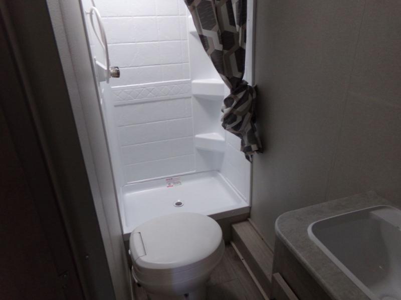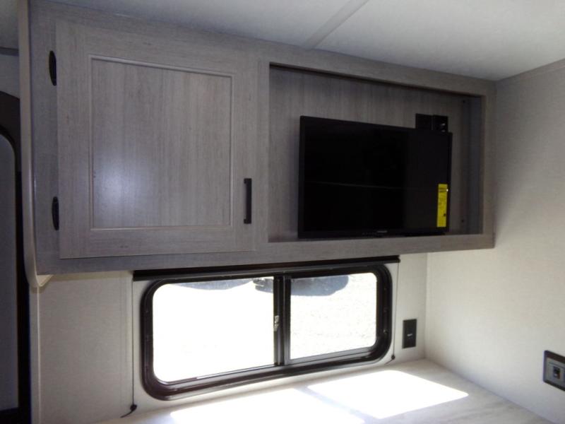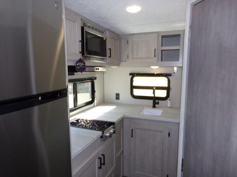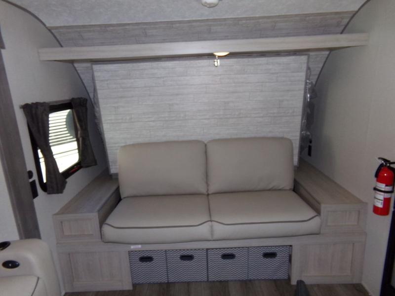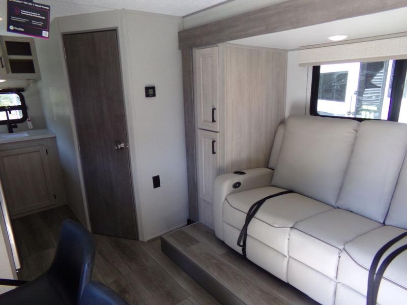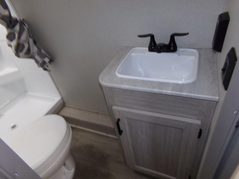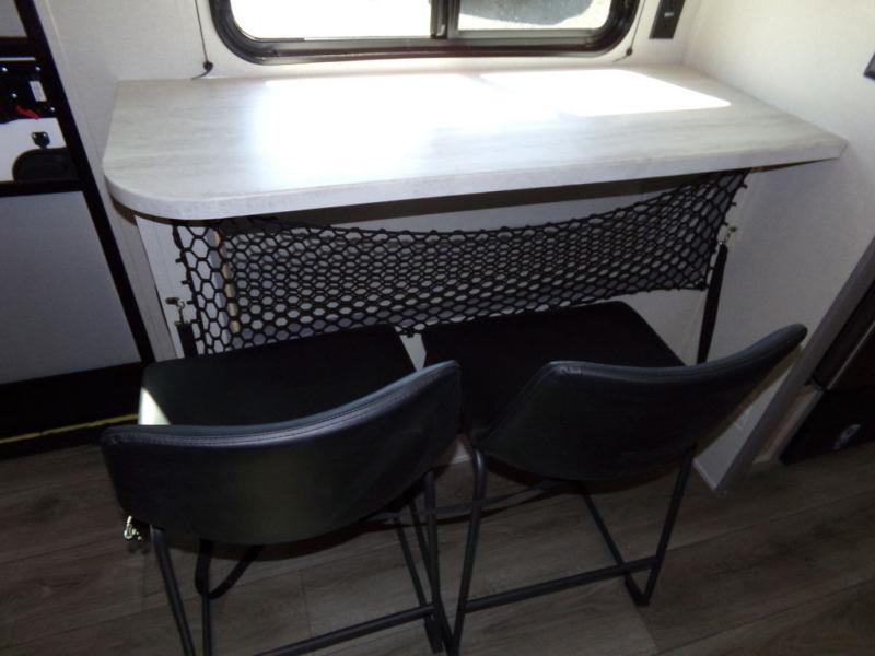 You will love the versatility of this trailer thanks to the Murphy bed and camper kitchen! During the day, with the Murphy bed folded up, you will have plenty of relaxing space with a 60" Jackknife sofa including overhead storage for your things. There is also a slide with theater seating, and a bar top to the left of the entry door with two stools. A rear corner kitchen features everything you need to cook indoors, or you can head outside to use the outdoor Camper Kitchen with mini fridge and griddle. A rear corner bath features a 24" x 32" shower, toilet and sink, plus linen storage as well. Outside, you'll find a 15' power awning with multicolor LED lights and exterior storage for camp gear.