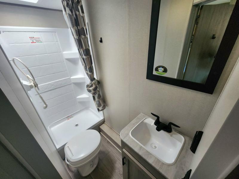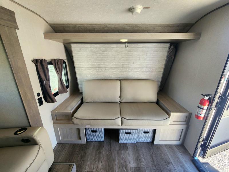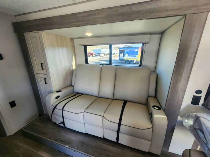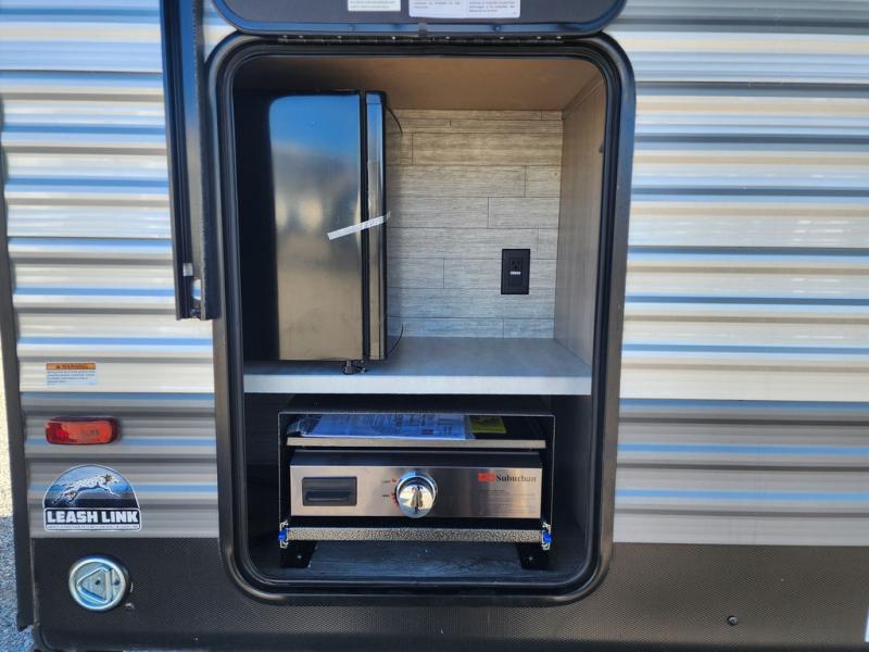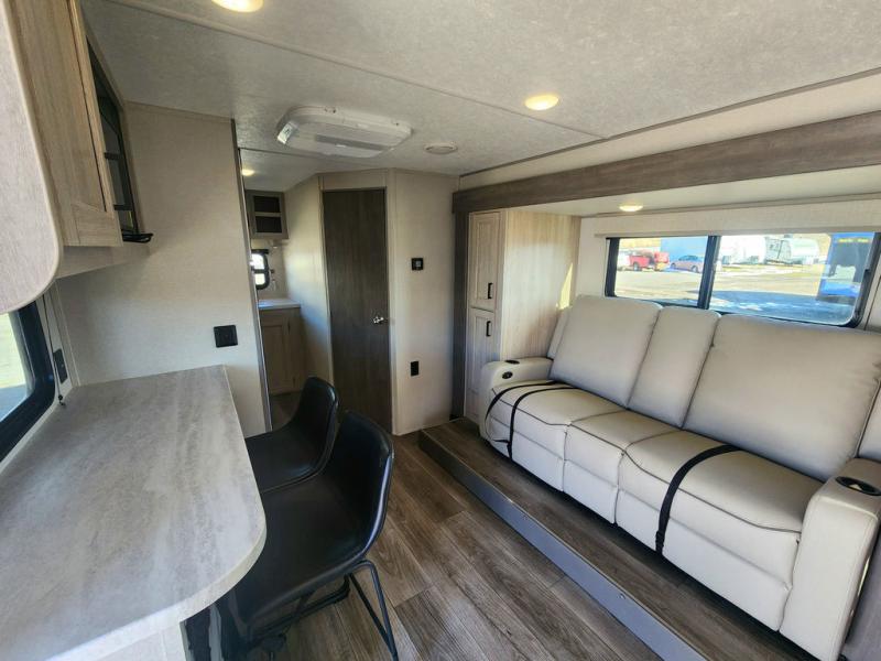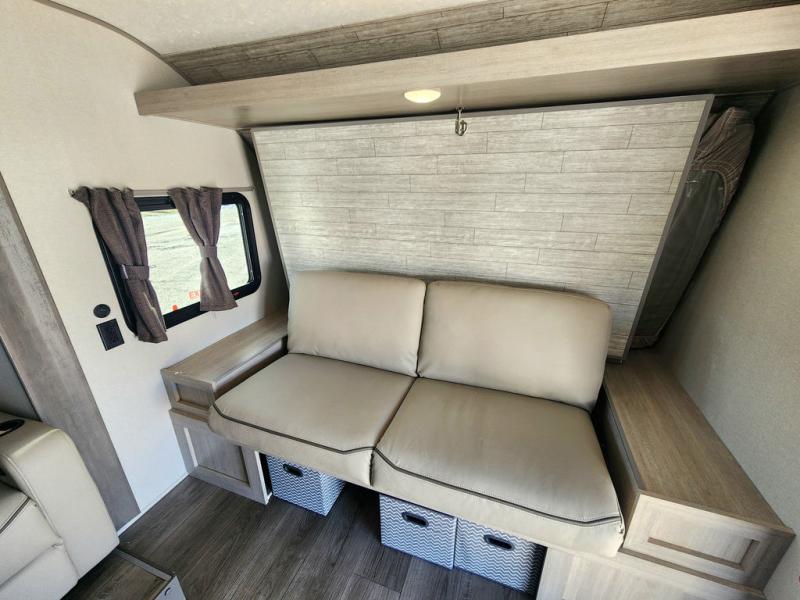 You will love the versatility of this trailer thanks to the Murphy bed and camper kitchen! During the day, with the Murphy bed folded up, you will have plenty of relaxing space with a 60" Jackknife sofa including overhead storage for your things. There is also a slide with theater seating, and a bar top to the left of the entry door with two stools. A rear corner kitchen features everything you need to cook indoors, or you can head outside to use the outdoor Camper Kitchen with mini fridge and griddle. A rear corner bath features a 24" x 32" shower, toilet and sink, plus linen storage as well. Outside, you'll find a 15' power awning with multicolor LED lights and exterior storage for camp gear.