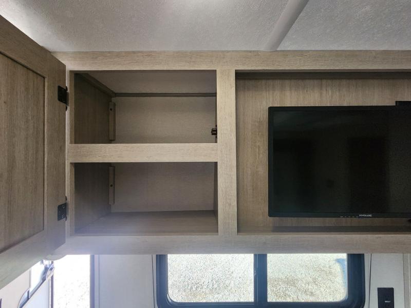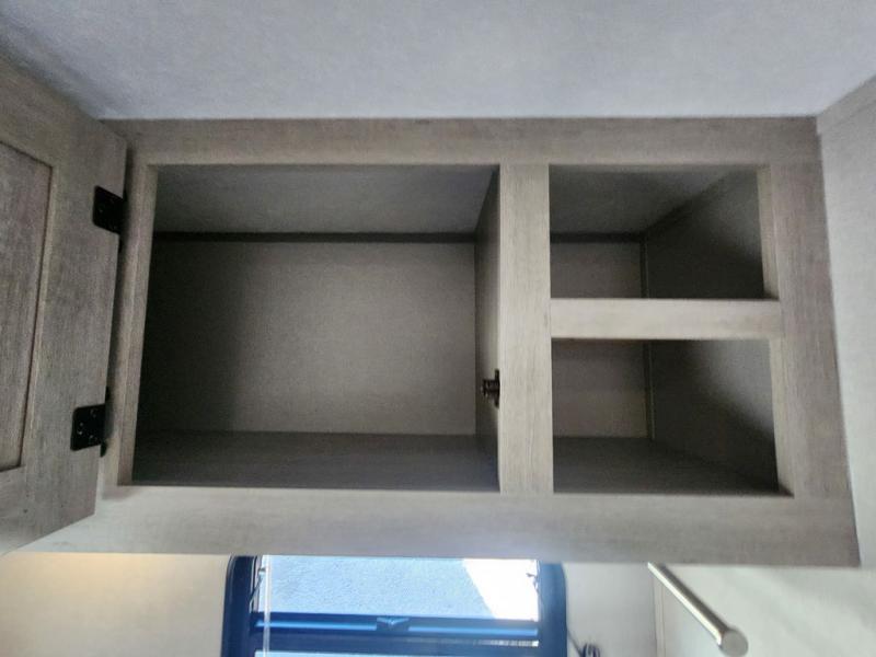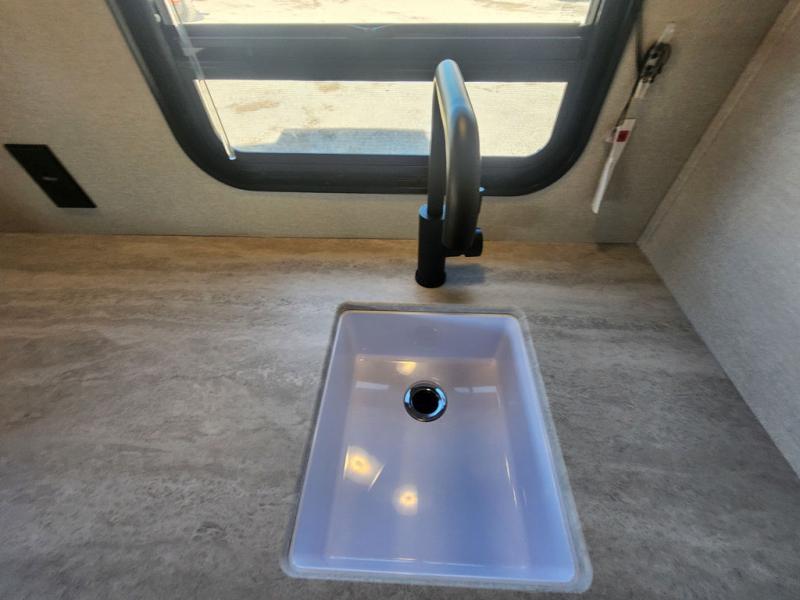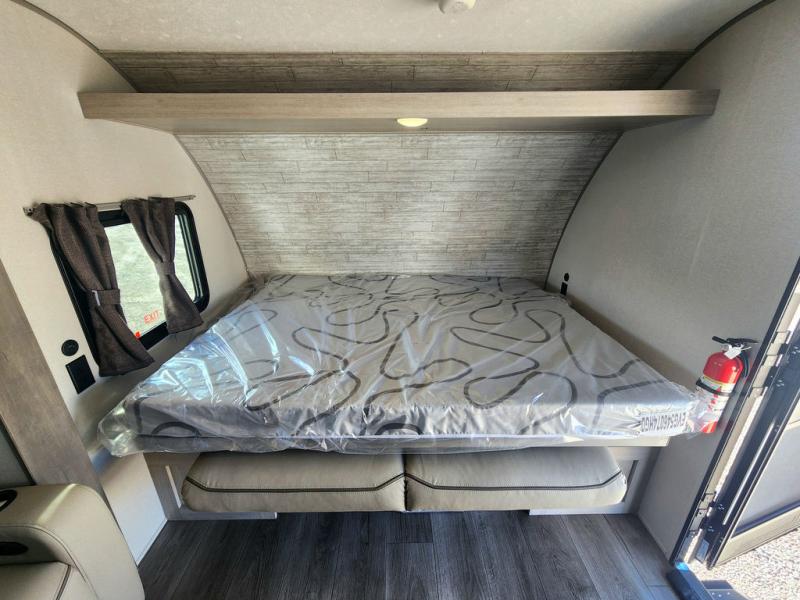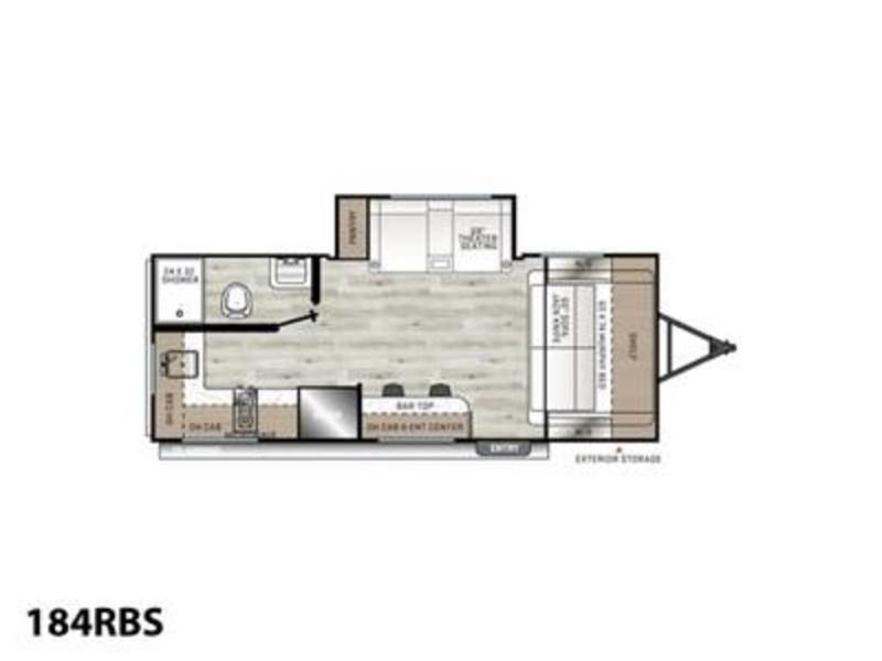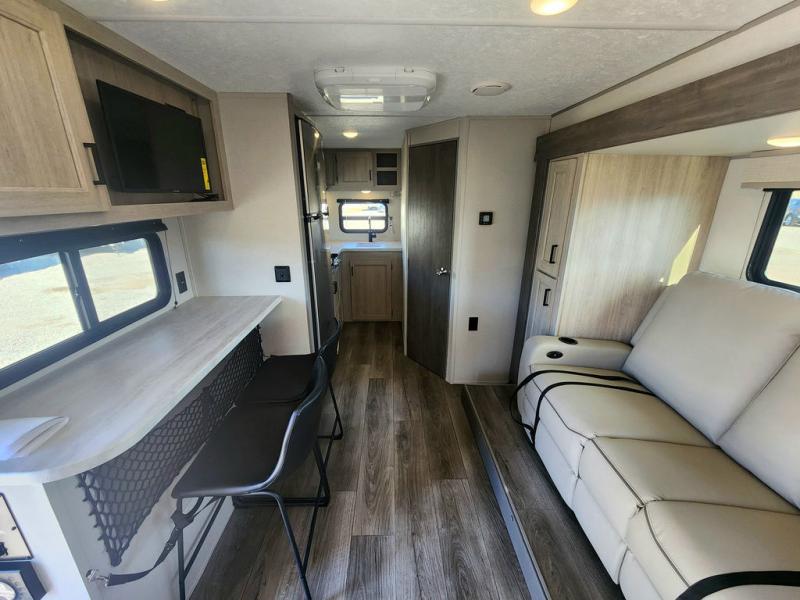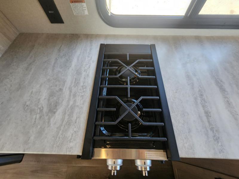 You will love the versatility of this trailer thanks to the Murphy bed and camper kitchen! During the day, with the Murphy bed folded up, you will have plenty of relaxing space with a 60" Jackknife sofa including overhead storage for your things. There is also a slide with theater seating, and a bar top to the left of the entry door with two stools. A rear corner kitchen features everything you need to cook indoors, or you can head outside to use the outdoor Camper Kitchen with mini fridge and griddle. A rear corner bath features a 24" x 32" shower, toilet and sink, plus linen storage as well. Outside, you'll find a 15' power awning with multicolor LED lights and exterior storage for camp gear.