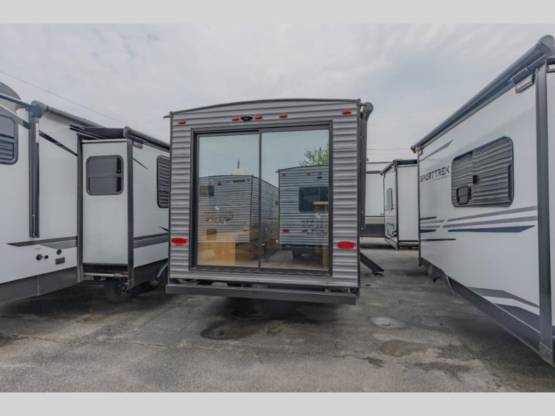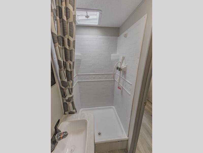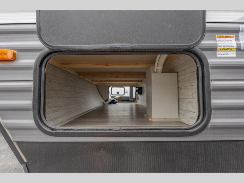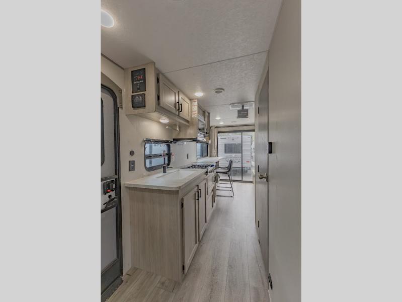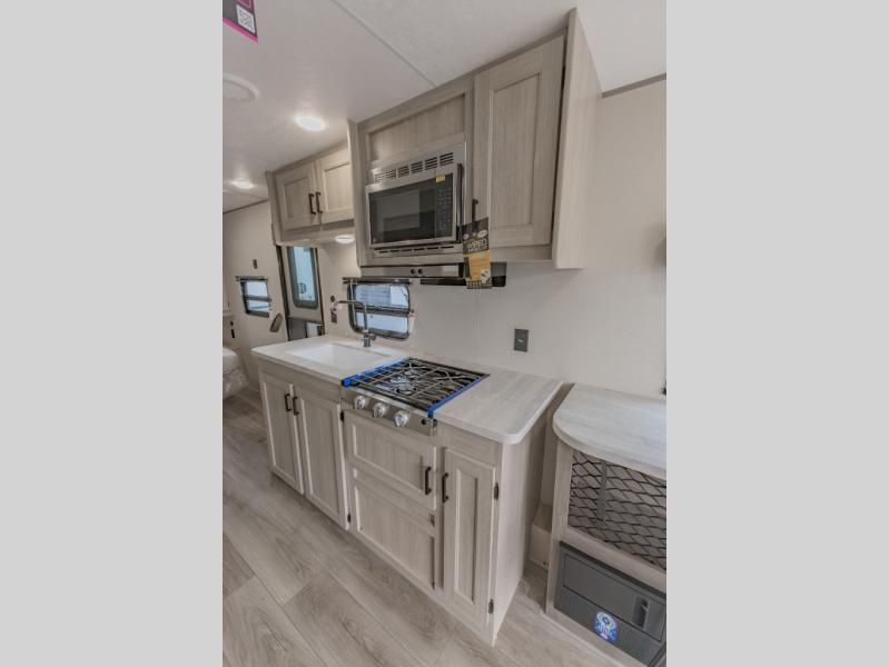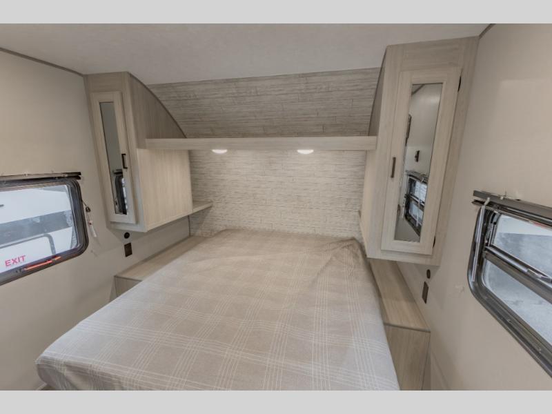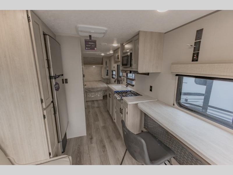 If you are looking for comfort this travel trailer is the one for you due to the amazing front bedroom. Have a relaxing time on the queen bed, which has dual bedside wardrobes and an overhead shelf perfect for storing all your belongings. Moving to the living room, you can take a rest on the 60" sofa jack knife or if you prefer, have a drink or two on the bar top for those hot days. Also for days where the temperature rises, take a refreshing bath in the full bathroom. Finally, this model has an optional 38" dinette, ideal to share your everyday meals with your loved ones.