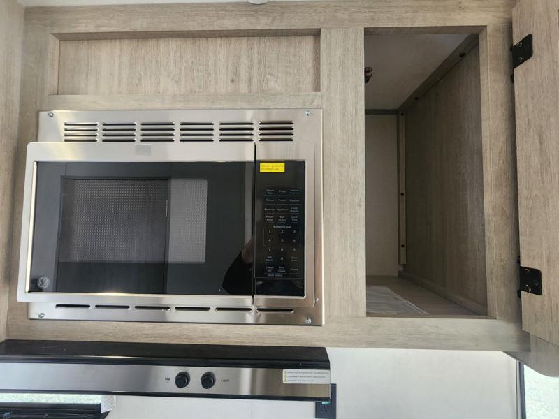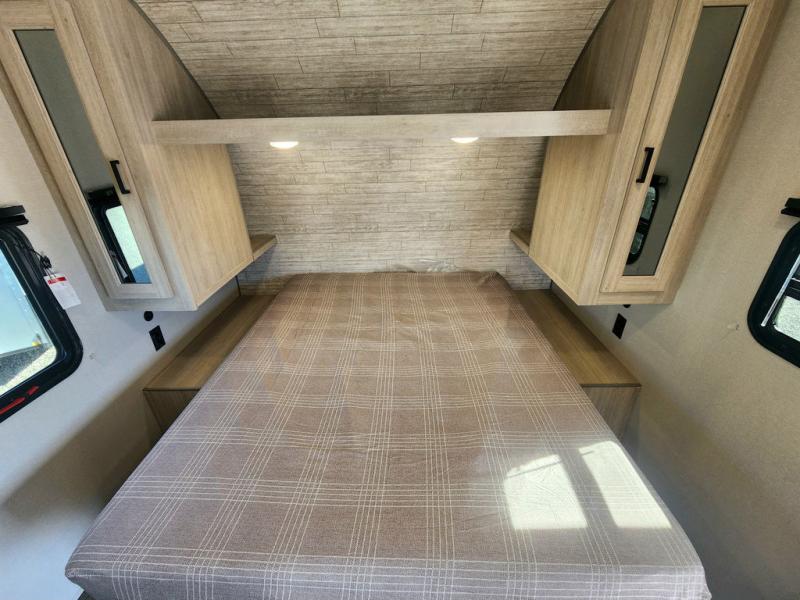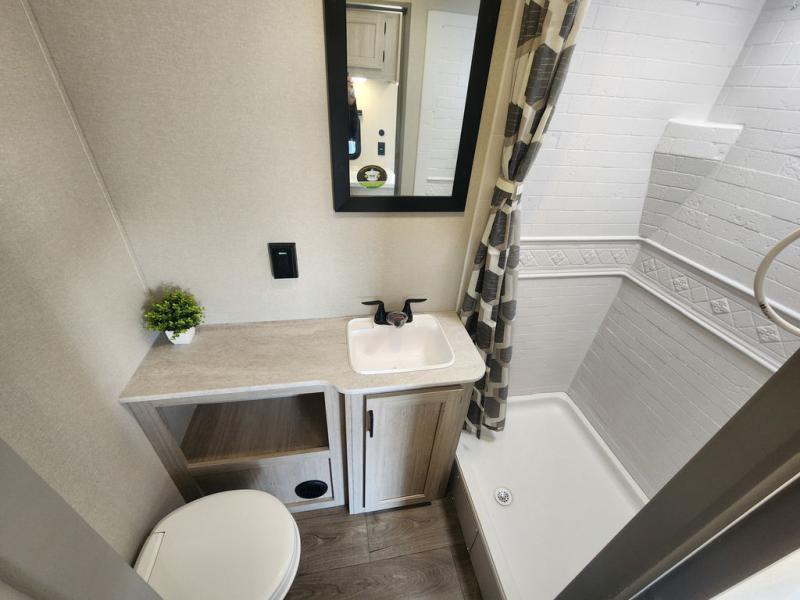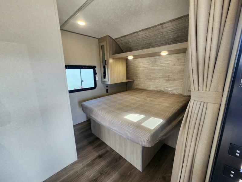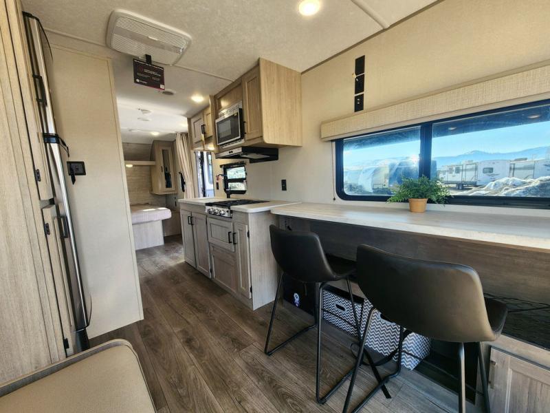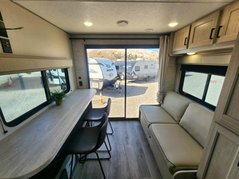 If you are looking for comfort this travel trailer is the one for you due to the amazing front bedroom. Have a relaxing time on the queen bed, which has dual bedside wardrobes and an overhead shelf perfect for storing all your belongings. Moving to the living room, you can take a rest on the 60" sofa jack knife or if you prefer, have a drink or two on the bar top for those hot days. Also for days where the temperature rises, take a refreshing bath in the full bathroom. Finally, this model has an optional 38" dinette, ideal to share your everyday meals with your loved ones.