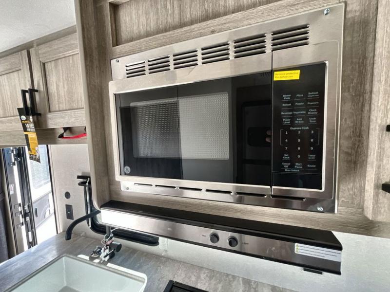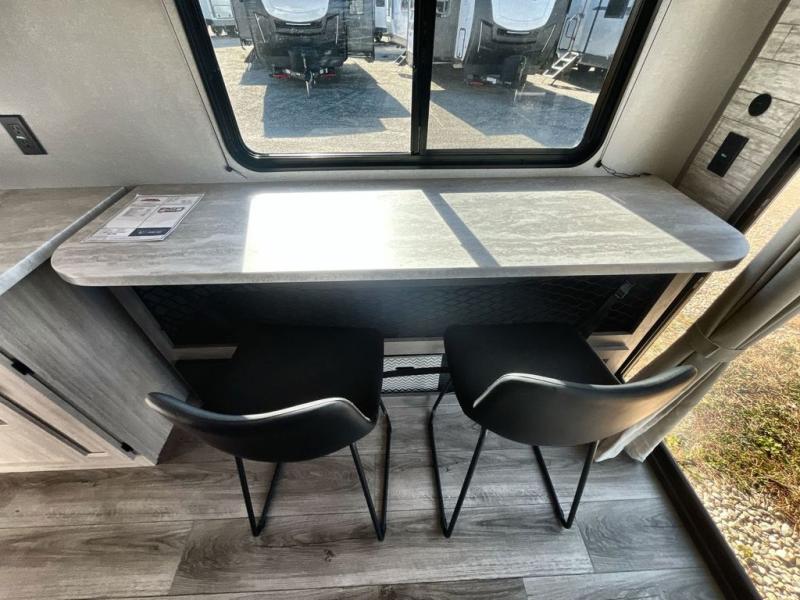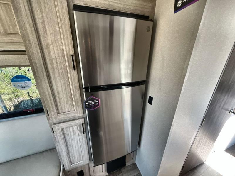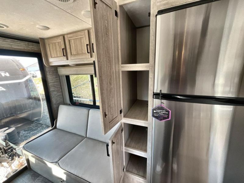 If you are looking for comfort this travel trailer is the one for you due to the amazing front bedroom. Have a relaxing time on the queen bed, which has dual bedside wardrobes and an overhead shelf perfect for storing all your belongings. Moving to the living room, you can take a rest on the 60" sofa jack knife or if you prefer, have a drink or two on the bar top for those hot days. Also for days where the temperature rises, take a refreshing bath in the full bathroom. Finally, this model has an optional 38" dinette, ideal to share your everyday meals with your loved ones.