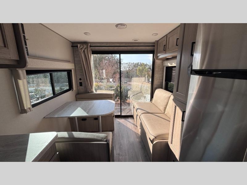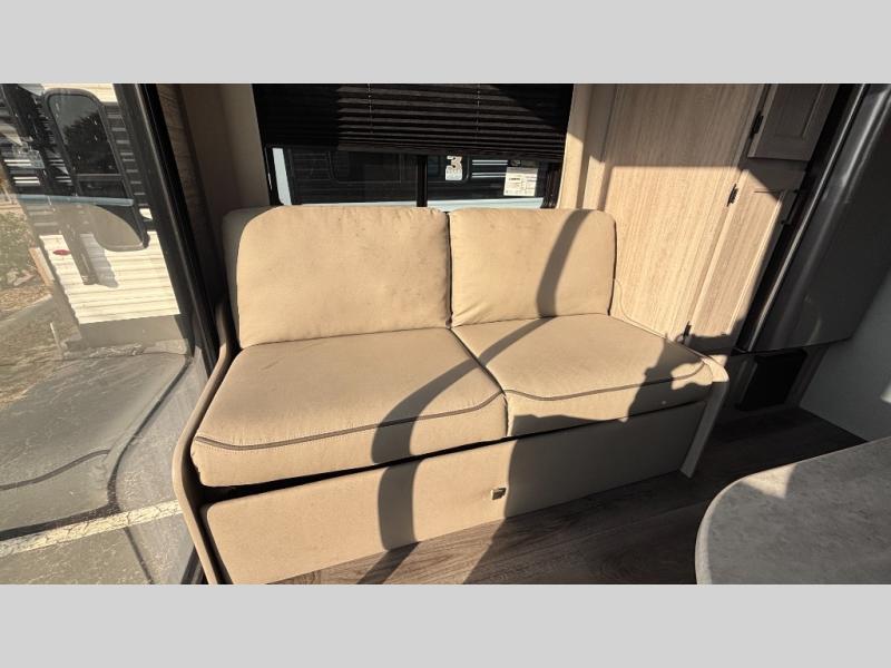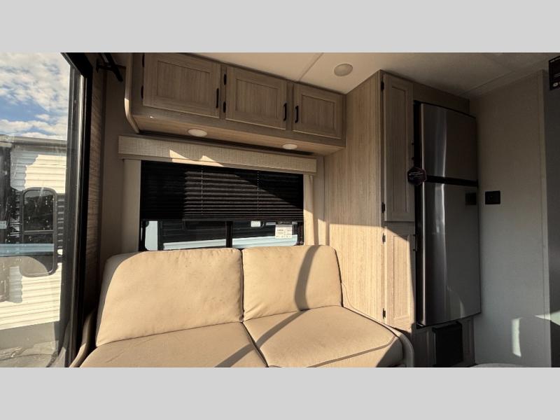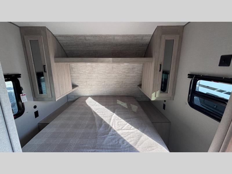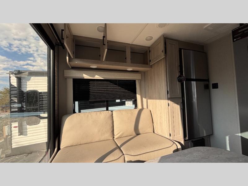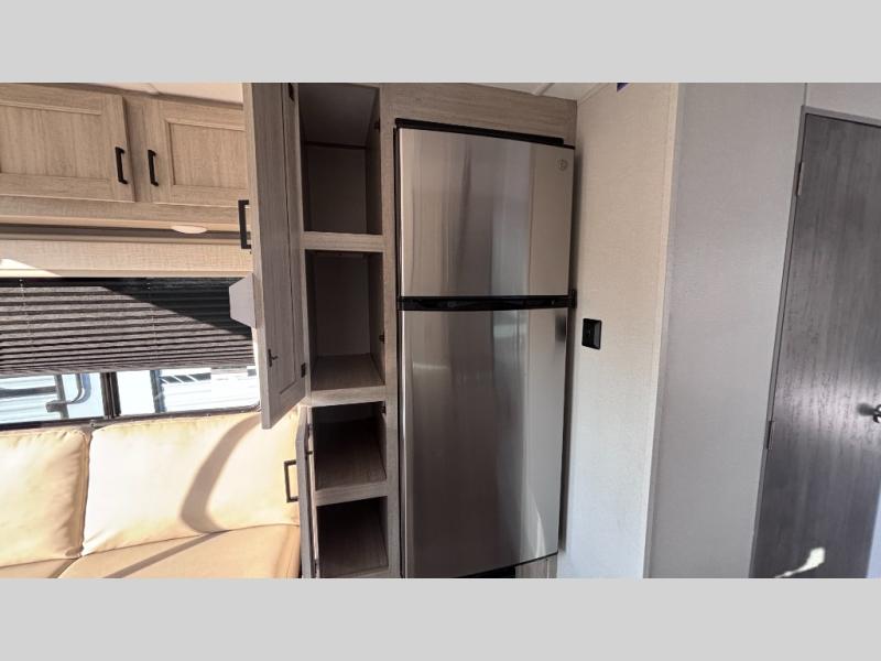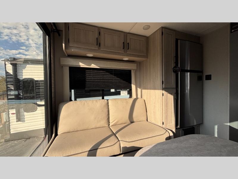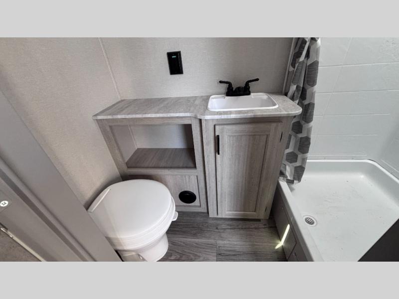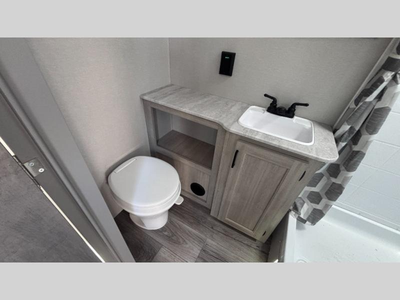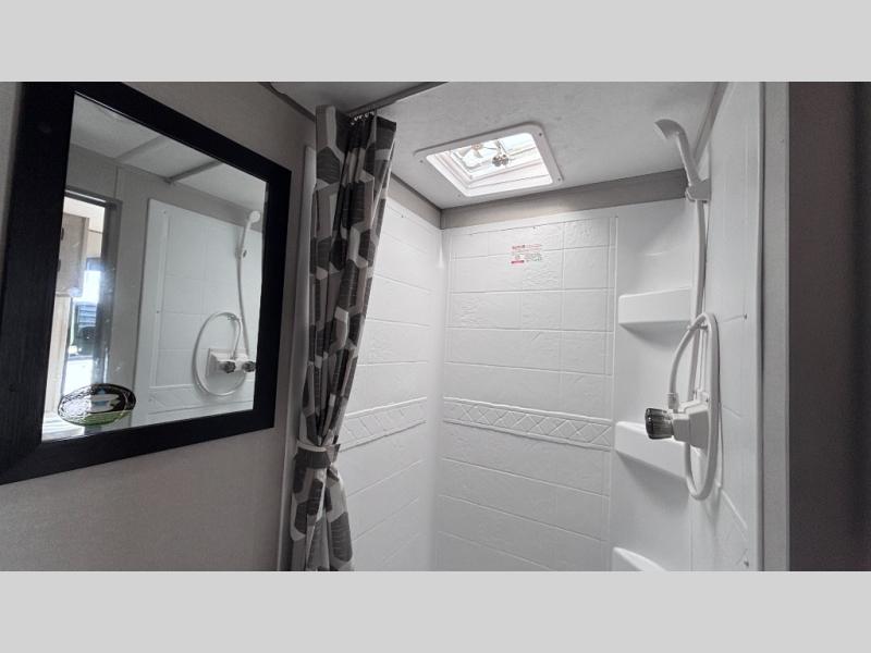 If you are looking for comfort this travel trailer is the one for you due to the amazing front bedroom. Have a relaxing time on the queen bed, which has dual bedside wardrobes and an overhead shelf perfect for storing all your belongings. Moving to the living room, you can take a rest on the 60" sofa jack knife or if you prefer, have a drink or two on the bar top for those hot days. Also for days where the temperature rises, take a refreshing bath in the full bathroom. Finally, this model has an optional 38" dinette, ideal to share your everyday meals with your loved ones.