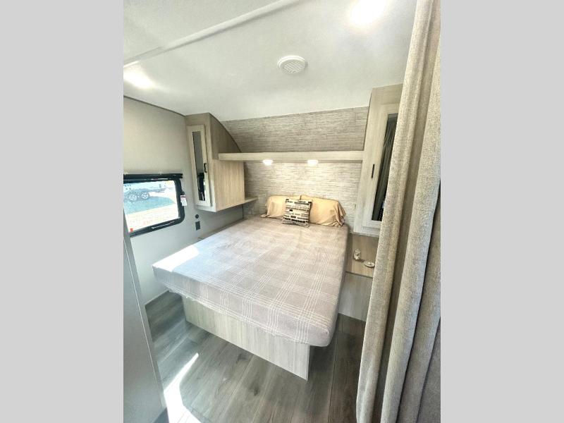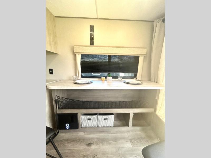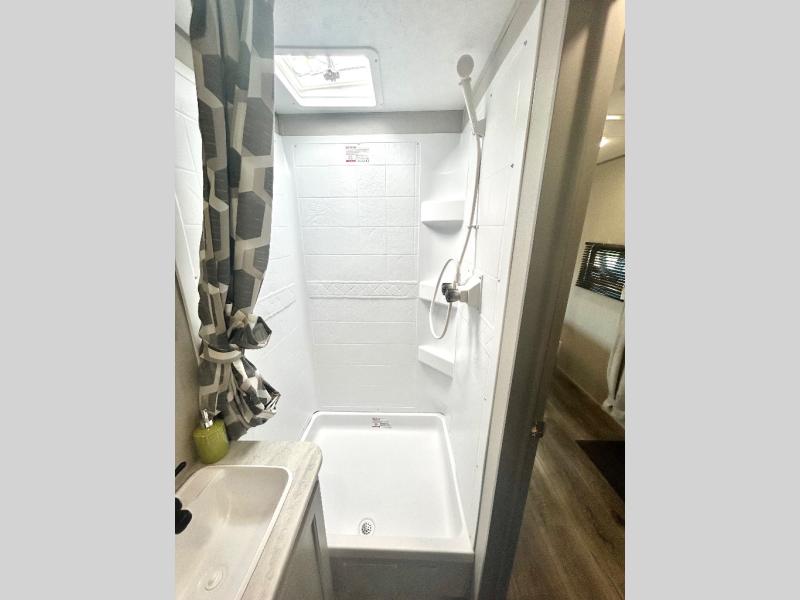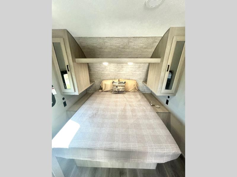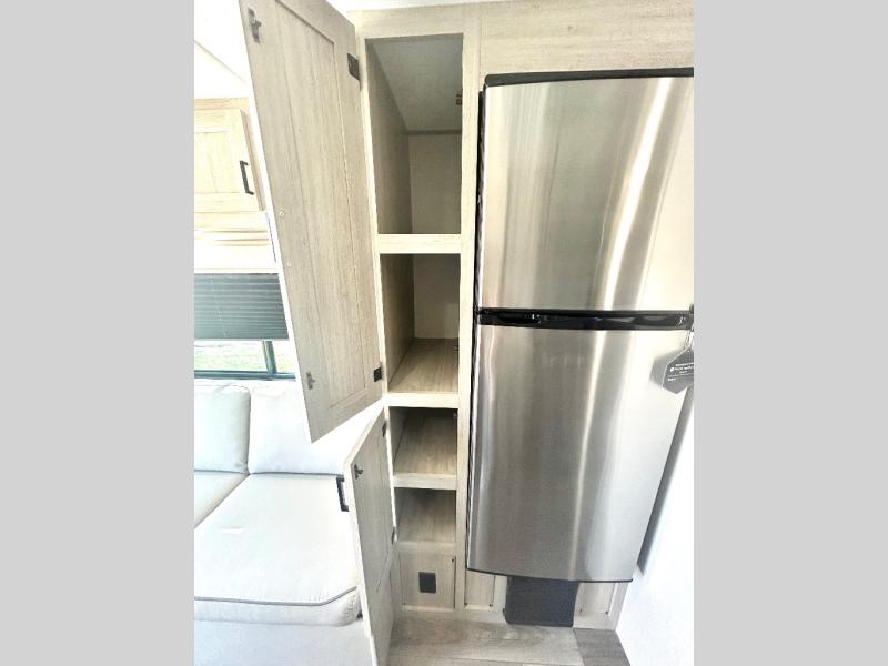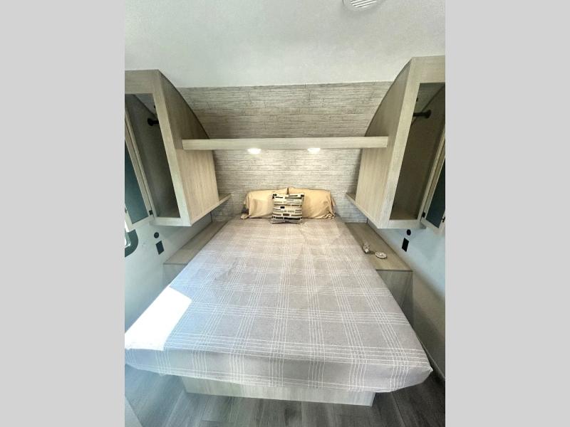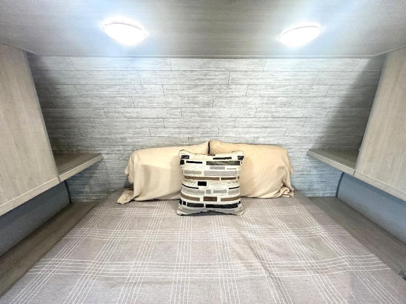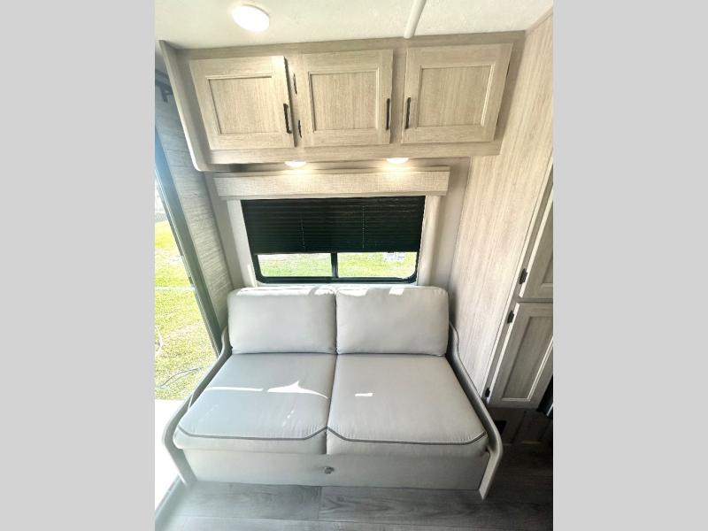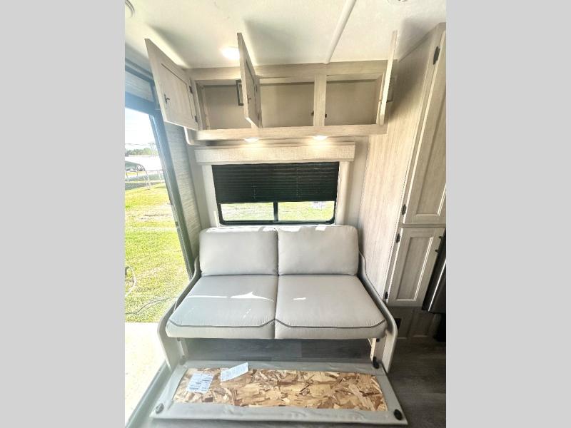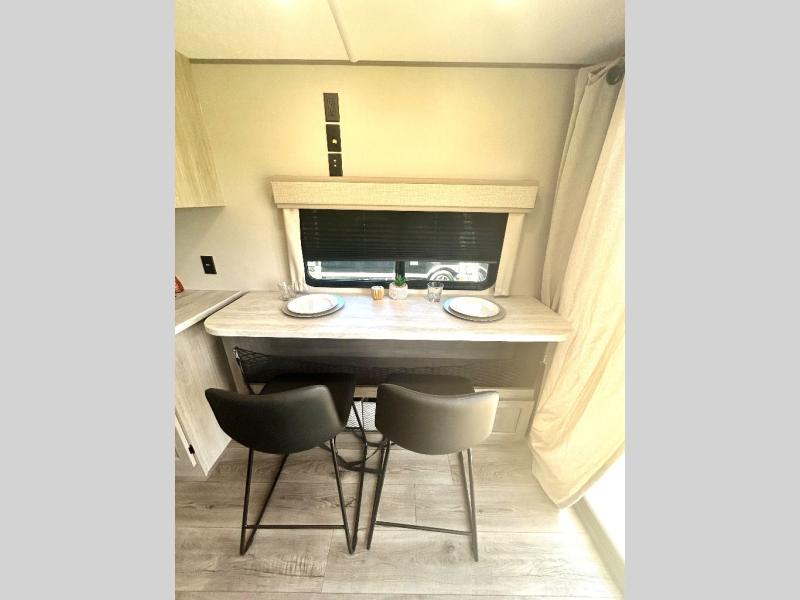 If you are looking for comfort this travel trailer is the one for you due to the amazing front bedroom. Have a relaxing time on the queen bed, which has dual bedside wardrobes and an overhead shelf perfect for storing all your belongings. Moving to the living room, you can take a rest on the 60" sofa jack knife or if you prefer, have a drink or two on the bar top for those hot days. Also for days where the temperature rises, take a refreshing bath in the full bathroom. Finally, this model has an optional 38" dinette, ideal to share your everyday meals with your loved ones.