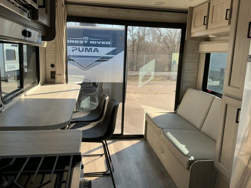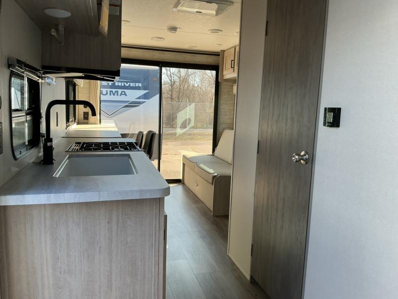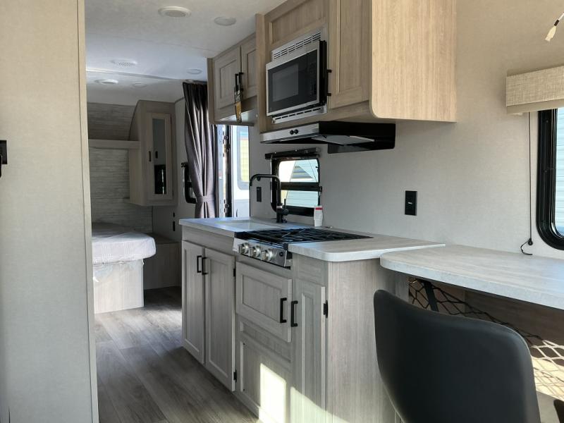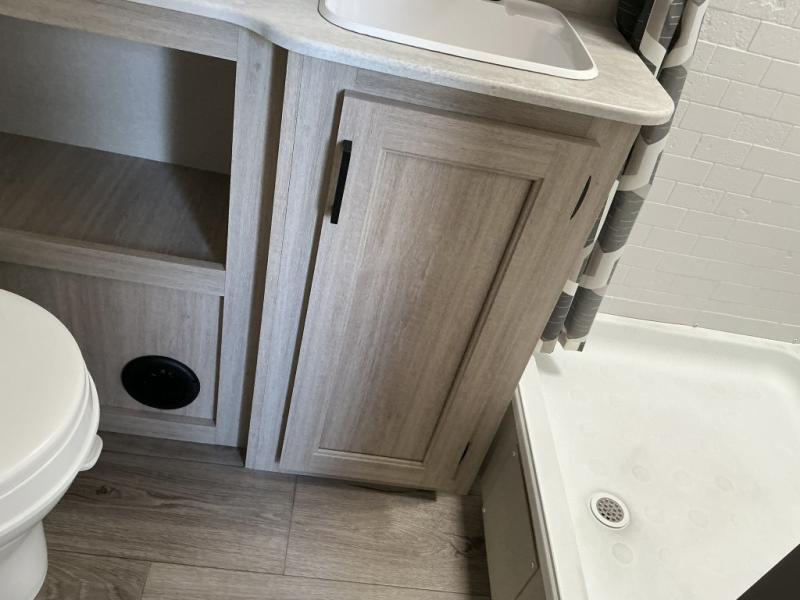 If you are looking for comfort this travel trailer is the one for you due to the amazing front bedroom. Have a relaxing time on the queen bed, which has dual bedside wardrobes and an overhead shelf perfect for storing all your belongings. Moving to the living room, you can take a rest on the 60" sofa jack knife or if you prefer, have a drink or two on the bar top for those hot days. Also for days where the temperature rises, take a refreshing bath in the full bathroom. Finally, this model has an optional 38" dinette, ideal to share your everyday meals with your loved ones.