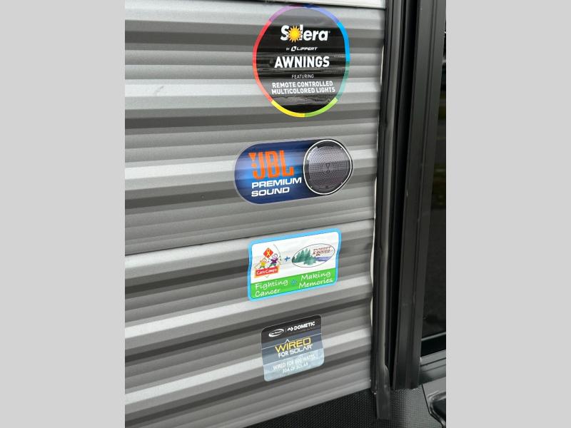 Exterior Amenities: 18 ft electric awning with multicolor LED light strip & remote, pass-through storage, two LP tanks, plenty of windows, tinted privacy glass, etc.