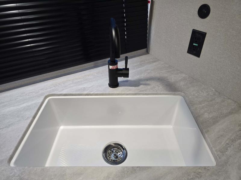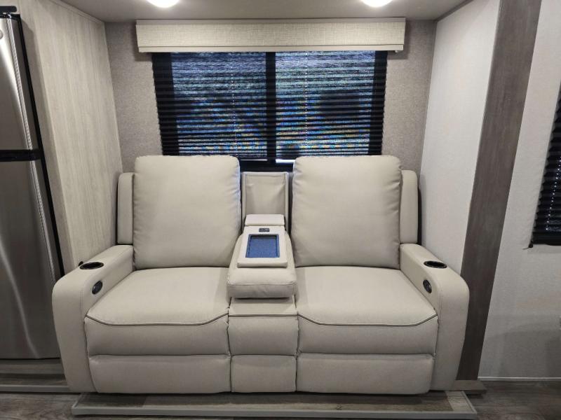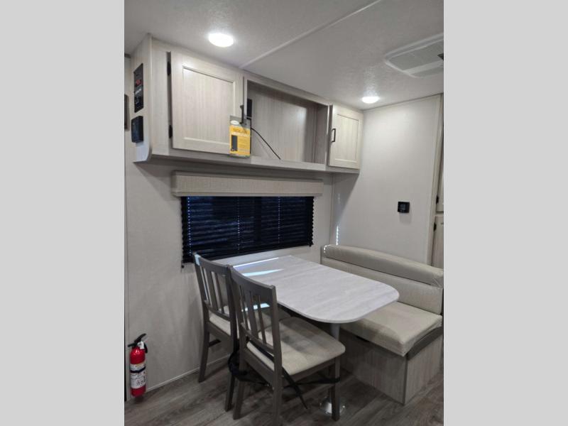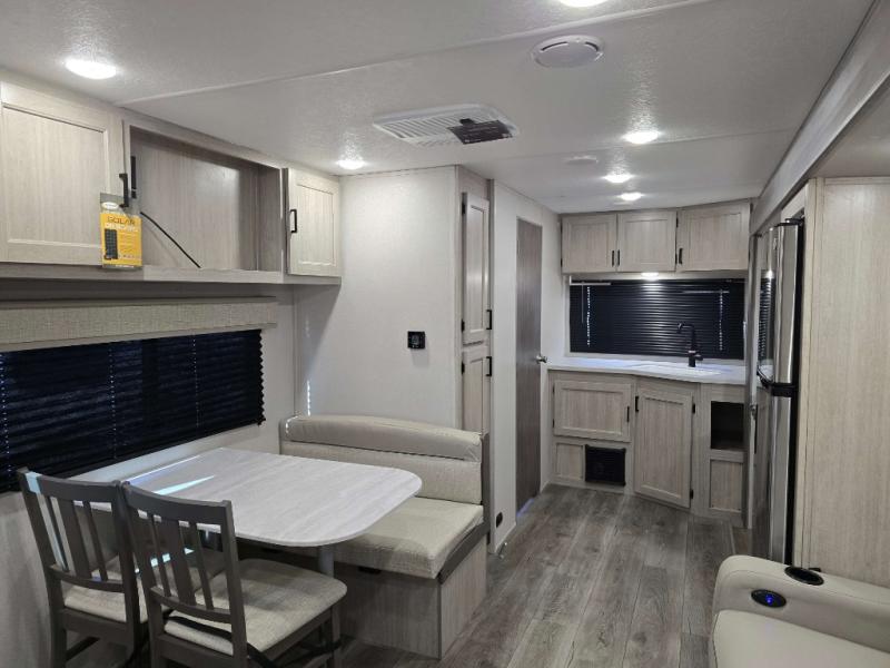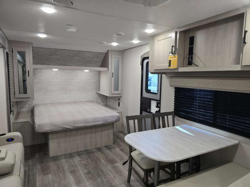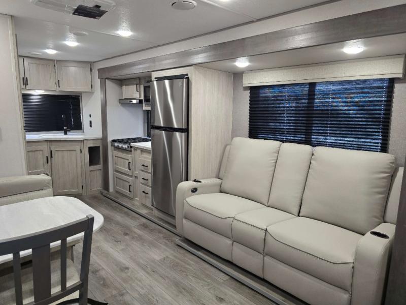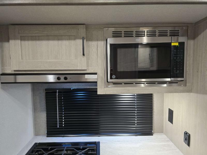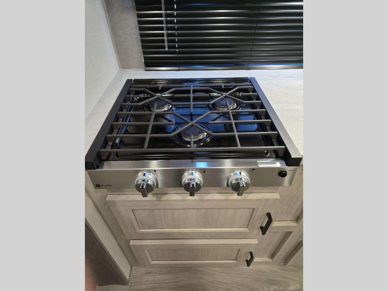 This is the perfect travel trailer for a couple who wants to escape the hustle and bustle of everyday life! The front 60" x 74" queen bed offers a comfortable place to rest your head at night with wardrobes on either side to store your clothes. The 68" theater seating is great for relaxing after a day at the beach, and the dinette with two chairs on one side and bench seating on the other will be perfect to dine around or play games at. The fully equipped kitchen offers all the appliances needed to make all your meals, such as a GE stainless three burner cooktop, a GE stainless microwave, plus a GE stainless 10.7 cu. ft. 12V refrigerator. You can also freshen up in the rear corner bathroom with the 36" x 30 shower!