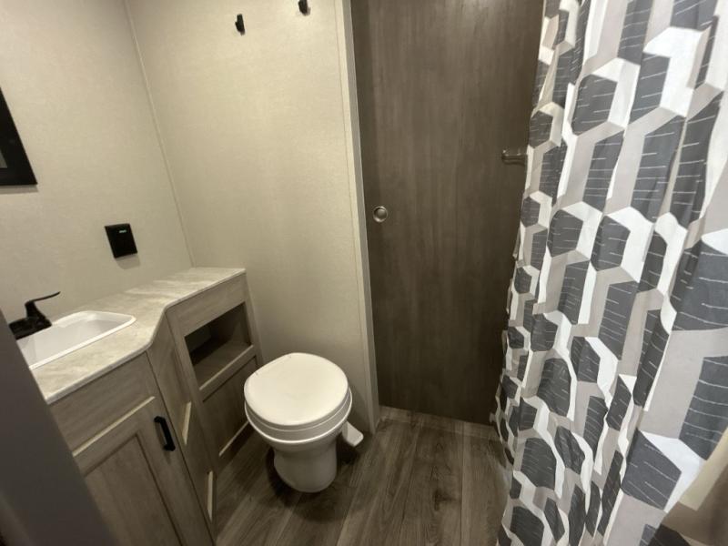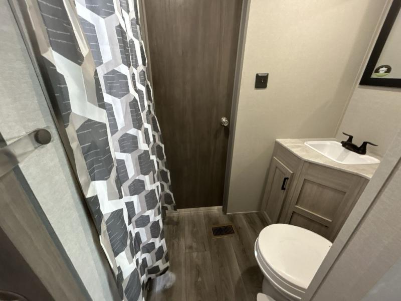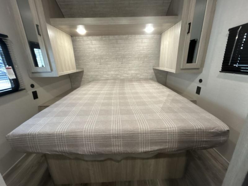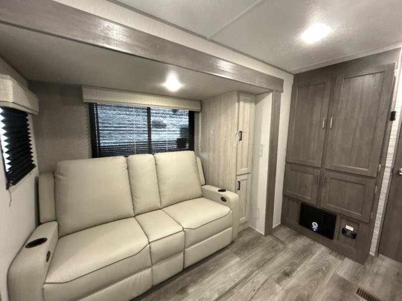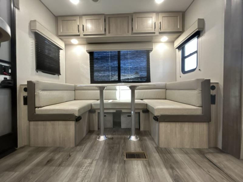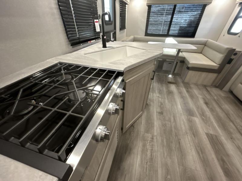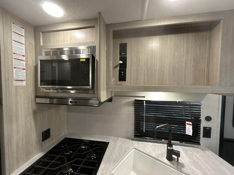 You and your spouse will love the layout of this trailer with a walk-through bathroom which is convenient for you when you are in the front bedroom, and handy for your guests when they stay overnight on the U-shaped dinette. The rear U-shaped dinette includes dual end tables to set your drink on, and the theater seating within the slide out will let you relax each evening. The galley kitchen offers all the appliances needed to make all your meals, such as a GE stainless three burner cooktop, a GE stainless microwave, plus a GE stainless 10.7 cu. ft. 12V refrigerator. You will have your own side of the walk-around queen bed and a wardrobe, as well as USB ports and 110V outlets in the nightstands.