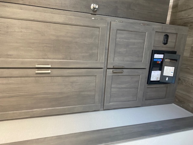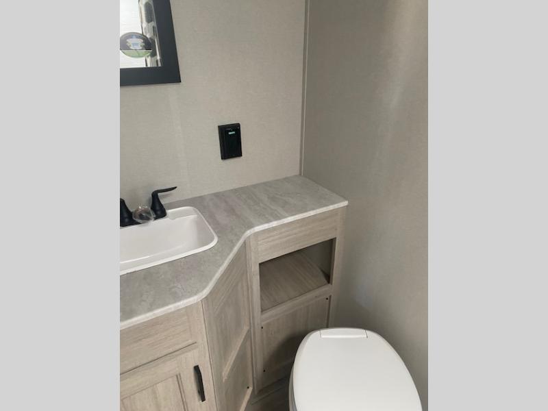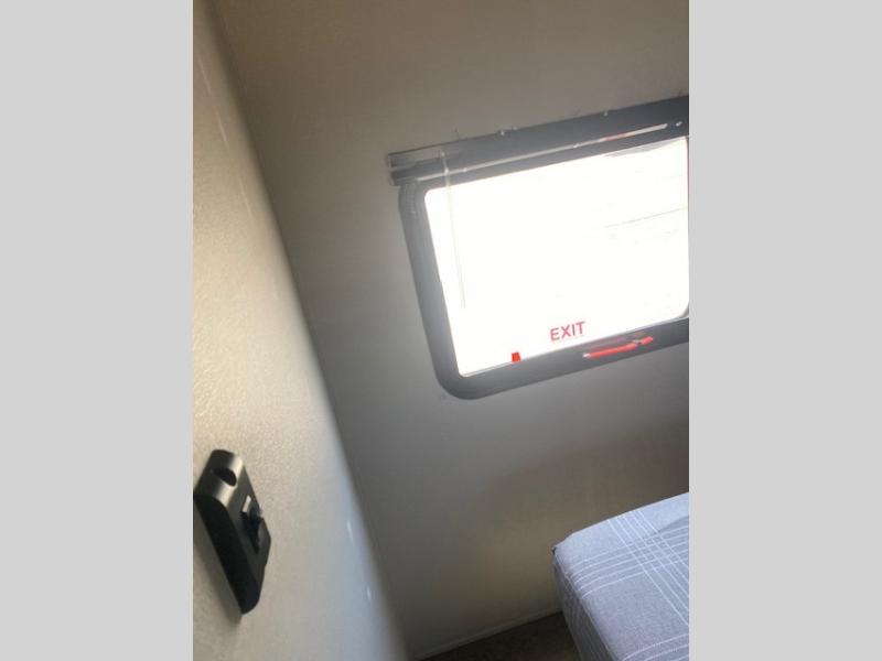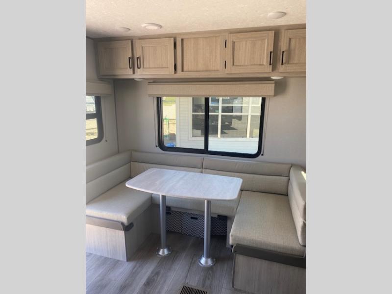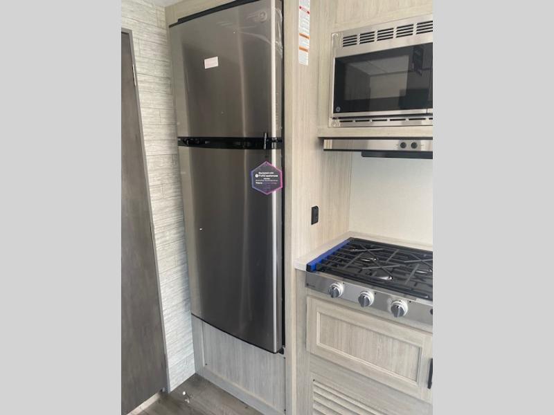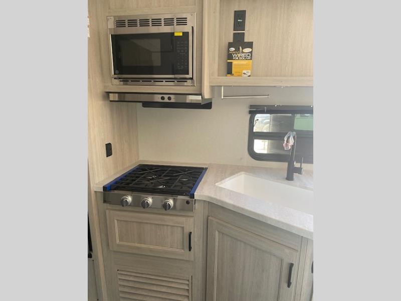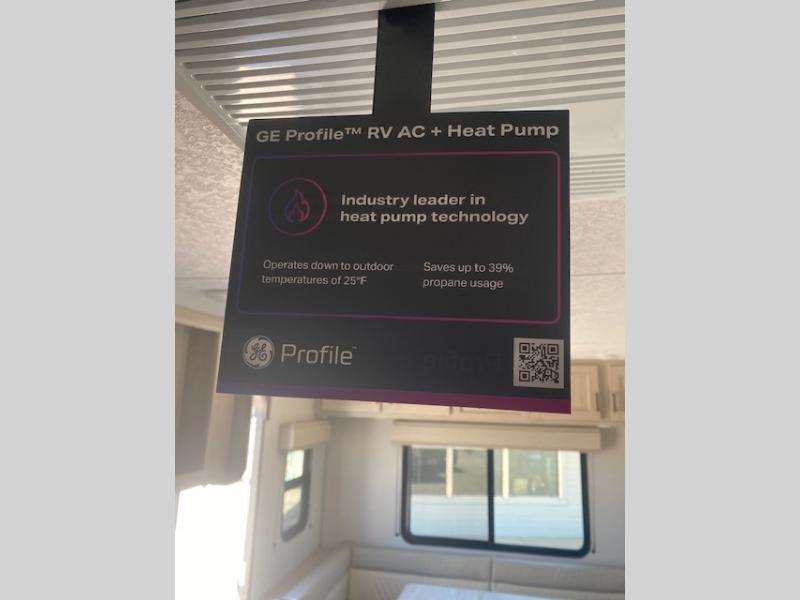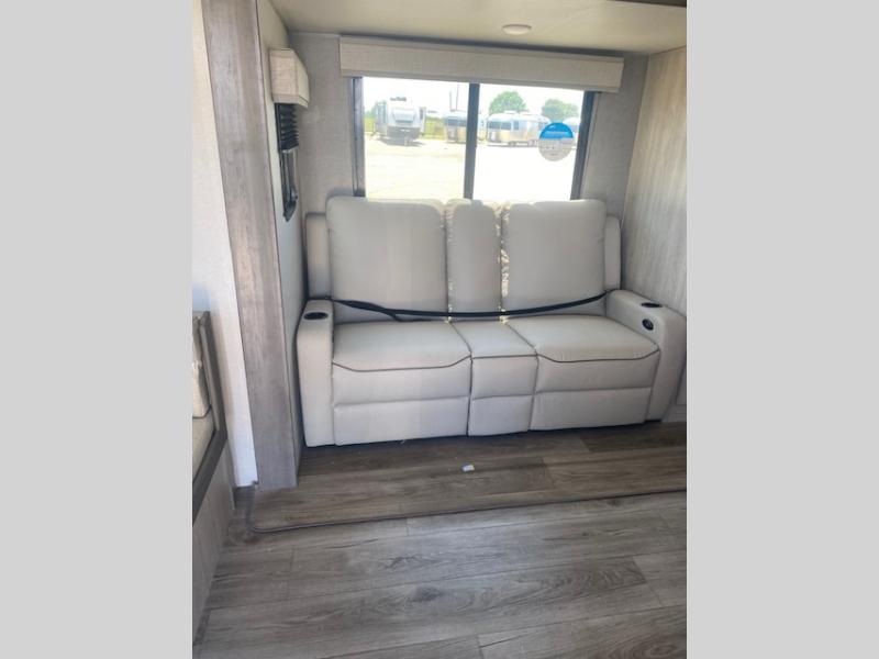 You and your spouse will love the layout of this trailer with a walk-through bathroom which is convenient for you when you are in the front bedroom, and handy for your guests when they stay overnight on the U-shaped dinette. The rear U-shaped dinette includes dual end tables to set your drink on, and the theater seating within the slide out will let you relax each evening. The galley kitchen offers all the appliances needed to make all your meals, such as a GE stainless three burner cooktop, a GE stainless microwave, plus a GE stainless 10.7 cu. ft. 12V refrigerator. You will have your own side of the walk-around queen bed and a wardrobe, as well as USB ports and 110V outlets in the nightstands.