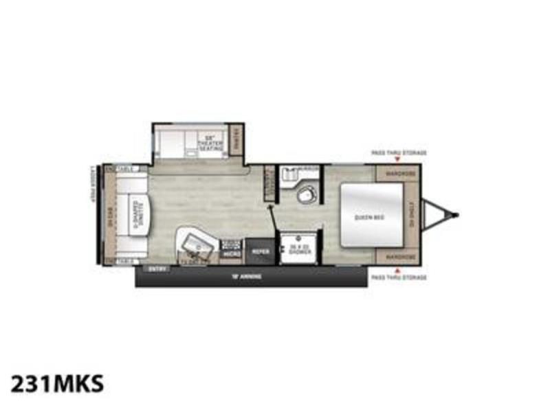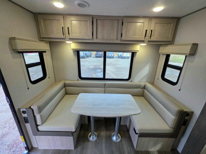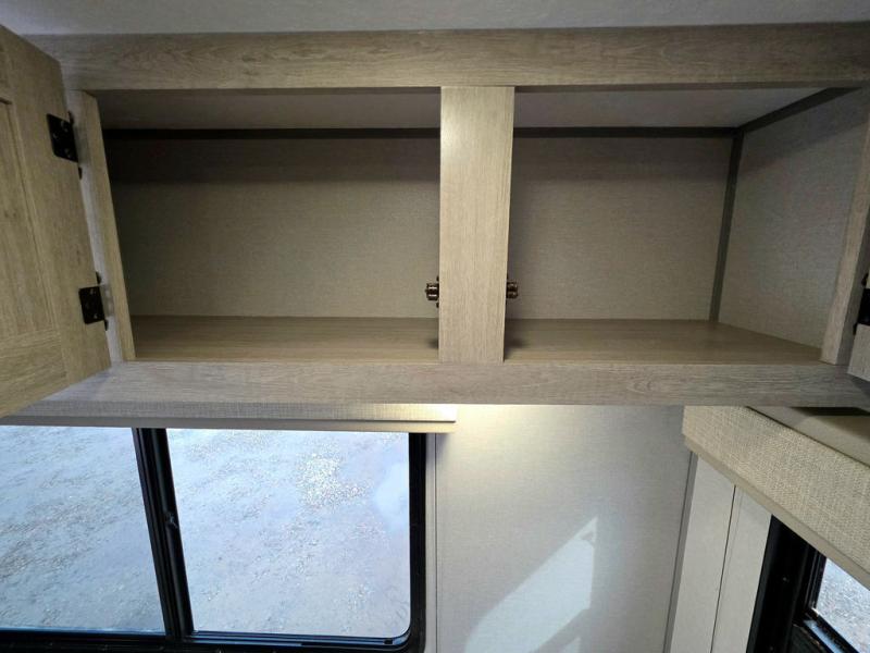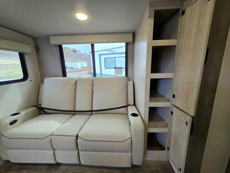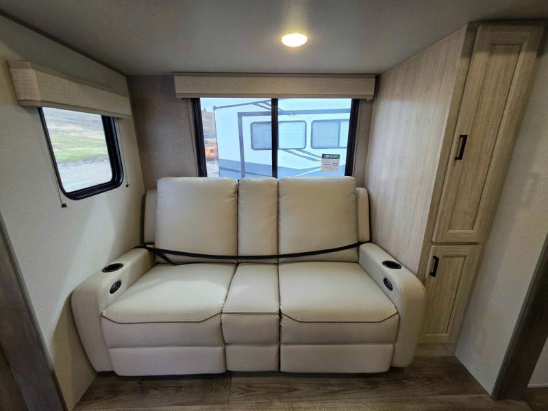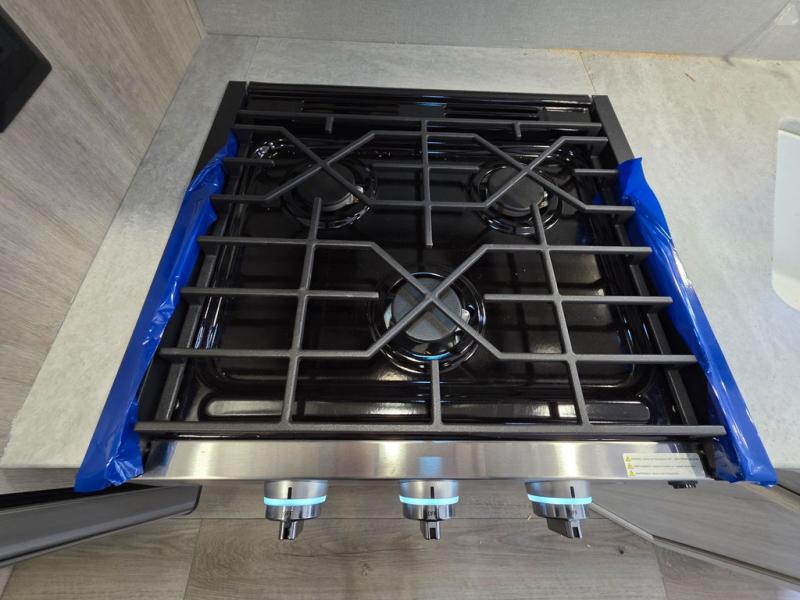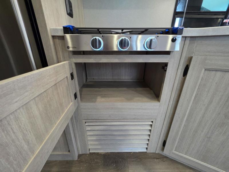 You and your spouse will love the layout of this trailer with a walk-through bathroom which is convenient for you when you are in the front bedroom, and handy for your guests when they stay overnight on the U-shaped dinette. The rear U-shaped dinette includes dual end tables to set your drink on, and the theater seating within the slide out will let you relax each evening. The galley kitchen offers all the appliances needed to make all your meals, such as a GE stainless three burner cooktop, a GE stainless microwave, plus a GE stainless 10.7 cu. ft. 12V refrigerator. You will have your own side of the walk-around queen bed and a wardrobe, as well as USB ports and 110V outlets in the nightstands.
