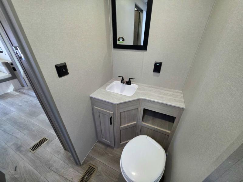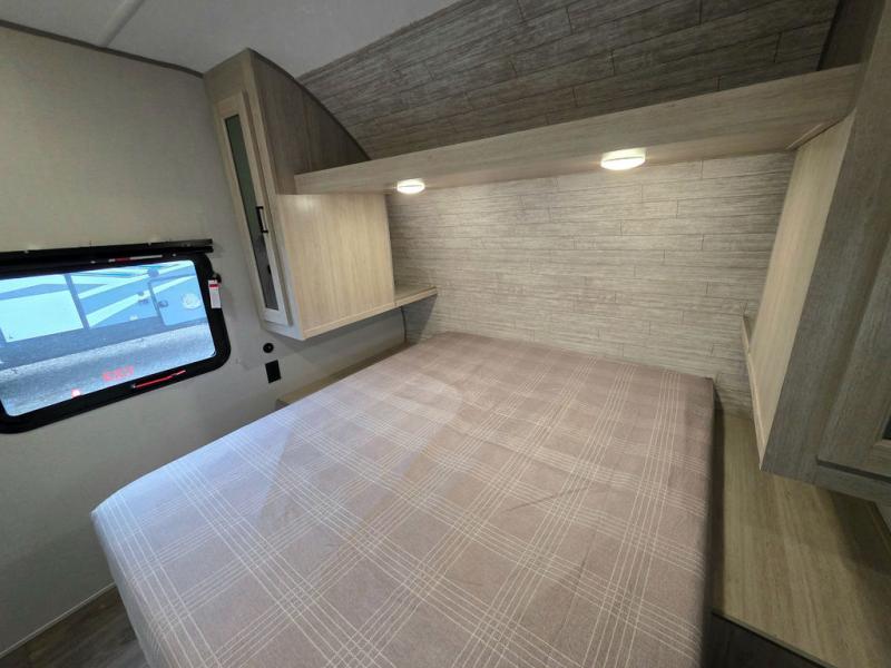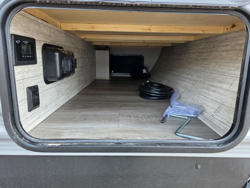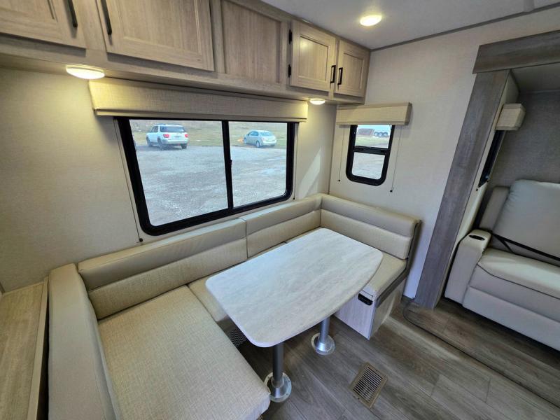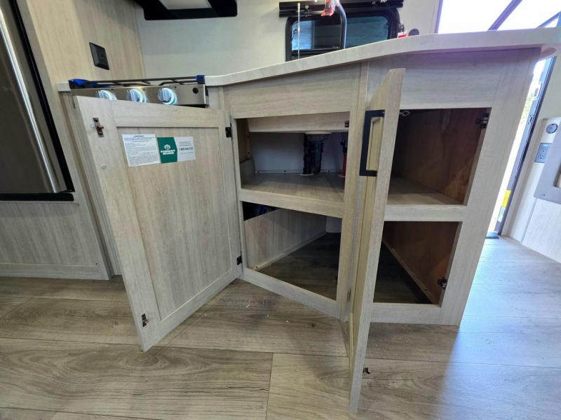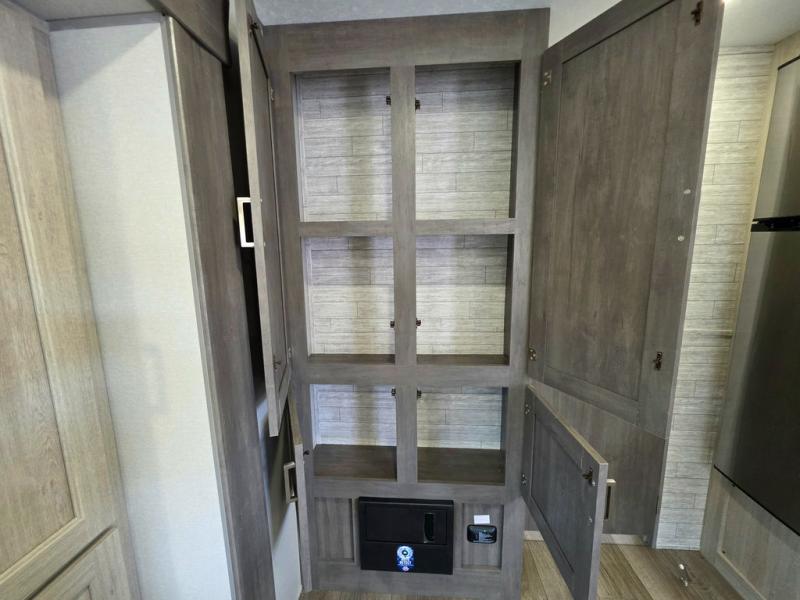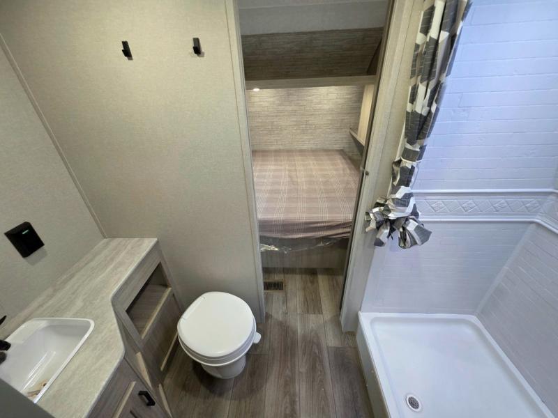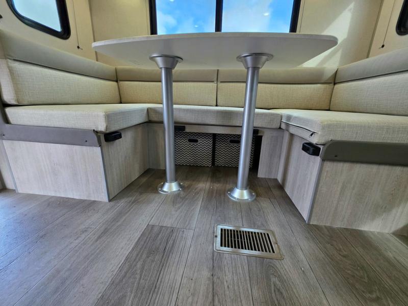 You and your spouse will love the layout of this trailer with a walk-through bathroom which is convenient for you when you are in the front bedroom, and handy for your guests when they stay overnight on the U-shaped dinette. The rear U-shaped dinette includes dual end tables to set your drink on, and the theater seating within the slide out will let you relax each evening. The galley kitchen offers all the appliances needed to make all your meals, such as a GE stainless three burner cooktop, a GE stainless microwave, plus a GE stainless 10.7 cu. ft. 12V refrigerator. You will have your own side of the walk-around queen bed and a wardrobe, as well as USB ports and 110V outlets in the nightstands.