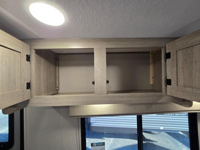 The outdoor living area is equally impressive, featuring a 15' electric awning with multi-color LED lights and a remote for easy setup. This creates the perfect environment for socializing with fellow RVers or enjoying a quiet evening under the stars. The nearby full bathroom adds convenience for everyone, making this trailer a fantastic choice for families.