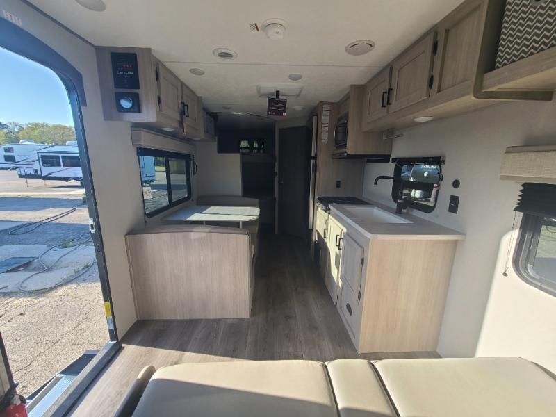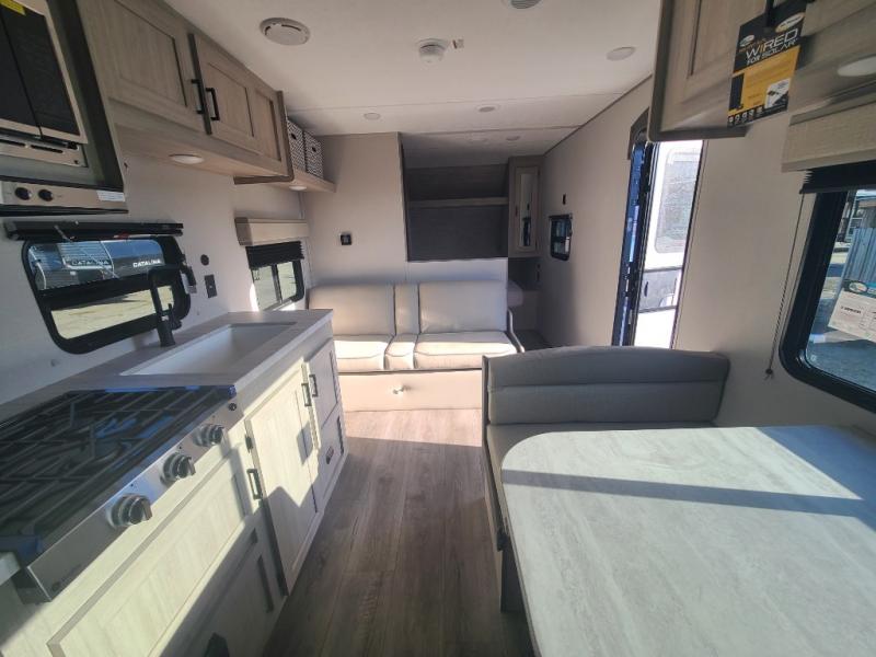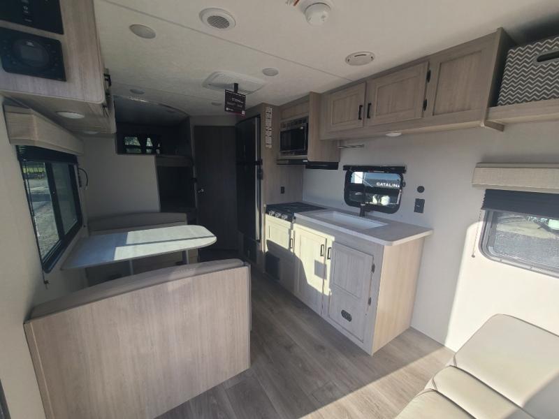 With any Catalina Summit Series 8 by Coachmen you will enjoy an affordable travel trailer packed with at-home comforts! The solid construction includes a Norco electromagnetic powder coated chassis, a seamless Alpha roof membrane, and full length frame outriggers for maximum support and durability. Dexter EZ lube axles with leaf spring suspension and self adjusting brakes provide smooth towing from home to campground, and the premium exterior graphics package is sure to turn heads as you travel down the highway. You will love the features included, such as a JBL Aura Cube media center, magnetic baggage door latches, 4,000 lumen interior touch lighting, LCI One Control, and the list goes on!
