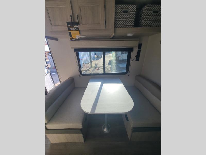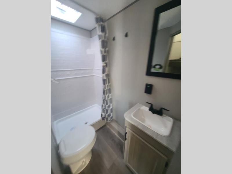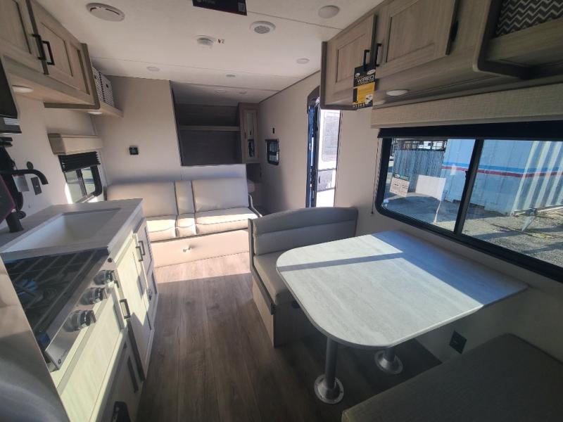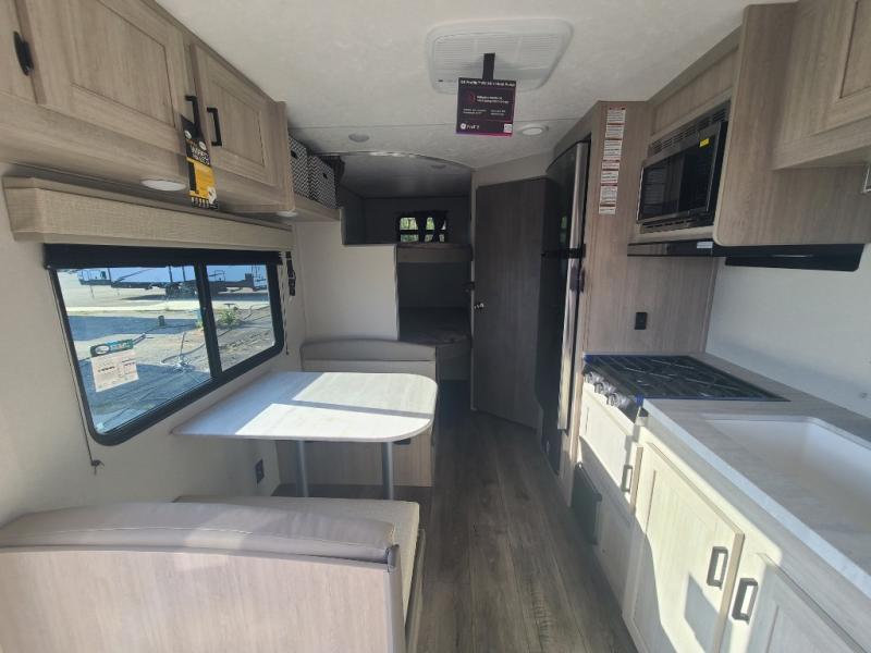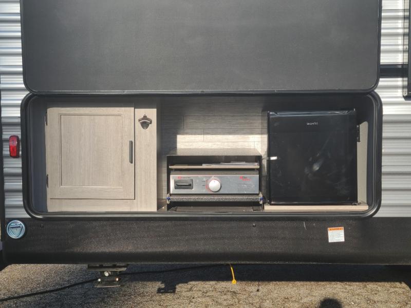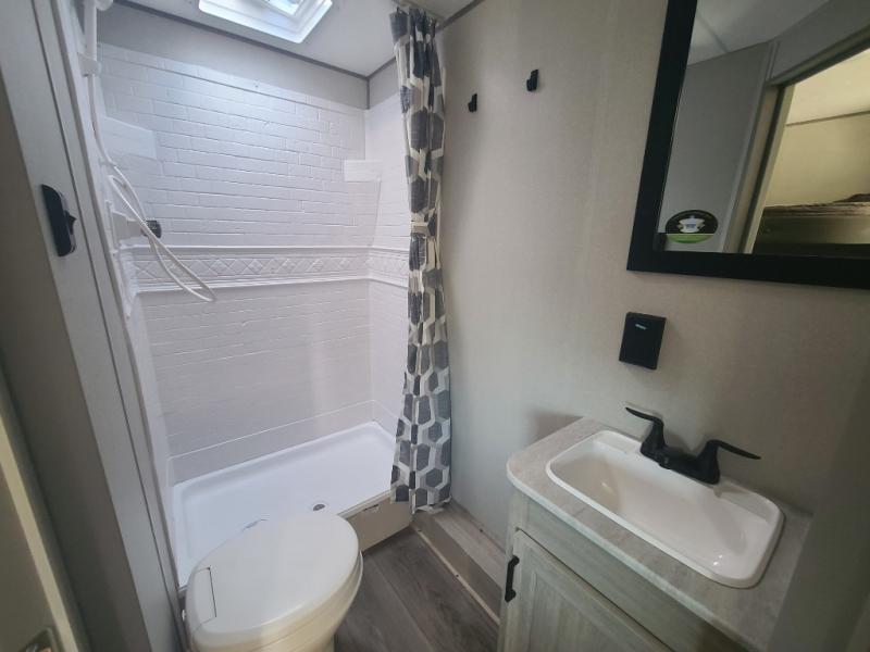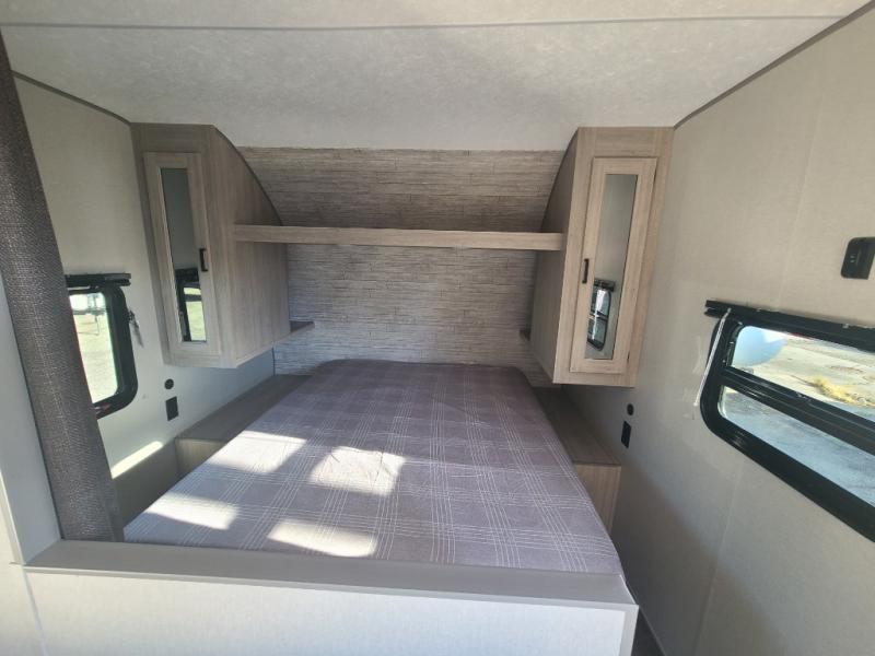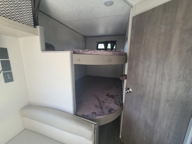 You get to choose to sit at the sofa or at the booth dinette when you are relaxing inside. There is a shelf with storage totes above the sofa for your belongings, and an additional overhead cabinet above the dinette for games. Maybe you want to rest on your own queen bed in the front semi-private bedroom before you make a meal in the kitchen or take a hike through the trails around the lake. The 15' electric awning with multi-color LED lights and a remote offers an outdoor living area where you can visit with other RVers. The kids will love their own double-size bunks that they can share with a friend or two, and the full bathroom is nearby as an added convenience.