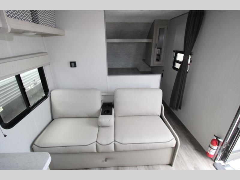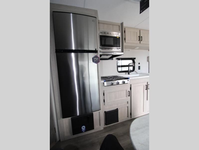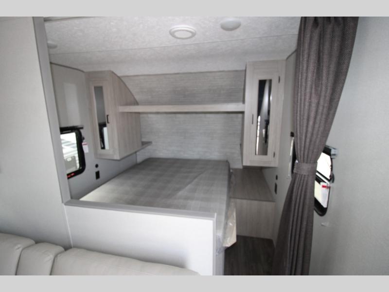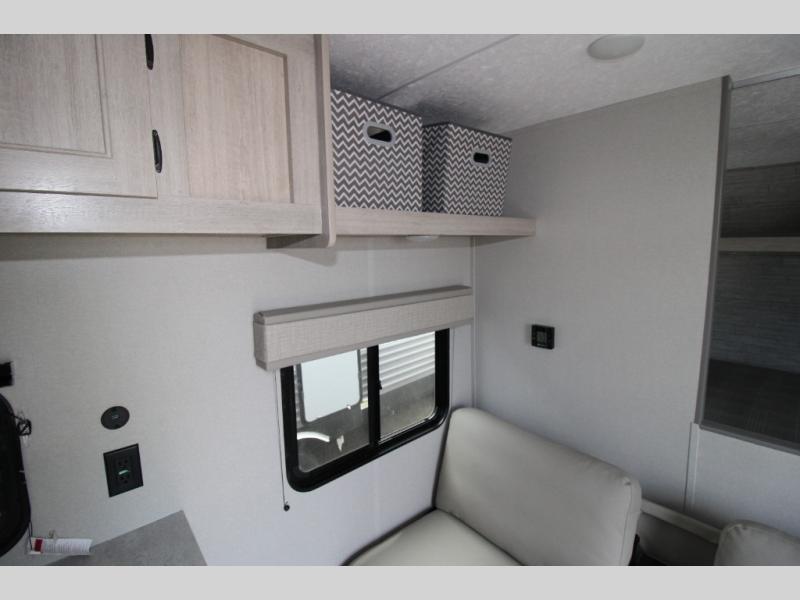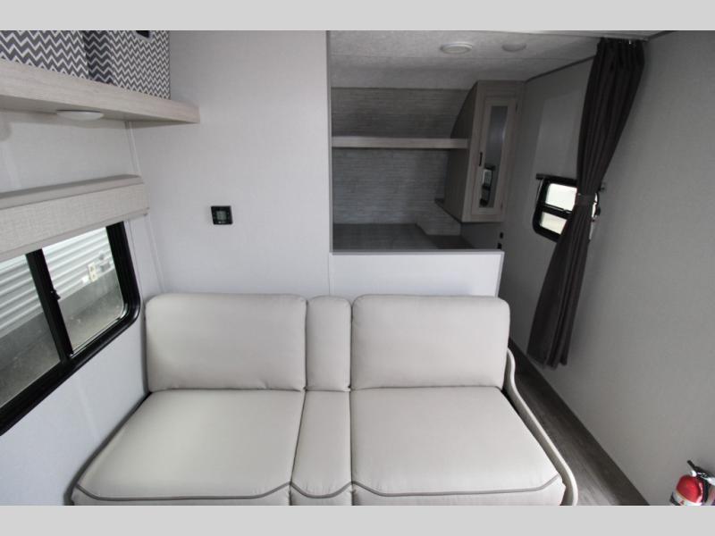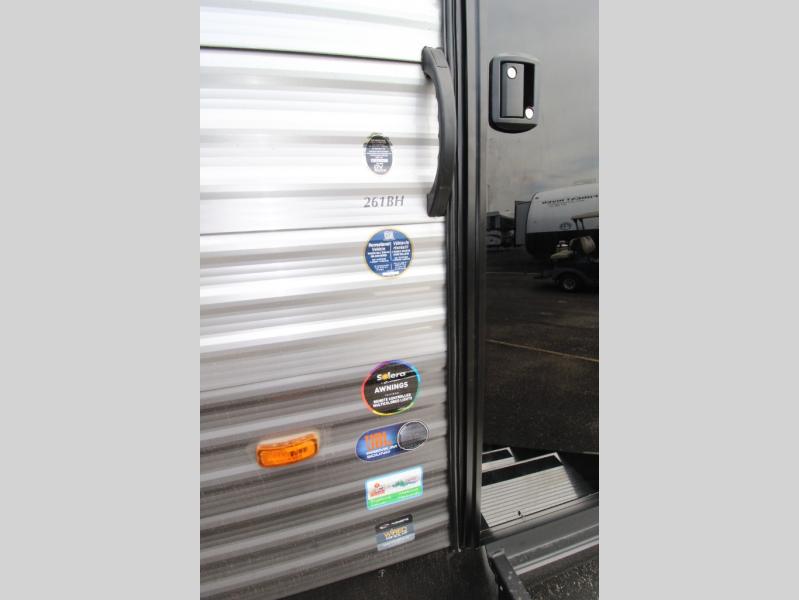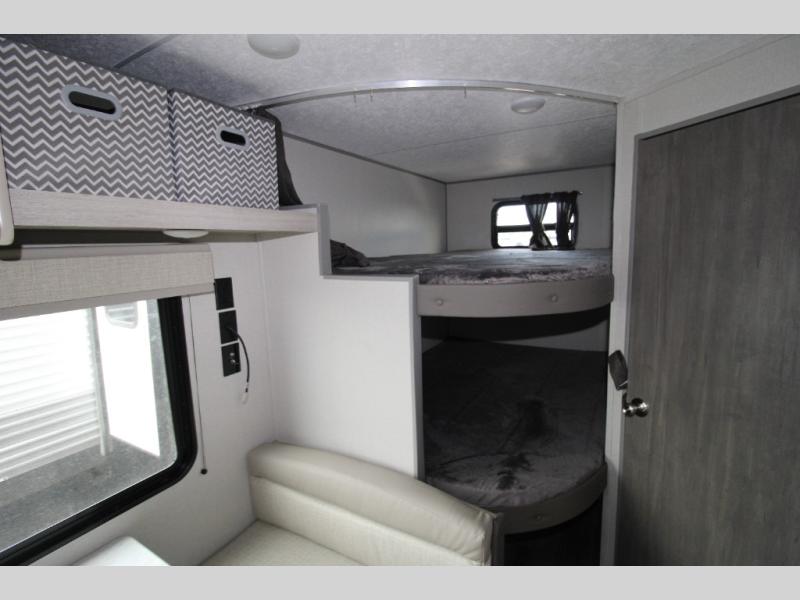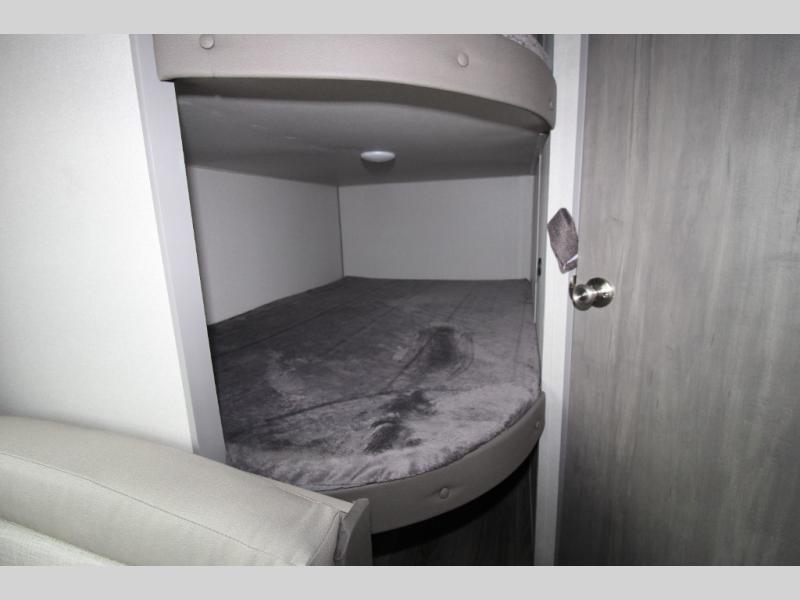 You get to choose to sit at the sofa or at the booth dinette when you are relaxing inside. There is a shelf with storage totes above the sofa for your belongings, and an additional overhead cabinet above the dinette for games. Maybe you want to rest on your own queen bed in the front semi-private bedroom before you make a meal in the kitchen or take a hike through the trails around the lake. The 15' electric awning with multi-color LED lights and a remote offers an outdoor living area where you can visit with other RVers. The kids will love their own double-size bunks that they can share with a friend or two, and the full bathroom is nearby as an added convenience.