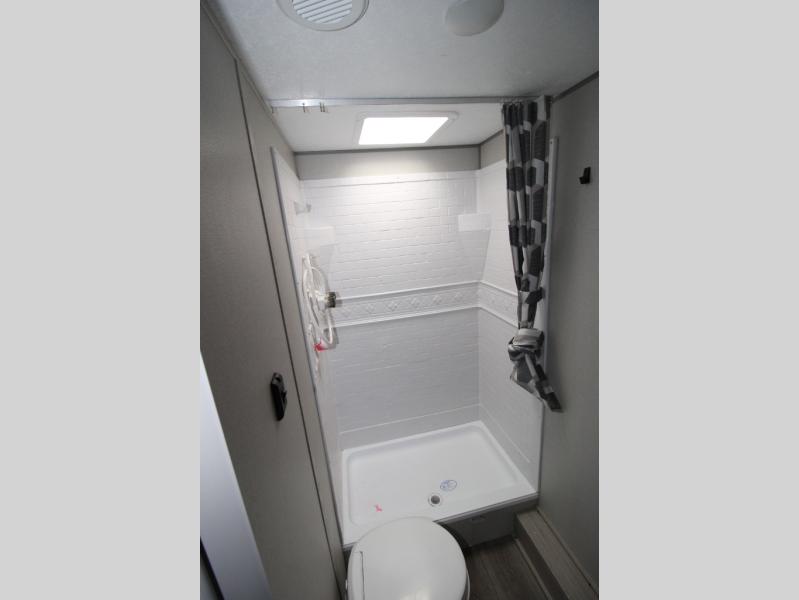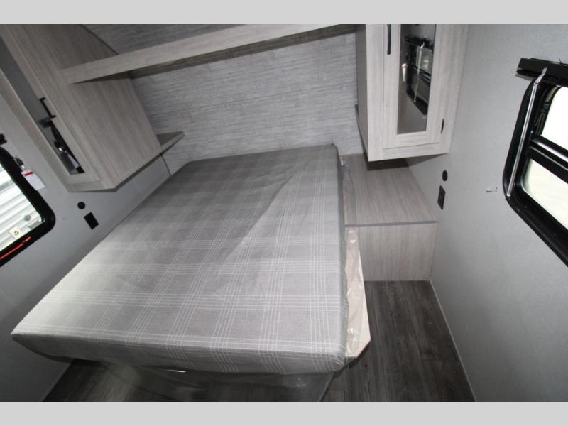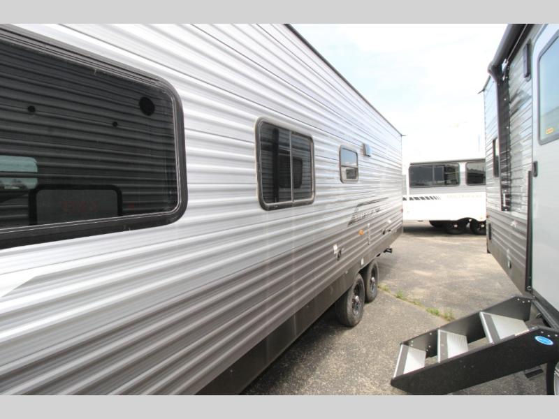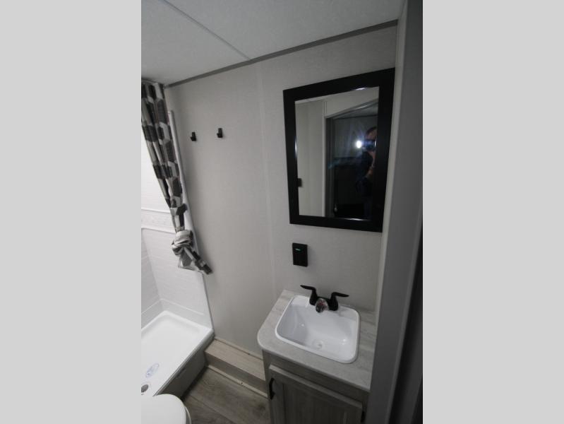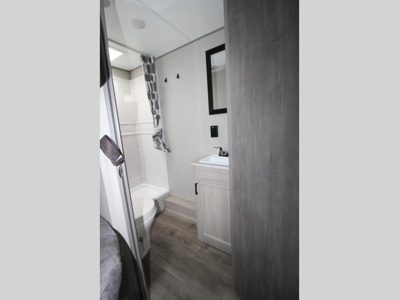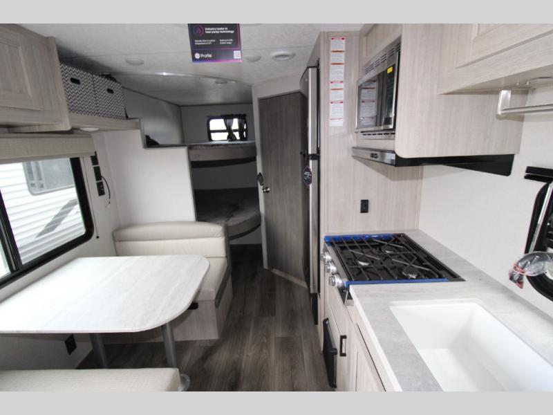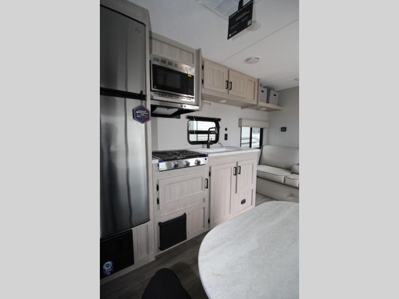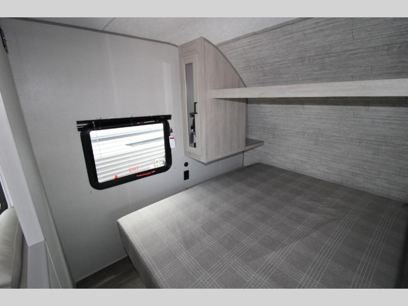 You get to choose to sit at the sofa or at the booth dinette when you are relaxing inside. There is a shelf with storage totes above the sofa for your belongings, and an additional overhead cabinet above the dinette for games. Maybe you want to rest on your own queen bed in the front semi-private bedroom before you make a meal in the kitchen or take a hike through the trails around the lake. The 15' electric awning with multi-color LED lights and a remote offers an outdoor living area where you can visit with other RVers. The kids will love their own double-size bunks that they can share with a friend or two, and the full bathroom is nearby as an added convenience.