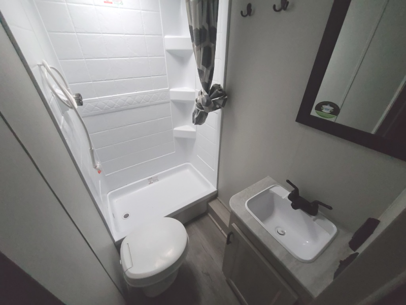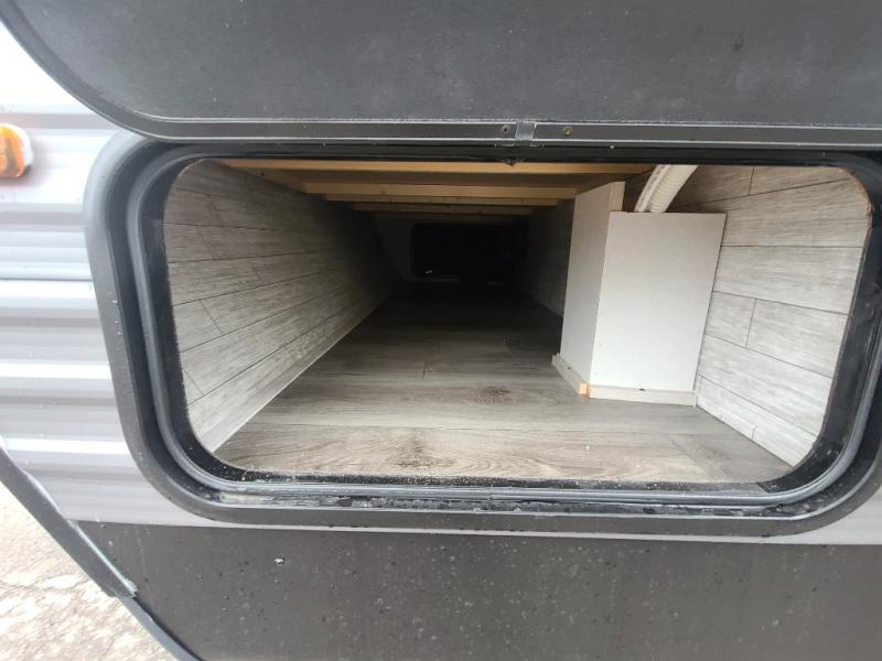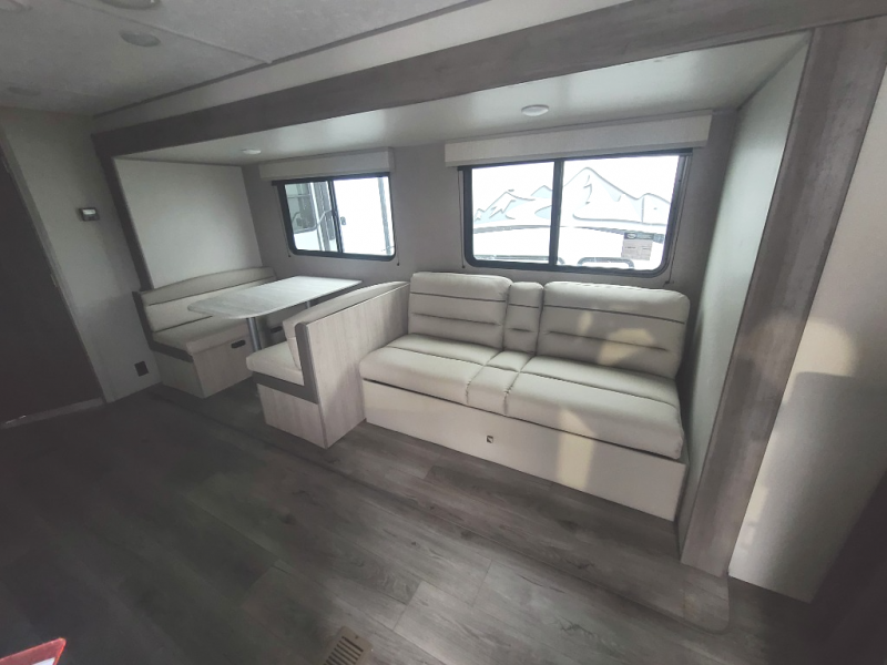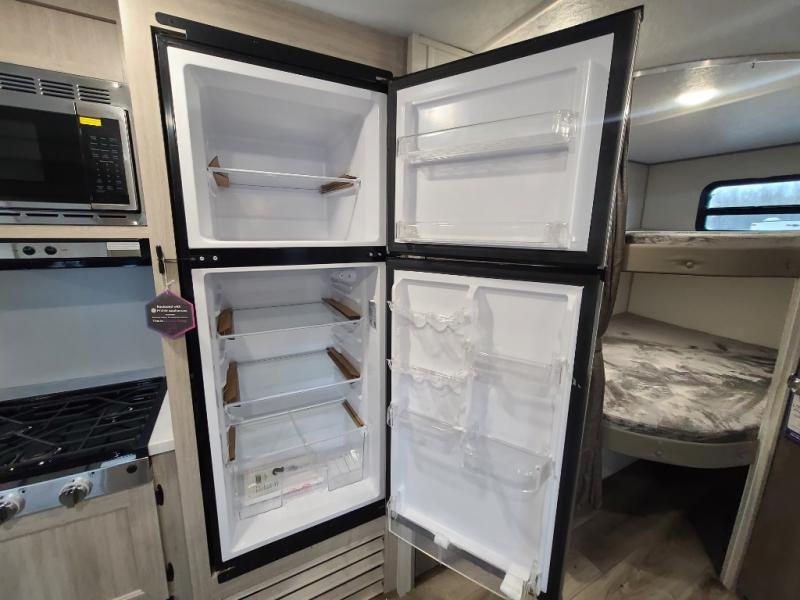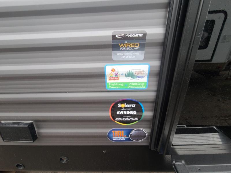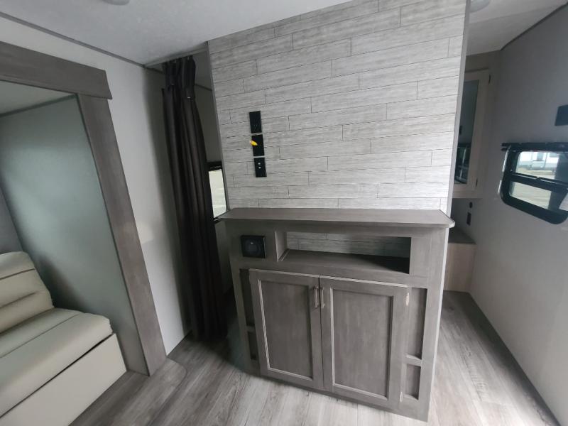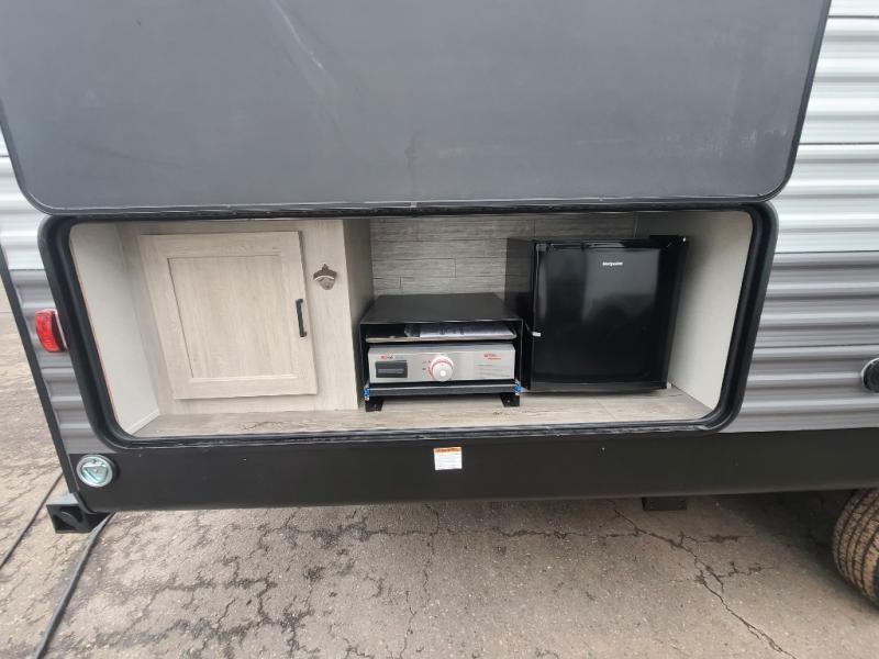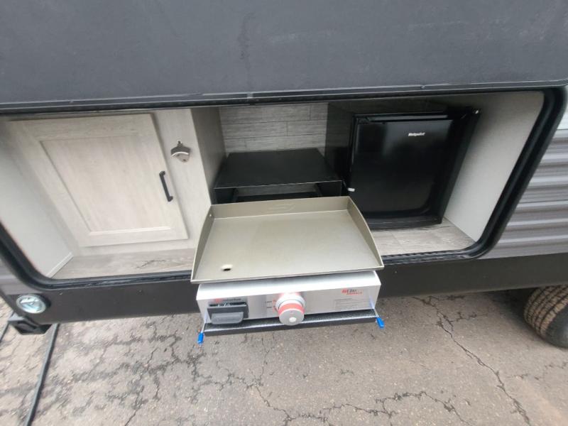 This is the perfect mid-size travel trailer for you and your family! The 46" x 74" double-size bunk beds with lower interior storage offer a comfortable sleeping space for the kids and you will have your own private sleeping space with the 60" x 74" queen bed in the front private bedroom. Freshen up each morning in the rear corner bathroom with the tub/shower and a mirror to get ready each morning. You can prepare your best home cooked meals with the GE stainless three burner cooktop and GE stainless 10.7 cu. ft. 12V refrigerator, then enjoy them together at the booth dinette. The sofa is near the entertainment center for a relaxing movie night. Don't leave any of your outdoor gear behind either thanks to the front pass-through storage area and the exterior outside storage area. You could even add the optional outside camper kitchen to grill the catch of the day on the pull out griddle!