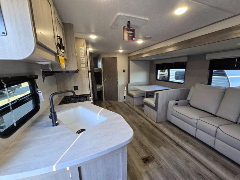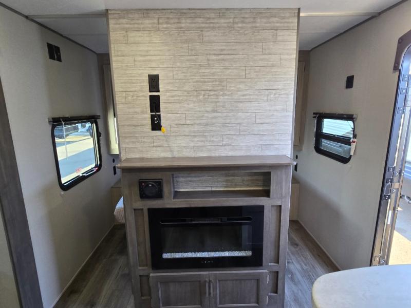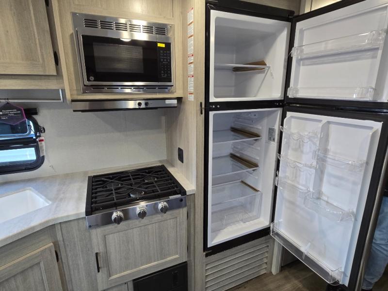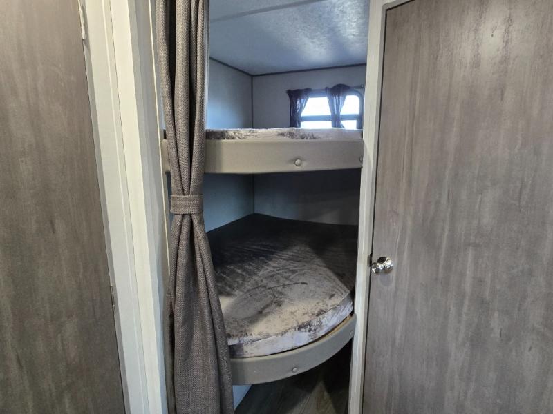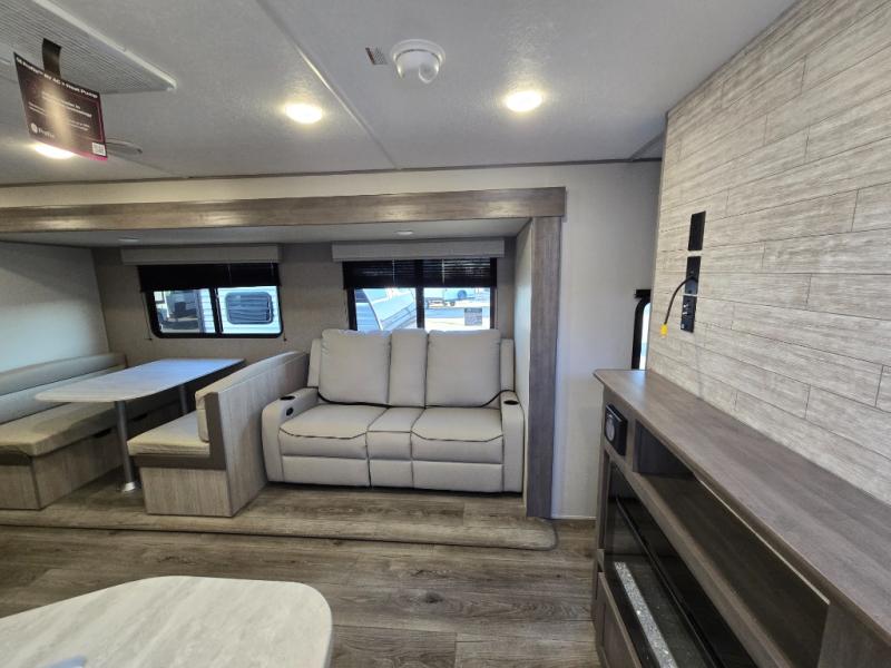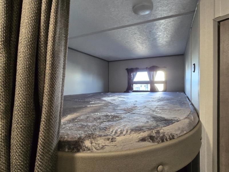 This is the perfect mid-size travel trailer for you and your family! The 46" x 74" double-size bunk beds with lower interior storage offer a comfortable sleeping space for the kids and you will have your own private sleeping space with the 60" x 74" queen bed in the front private bedroom. Freshen up each morning in the rear corner bathroom with the tub/shower and a mirror to get ready each morning. You can prepare your best home cooked meals with the GE stainless three burner cooktop and GE stainless 10.7 cu. ft. 12V refrigerator, then enjoy them together at the booth dinette. The sofa is near the entertainment center for a relaxing movie night. Don't leave any of your outdoor gear behind either thanks to the front pass-through storage area and the exterior outside storage area. You could even add the optional outside camper kitchen to grill the catch of the day on the pull out griddle!