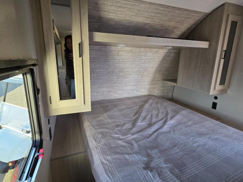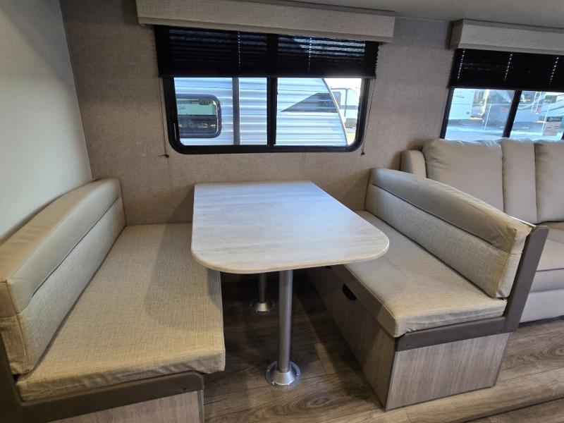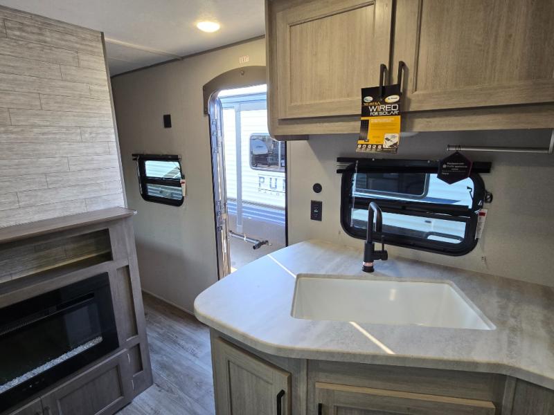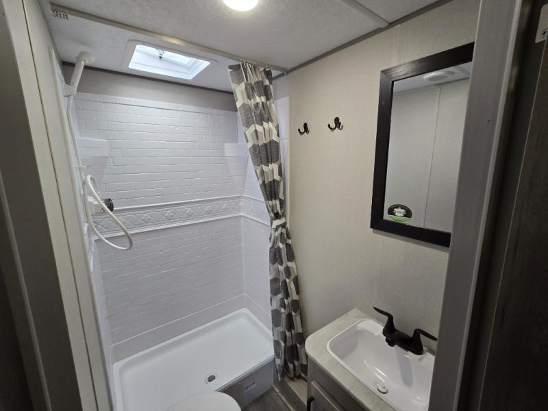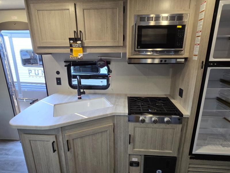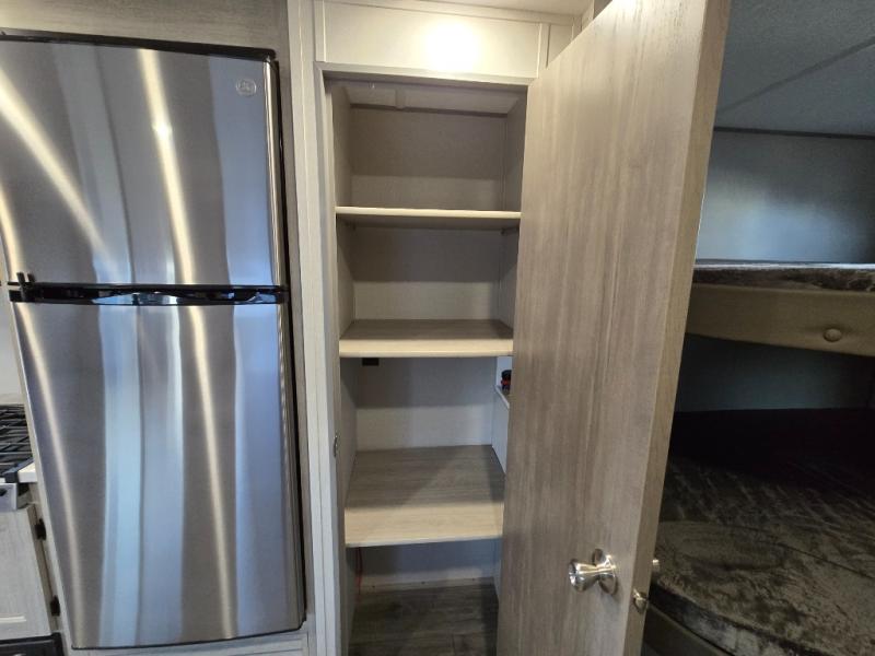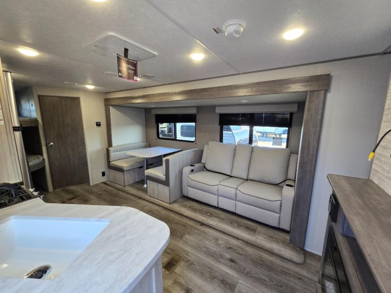 This is the perfect mid-size travel trailer for you and your family! The 46" x 74" double-size bunk beds with lower interior storage offer a comfortable sleeping space for the kids and you will have your own private sleeping space with the 60" x 74" queen bed in the front private bedroom. Freshen up each morning in the rear corner bathroom with the tub/shower and a mirror to get ready each morning. You can prepare your best home cooked meals with the GE stainless three burner cooktop and GE stainless 10.7 cu. ft. 12V refrigerator, then enjoy them together at the booth dinette. The sofa is near the entertainment center for a relaxing movie night. Don't leave any of your outdoor gear behind either thanks to the front pass-through storage area and the exterior outside storage area. You could even add the optional outside camper kitchen to grill the catch of the day on the pull out griddle!