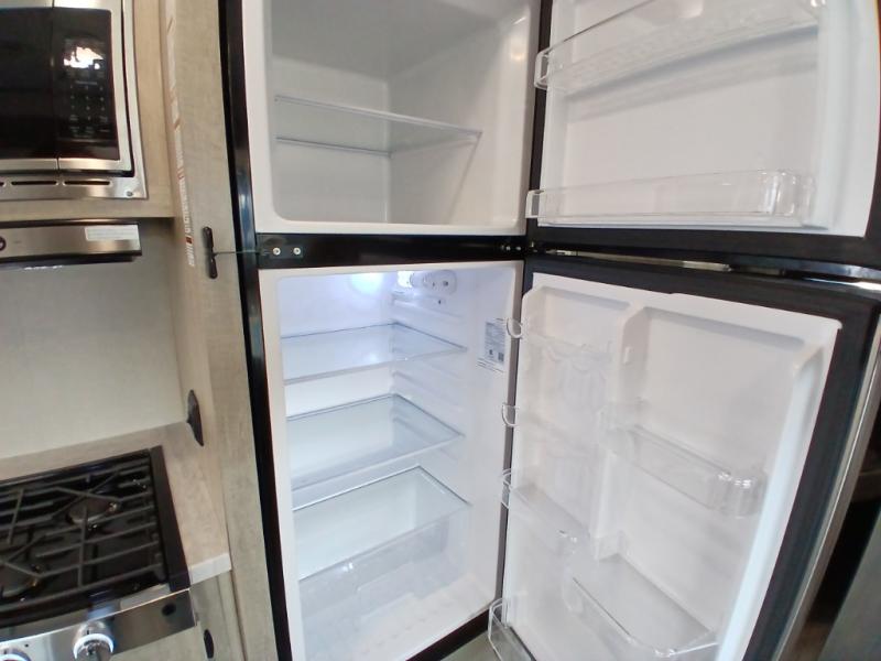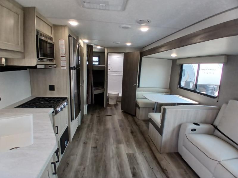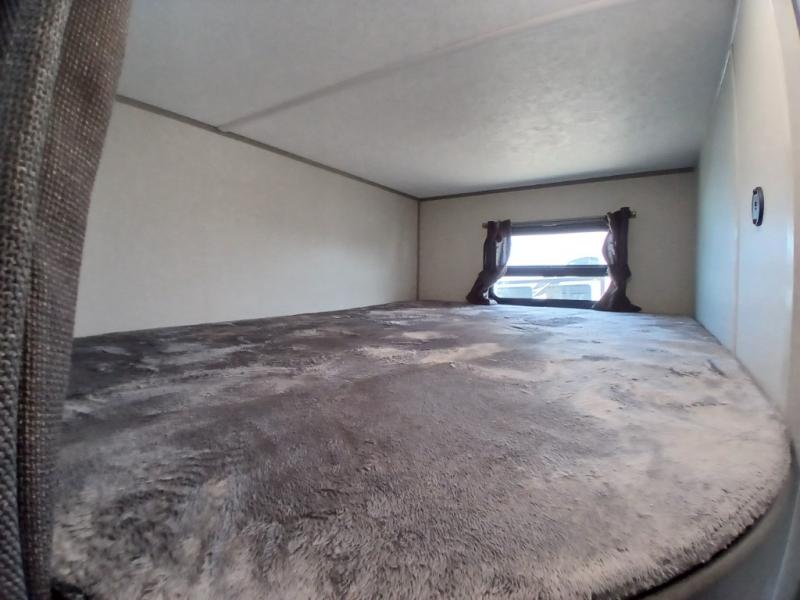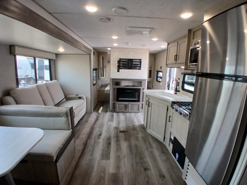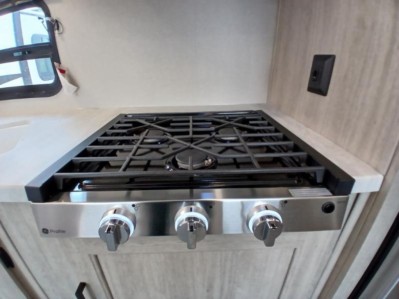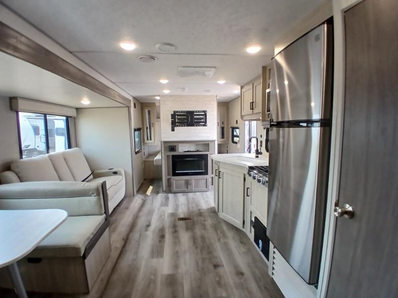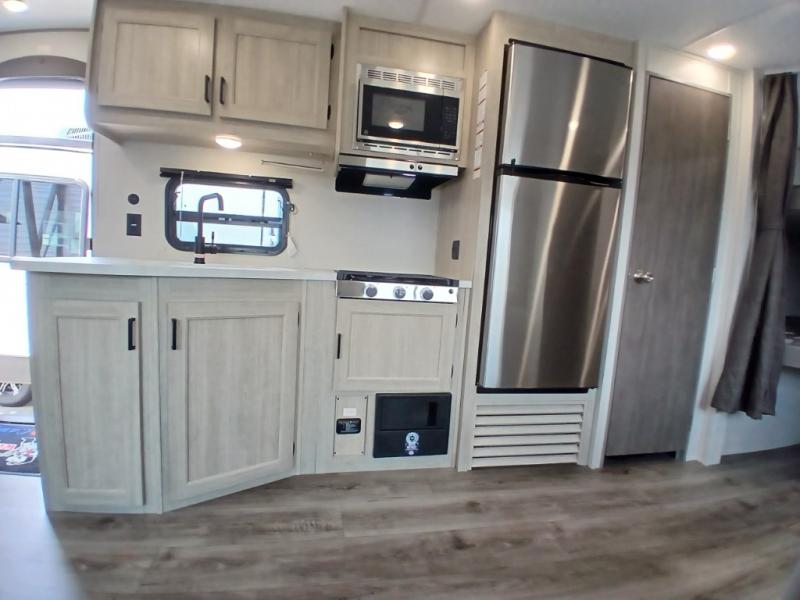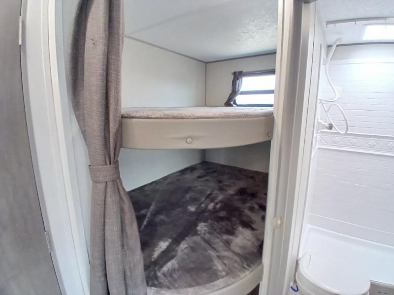 This is the perfect mid-size travel trailer for you and your family! The 46" x 74" double-size bunk beds with lower interior storage offer a comfortable sleeping space for the kids and you will have your own private sleeping space with the 60" x 74" queen bed in the front private bedroom. Freshen up each morning in the rear corner bathroom with the tub/shower and a mirror to get ready each morning. You can prepare your best home cooked meals with the GE stainless three burner cooktop and GE stainless 10.7 cu. ft. 12V refrigerator, then enjoy them together at the booth dinette. The sofa is near the entertainment center for a relaxing movie night. Don't leave any of your outdoor gear behind either thanks to the front pass-through storage area and the exterior outside storage area. You could even add the optional outside camper kitchen to grill the catch of the day on the pull out griddle!