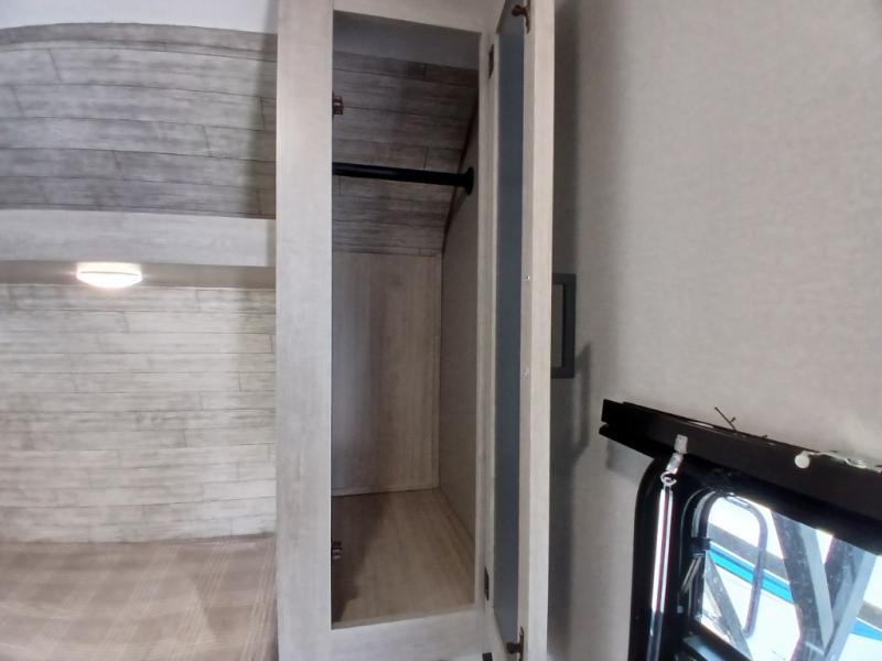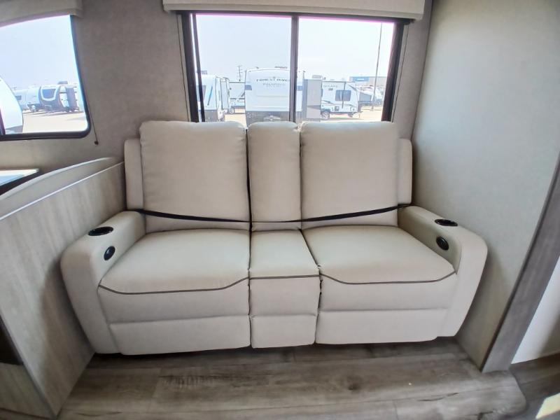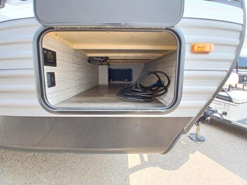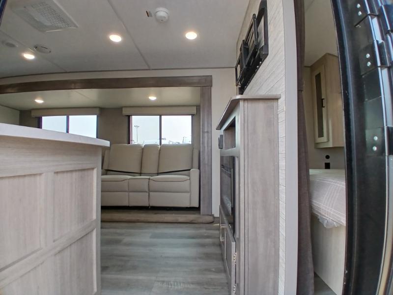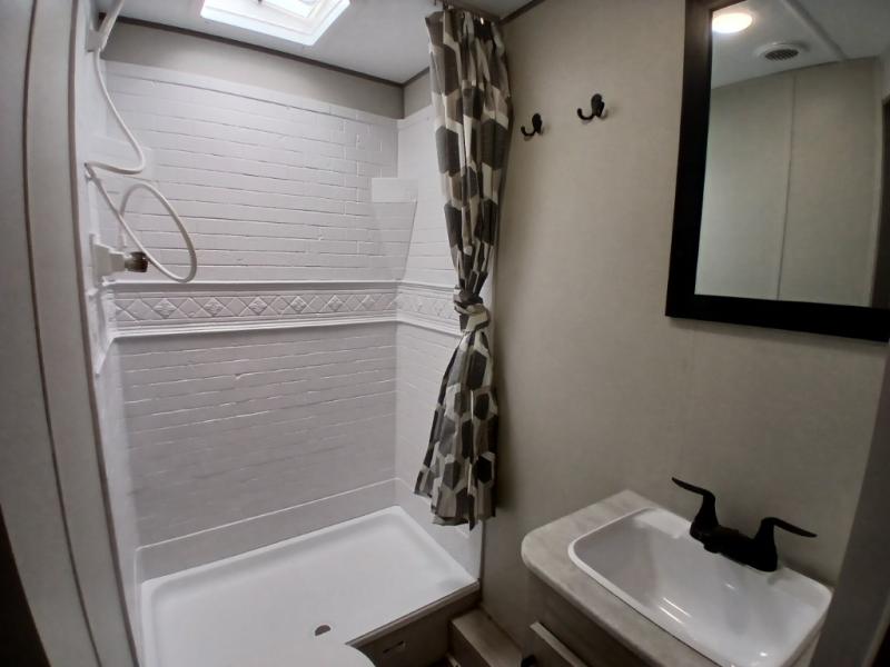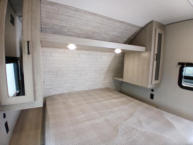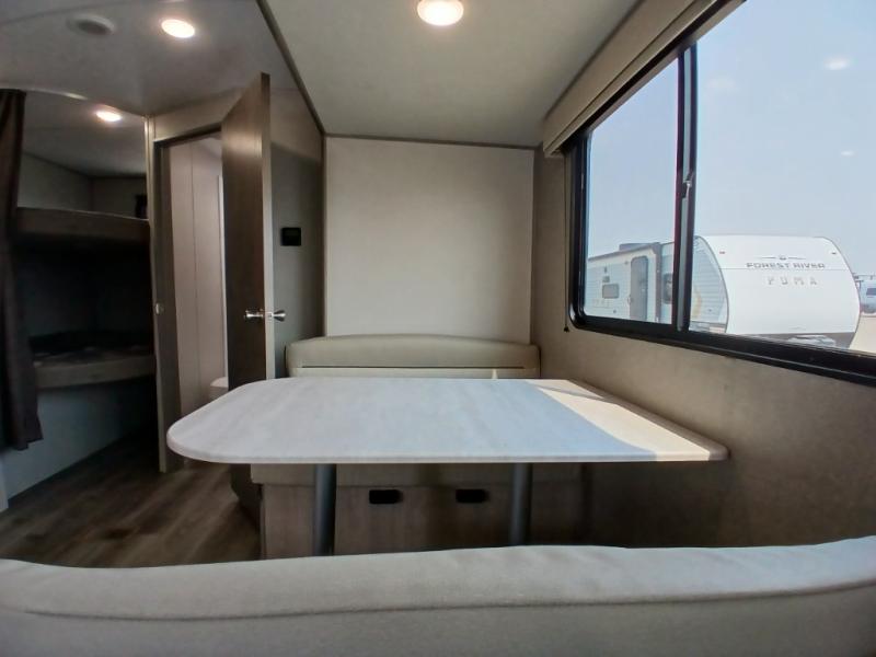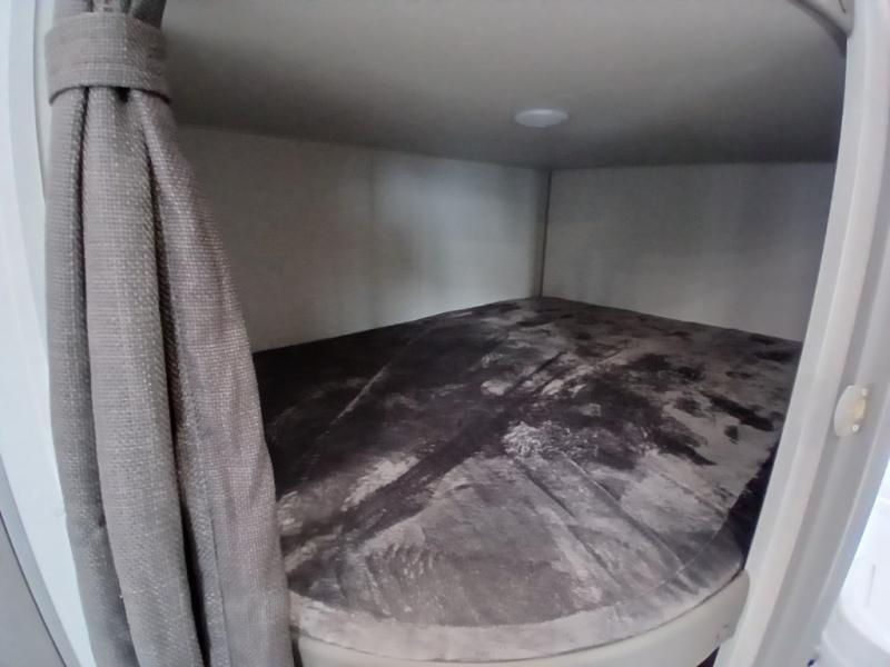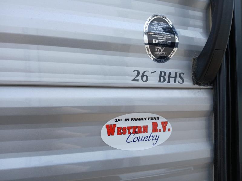 This is the perfect mid-size travel trailer for you and your family! The 46" x 74" double-size bunk beds with lower interior storage offer a comfortable sleeping space for the kids and you will have your own private sleeping space with the 60" x 74" queen bed in the front private bedroom. Freshen up each morning in the rear corner bathroom with the tub/shower and a mirror to get ready each morning. You can prepare your best home cooked meals with the GE stainless three burner cooktop and GE stainless 10.7 cu. ft. 12V refrigerator, then enjoy them together at the booth dinette. The sofa is near the entertainment center for a relaxing movie night. Don't leave any of your outdoor gear behind either thanks to the front pass-through storage area and the exterior outside storage area. You could even add the optional outside camper kitchen to grill the catch of the day on the pull out griddle!