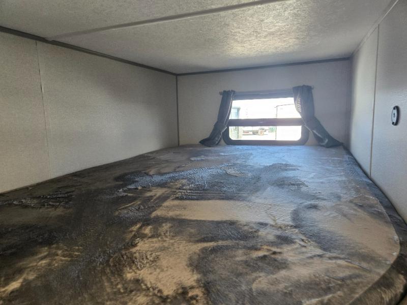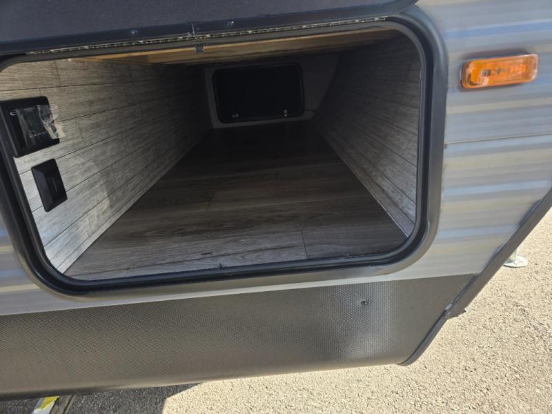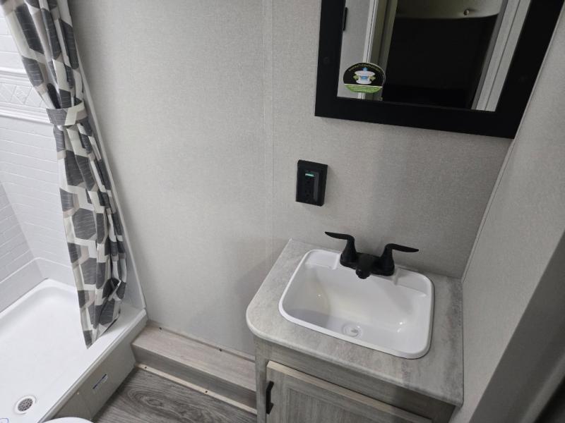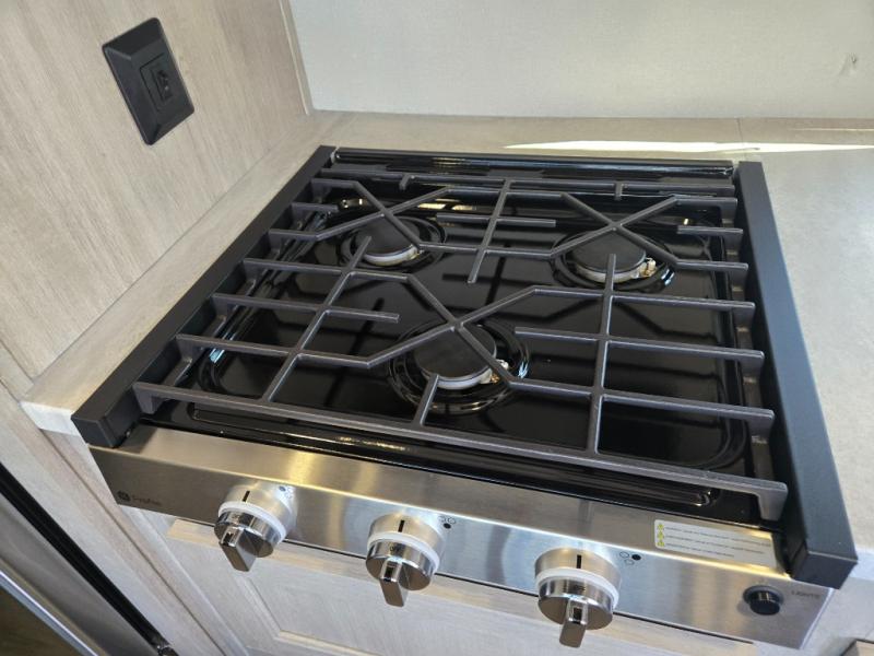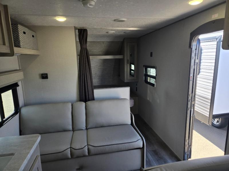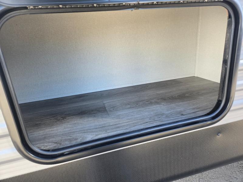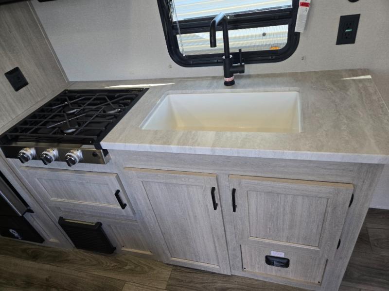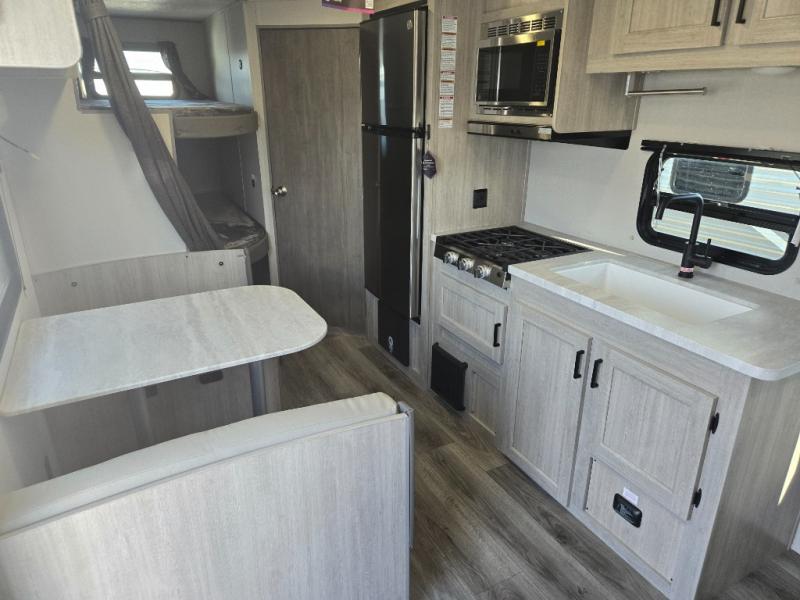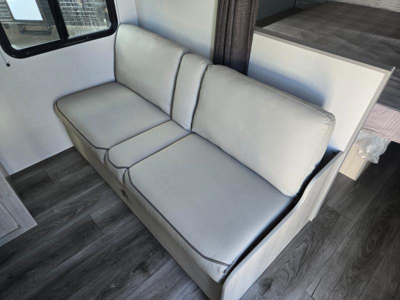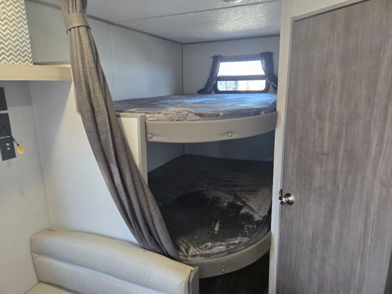 This is the perfect mid-size travel trailer for you and your family! The 46" x 74" double-size bunk beds with lower interior storage offer a comfortable sleeping space for the kids and you will have your own private sleeping space with the 60" x 74" queen bed in the front private bedroom. Freshen up each morning in the rear corner bathroom with the tub/shower and a mirror to get ready each morning. You can prepare your best home cooked meals with the GE stainless three burner cooktop and GE stainless 10.7 cu. ft. 12V refrigerator, then enjoy them together at the booth dinette. The sofa is near the entertainment center for a relaxing movie night. Don't leave any of your outdoor gear behind either thanks to the front pass-through storage area and the exterior outside storage area. You could even add the optional outside camper kitchen to grill the catch of the day on the pull out griddle!