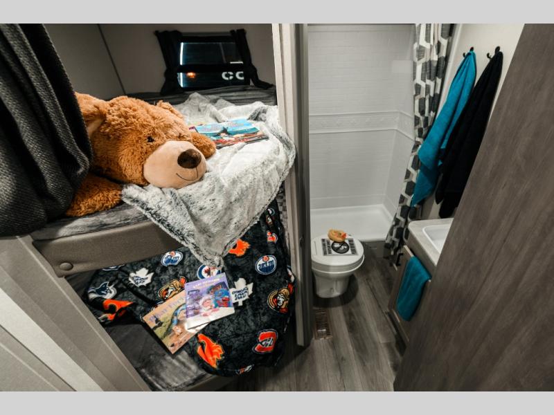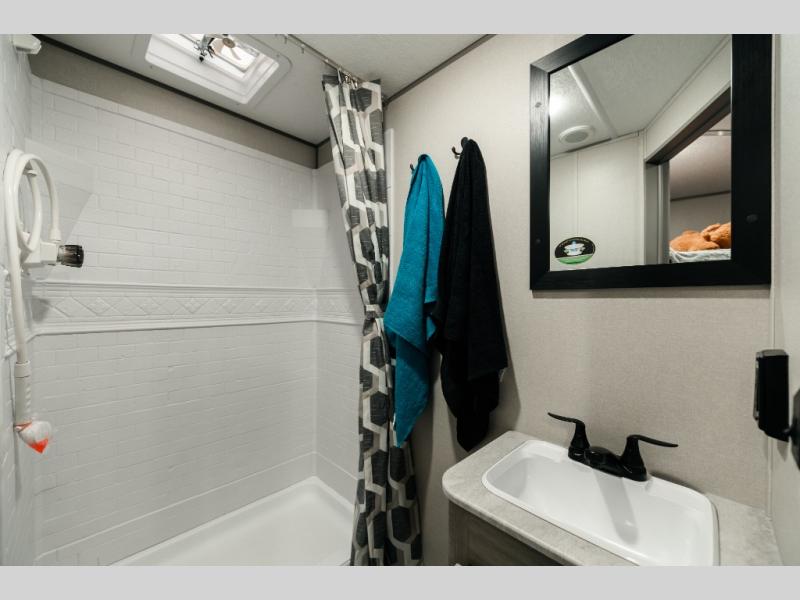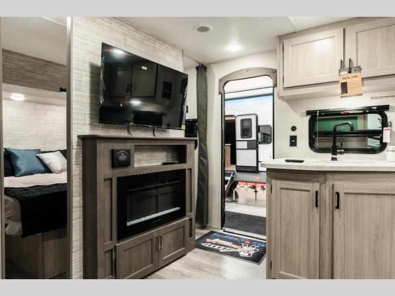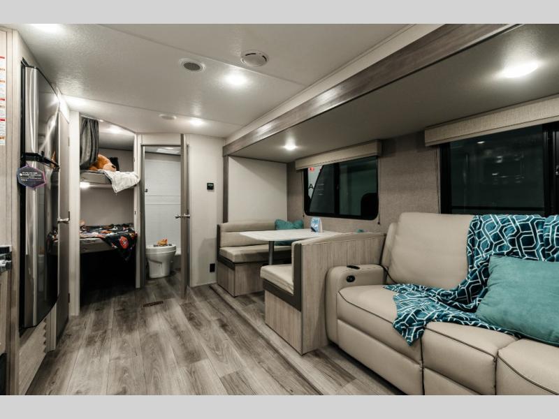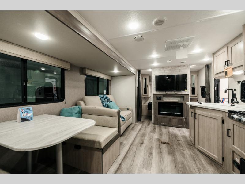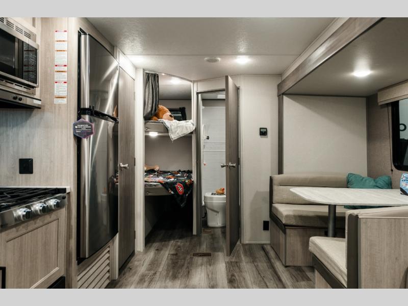 This is the perfect mid-size travel trailer for you and your family! The 46" x 74" double-size bunk beds with lower interior storage offer a comfortable sleeping space for the kids and you will have your own private sleeping space with the 60" x 74" queen bed in the front private bedroom. Freshen up each morning in the rear corner bathroom with the tub/shower and a mirror to get ready each morning. You can prepare your best home cooked meals with the GE stainless three burner cooktop and GE stainless 10.7 cu. ft. 12V refrigerator, then enjoy them together at the booth dinette. The sofa is near the entertainment center for a relaxing movie night. Don't leave any of your outdoor gear behind either thanks to the front pass-through storage area and the exterior outside storage area. You could even add the optional outside camper kitchen to grill the catch of the day on the pull out griddle!