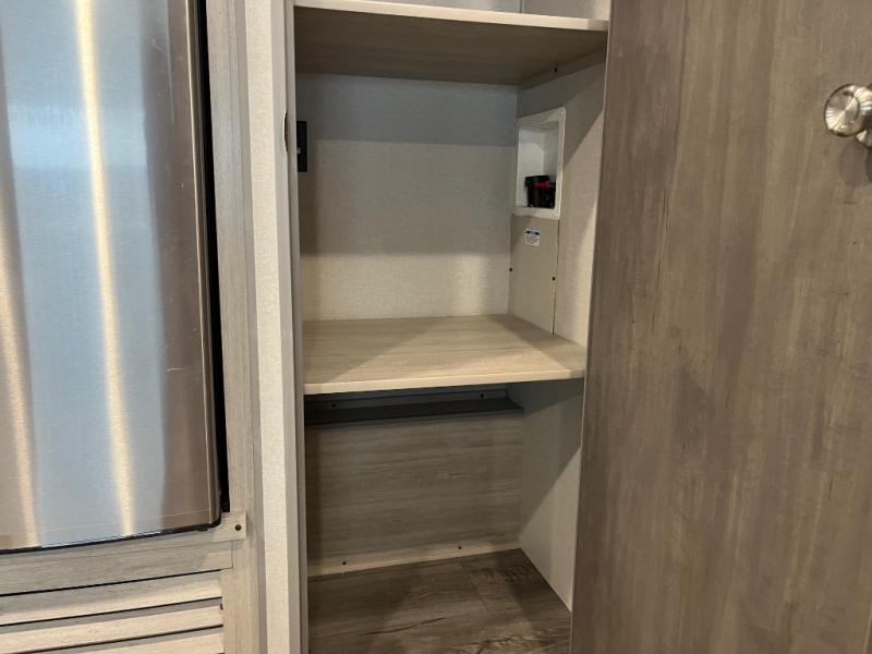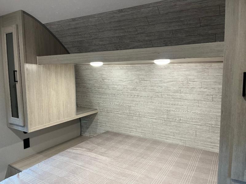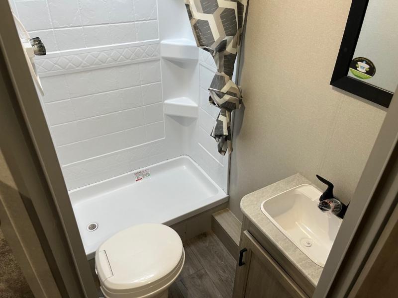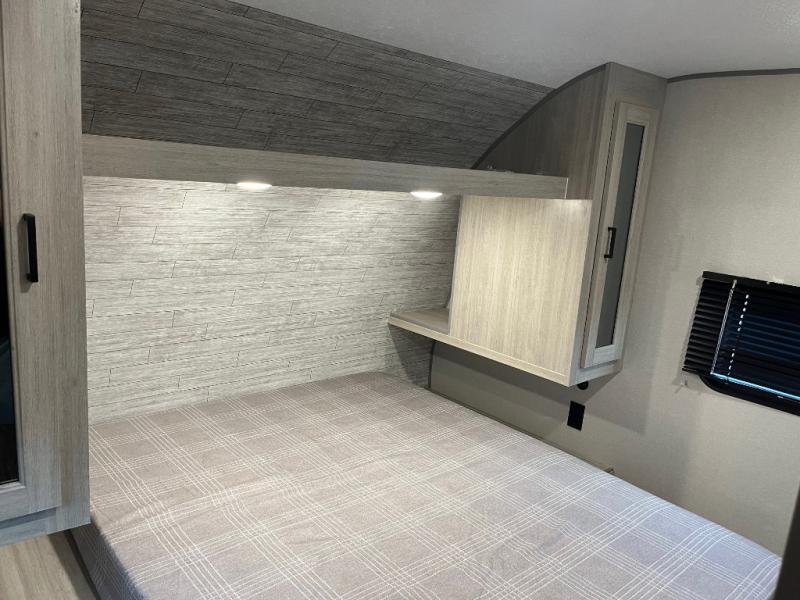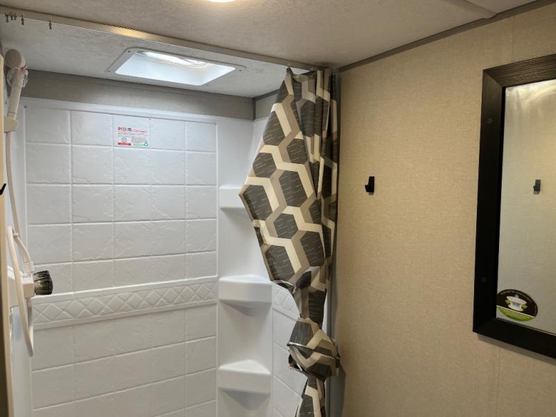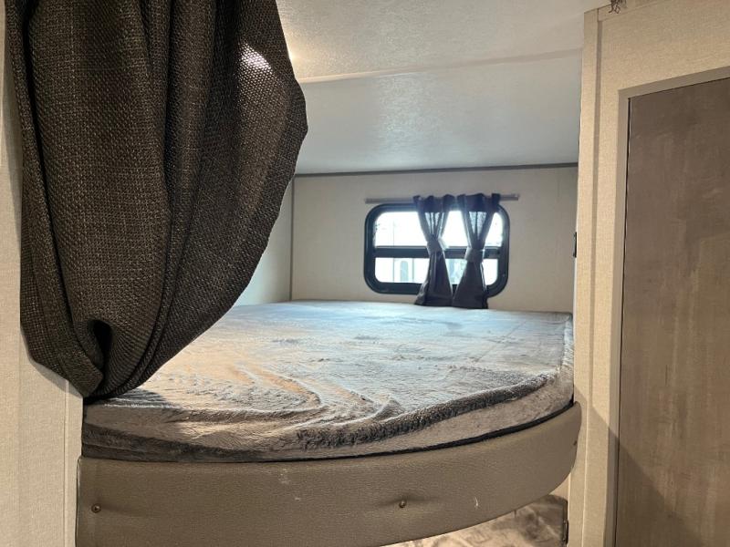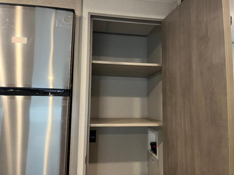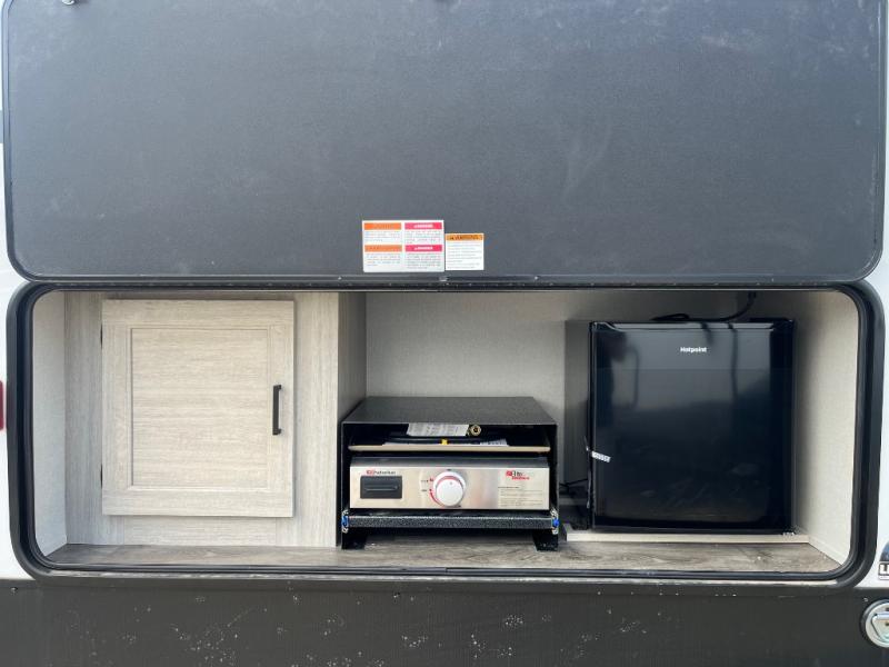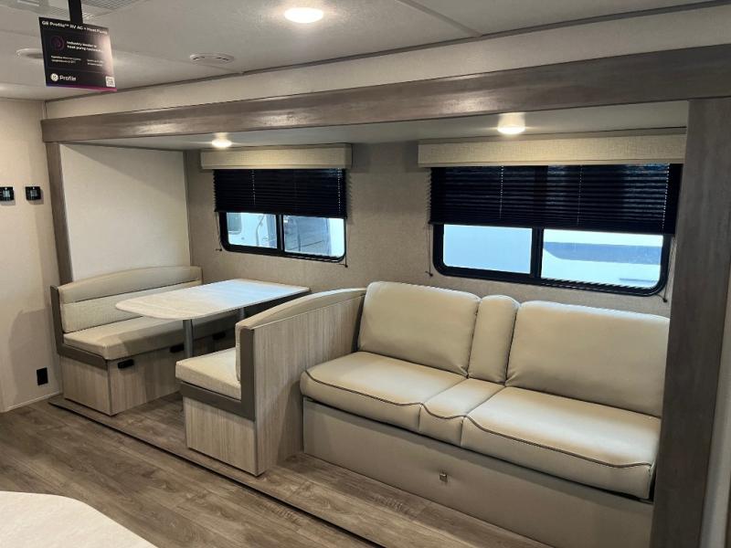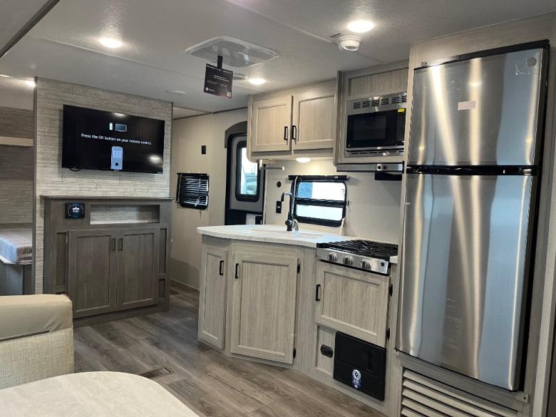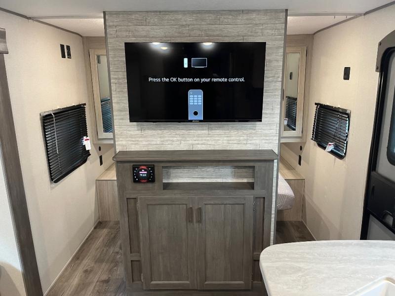 This is the perfect mid-size travel trailer for you and your family! The 46" x 74" double-size bunk beds with lower interior storage offer a comfortable sleeping space for the kids and you will have your own private sleeping space with the 60" x 74" queen bed in the front private bedroom. Freshen up each morning in the rear corner bathroom with the tub/shower and a mirror to get ready each morning. You can prepare your best home cooked meals with the GE stainless three burner cooktop and GE stainless 10.7 cu. ft. 12V refrigerator, then enjoy them together at the booth dinette. The sofa is near the entertainment center for a relaxing movie night. Don't leave any of your outdoor gear behind either thanks to the front pass-through storage area and the exterior outside storage area. You could even add the optional outside camper kitchen to grill the catch of the day on the pull out griddle!