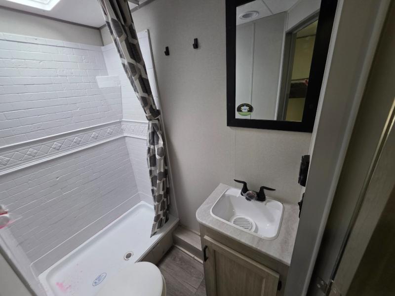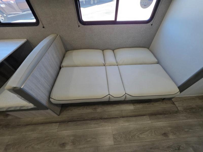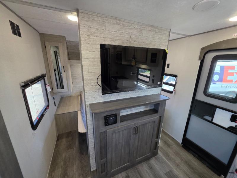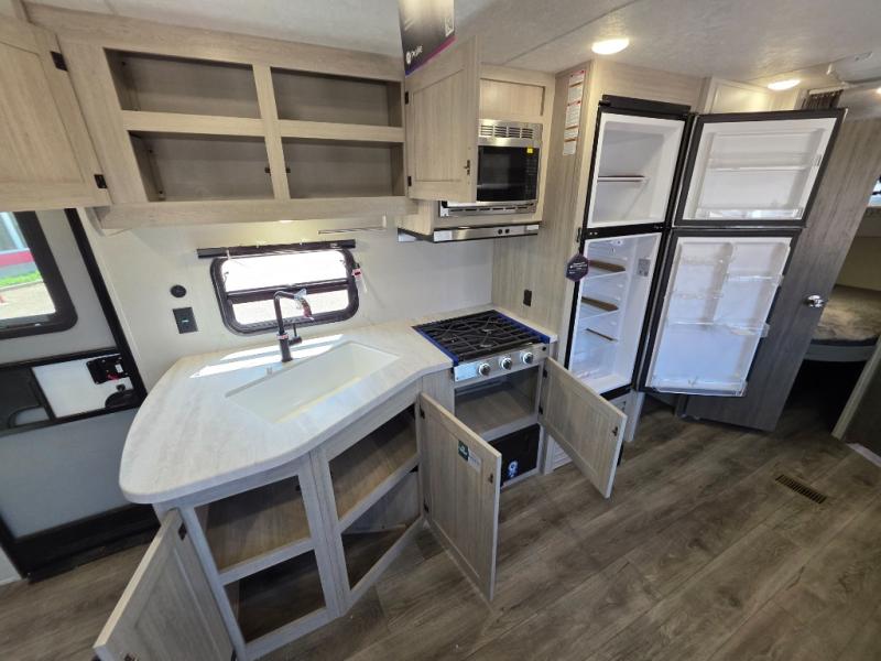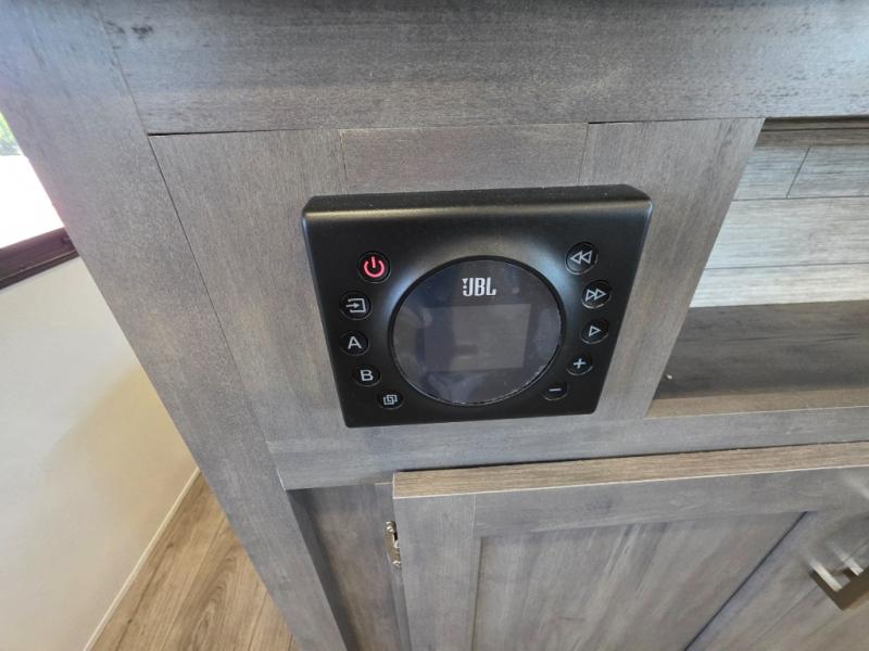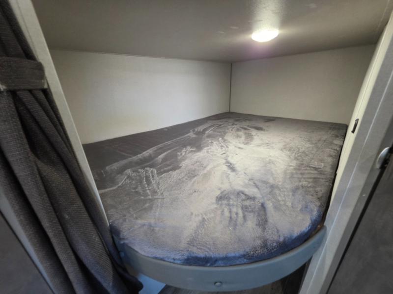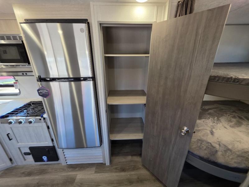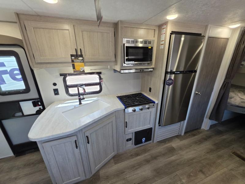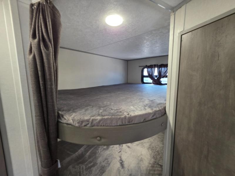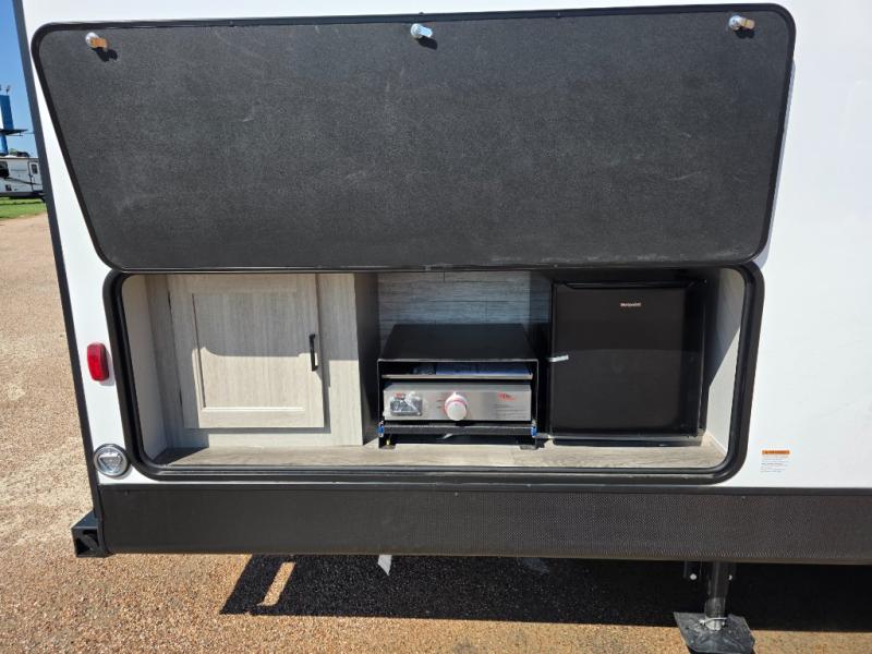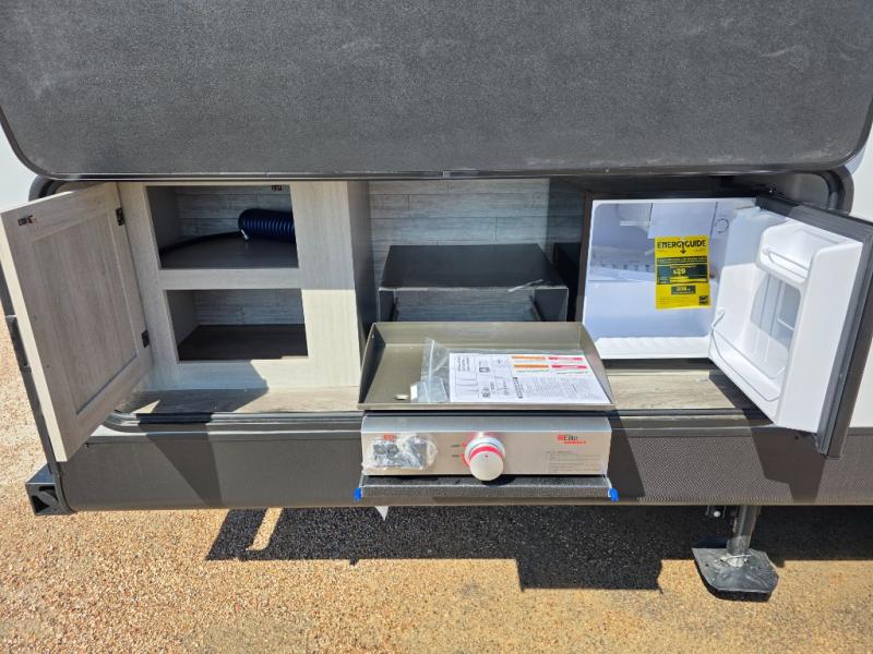 This is the perfect mid-size travel trailer for you and your family! The 46" x 74" double-size bunk beds with lower interior storage offer a comfortable sleeping space for the kids and you will have your own private sleeping space with the 60" x 74" queen bed in the front private bedroom. Freshen up each morning in the rear corner bathroom with the tub/shower and a mirror to get ready each morning. You can prepare your best home cooked meals with the GE stainless three burner cooktop and GE stainless 10.7 cu. ft. 12V refrigerator, then enjoy them together at the booth dinette. The sofa is near the entertainment center for a relaxing movie night. Don't leave any of your outdoor gear behind either thanks to the front pass-through storage area and the exterior outside storage area. You could even add the optional outside camper kitchen to grill the catch of the day on the pull out griddle!