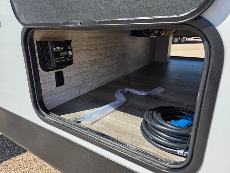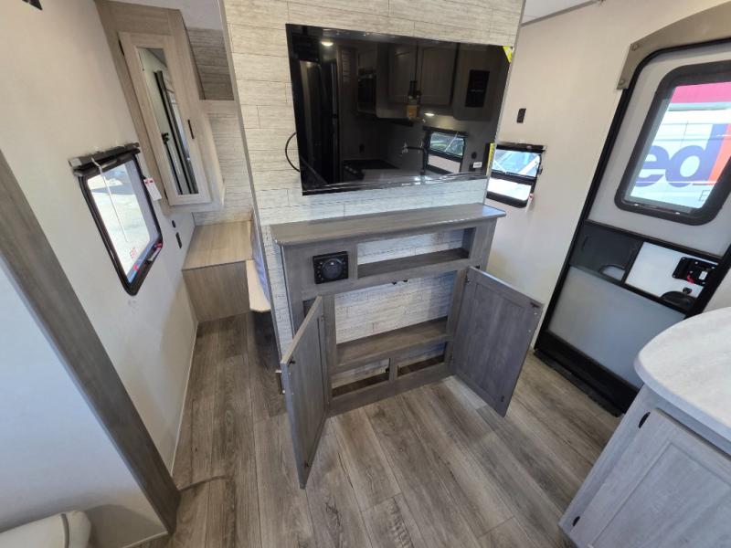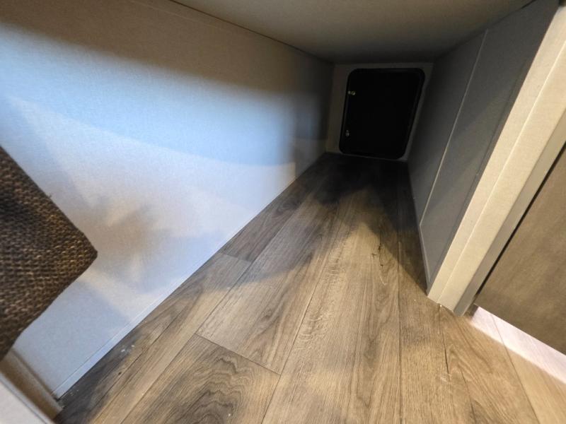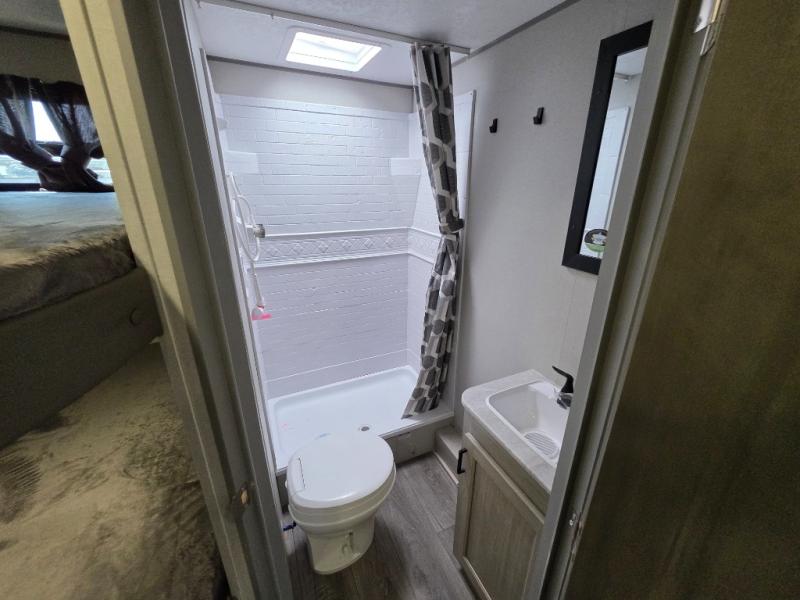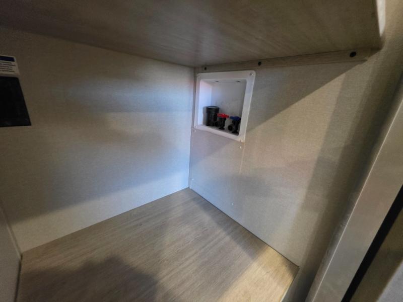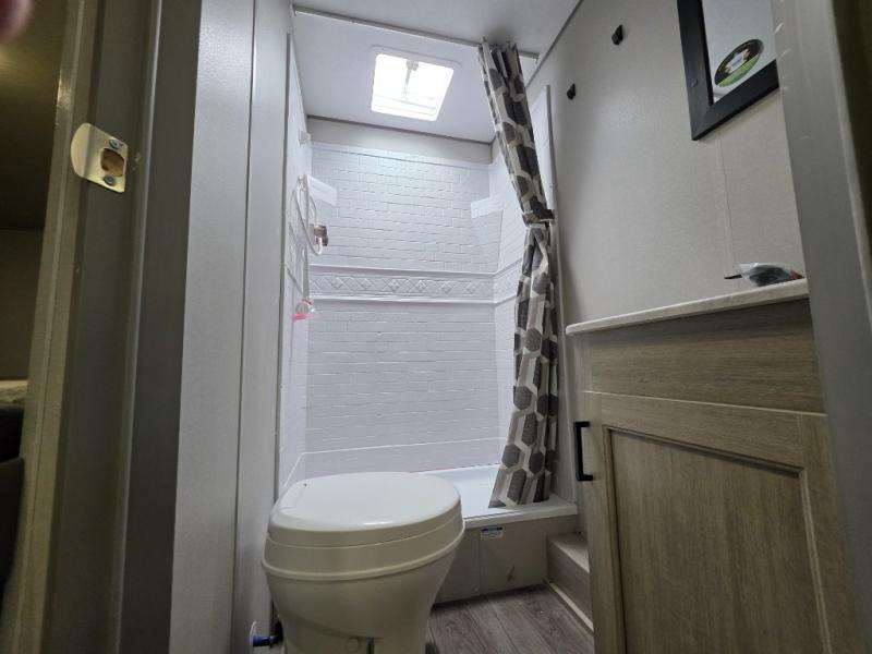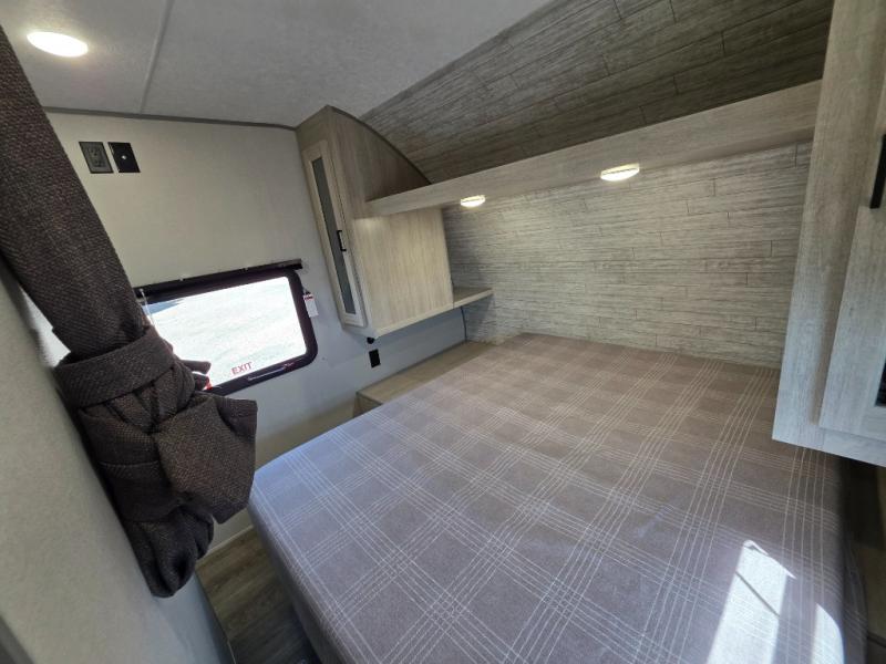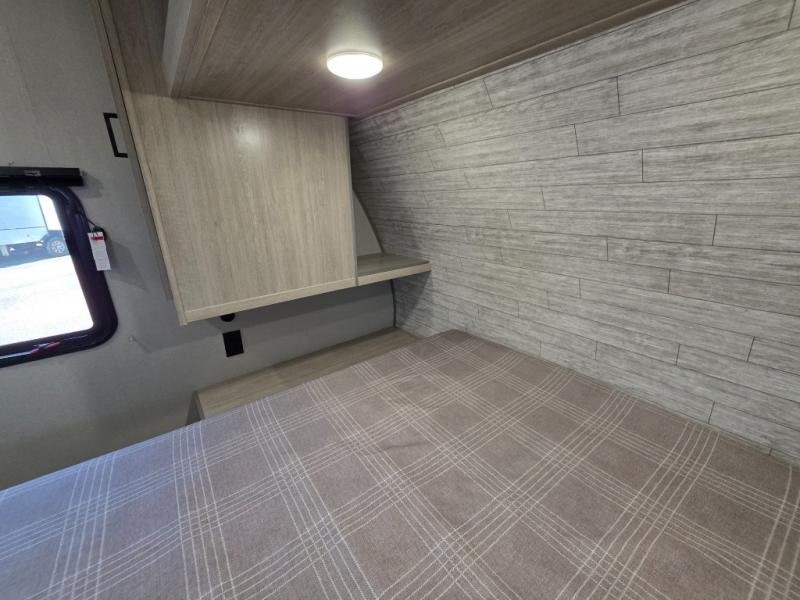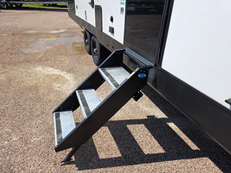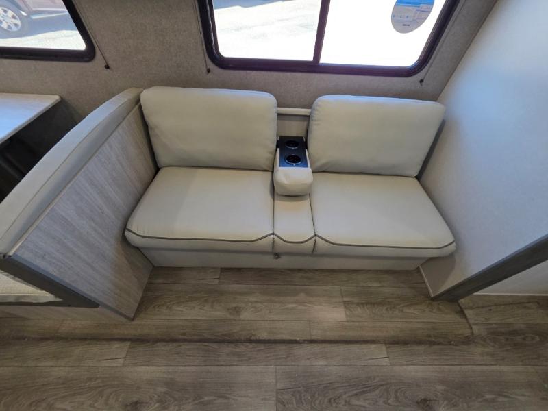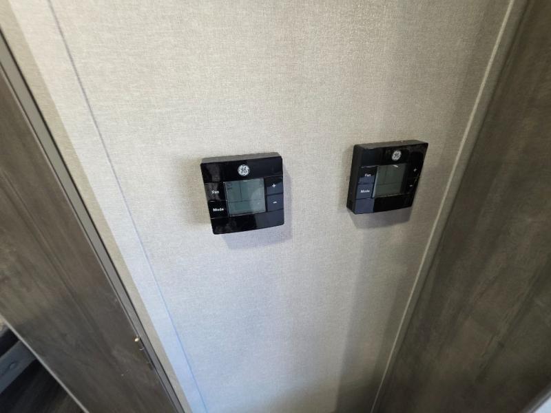 This is the perfect mid-size travel trailer for you and your family! The 46" x 74" double-size bunk beds with lower interior storage offer a comfortable sleeping space for the kids and you will have your own private sleeping space with the 60" x 74" queen bed in the front private bedroom. Freshen up each morning in the rear corner bathroom with the tub/shower and a mirror to get ready each morning. You can prepare your best home cooked meals with the GE stainless three burner cooktop and GE stainless 10.7 cu. ft. 12V refrigerator, then enjoy them together at the booth dinette. The sofa is near the entertainment center for a relaxing movie night. Don't leave any of your outdoor gear behind either thanks to the front pass-through storage area and the exterior outside storage area. You could even add the optional outside camper kitchen to grill the catch of the day on the pull out griddle!