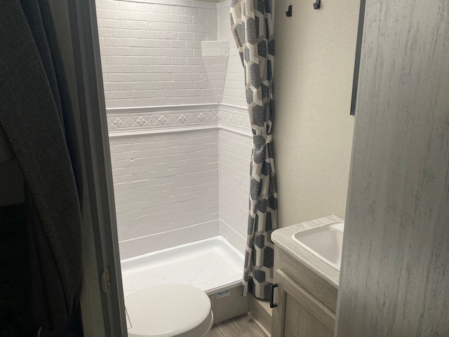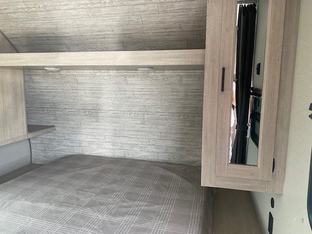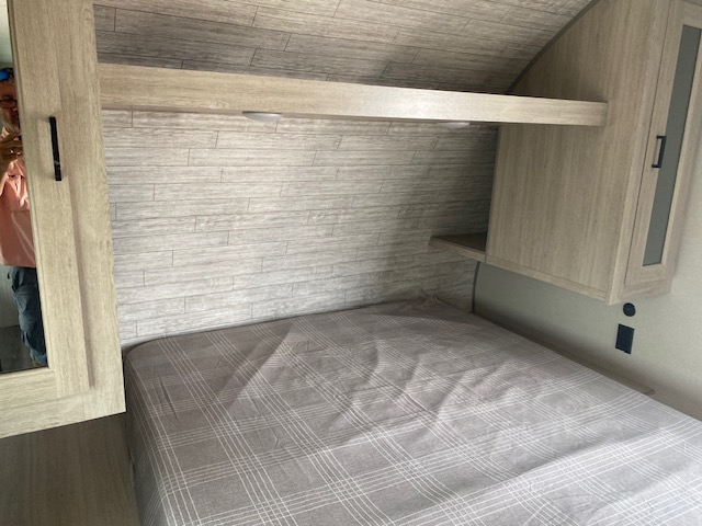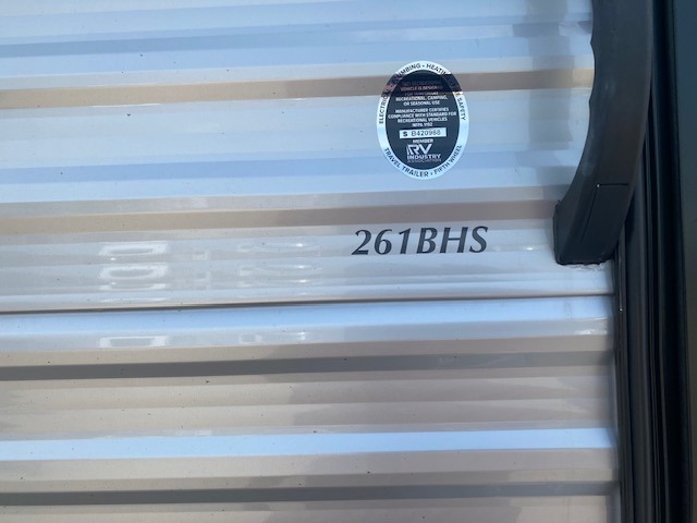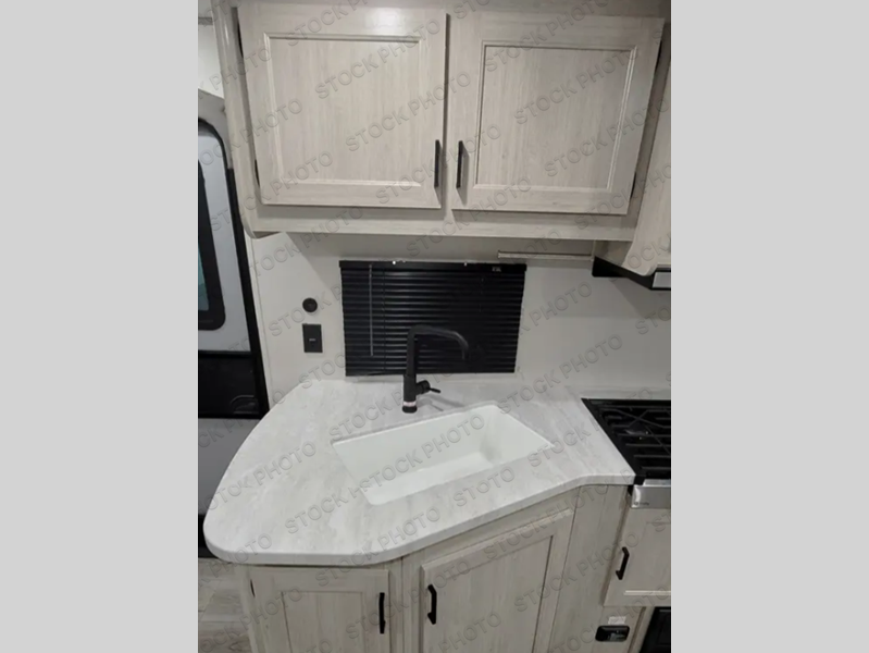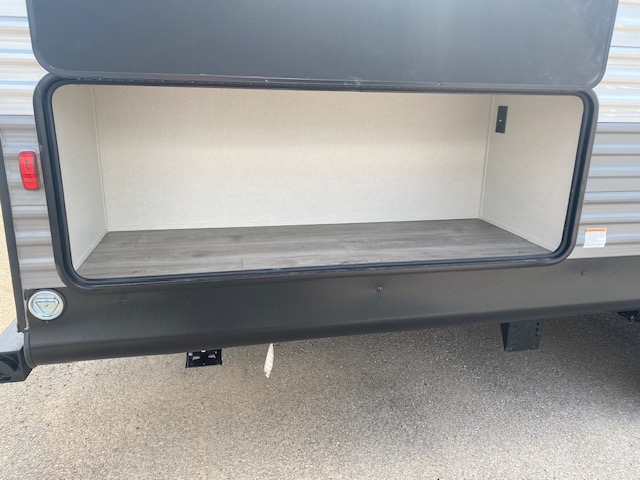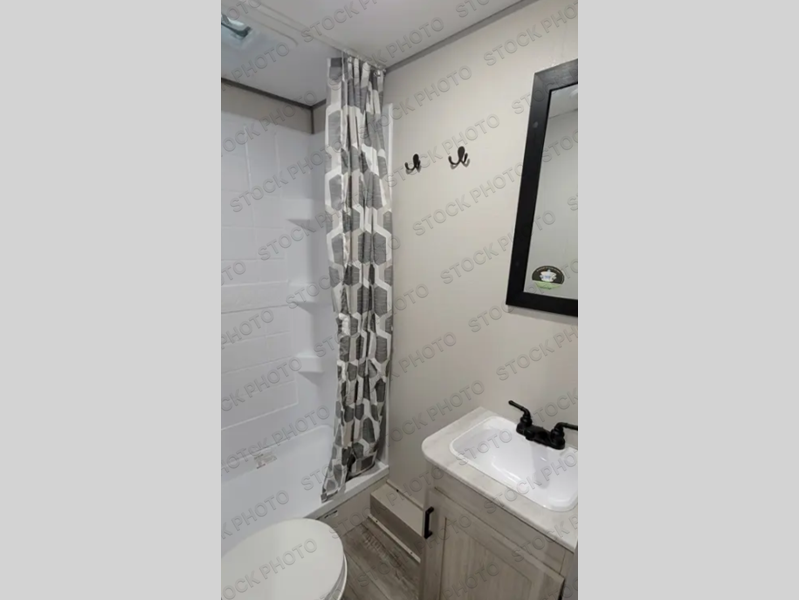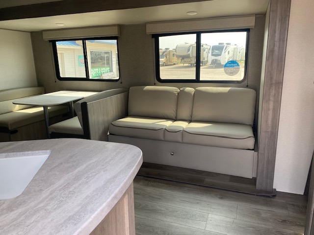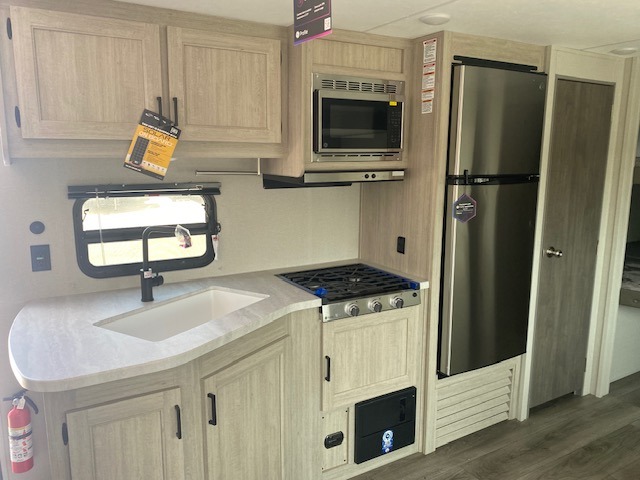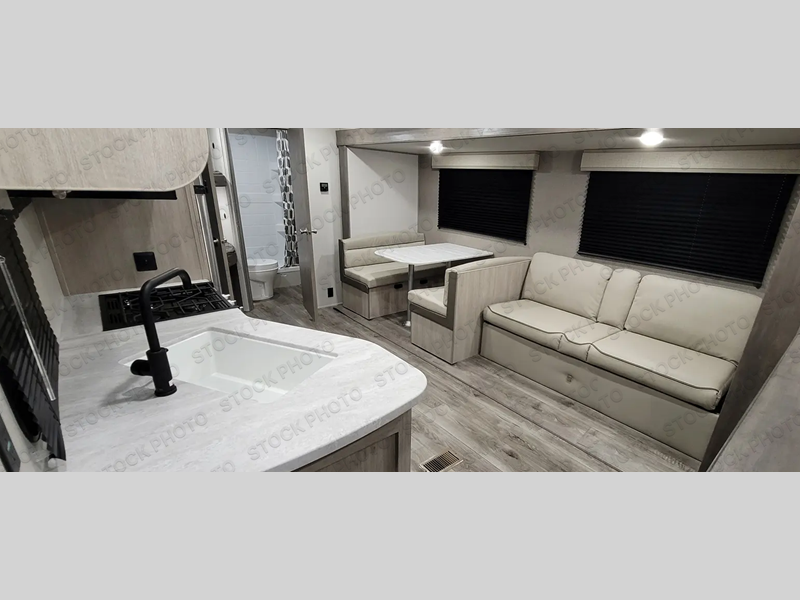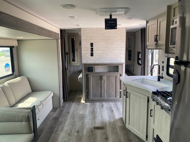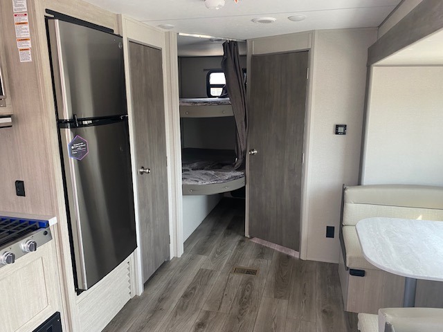 This is the perfect mid-size travel trailer for you and your family! The 46" x 74" double-size bunk beds with lower interior storage offer a comfortable sleeping space for the kids and you will have your own private sleeping space with the 60" x 74" queen bed in the front private bedroom. Freshen up each morning in the rear corner bathroom with the tub/shower and a mirror to get ready each morning. You can prepare your best home cooked meals with the GE stainless three burner cooktop and GE stainless 10.7 cu. ft. 12V refrigerator, then enjoy them together at the booth dinette. The sofa is near the entertainment center for a relaxing movie night. Don't leave any of your outdoor gear behind either thanks to the front pass-through storage area and the exterior outside storage area. You could even add the optional outside camper kitchen to grill the catch of the day on the pull out griddle!