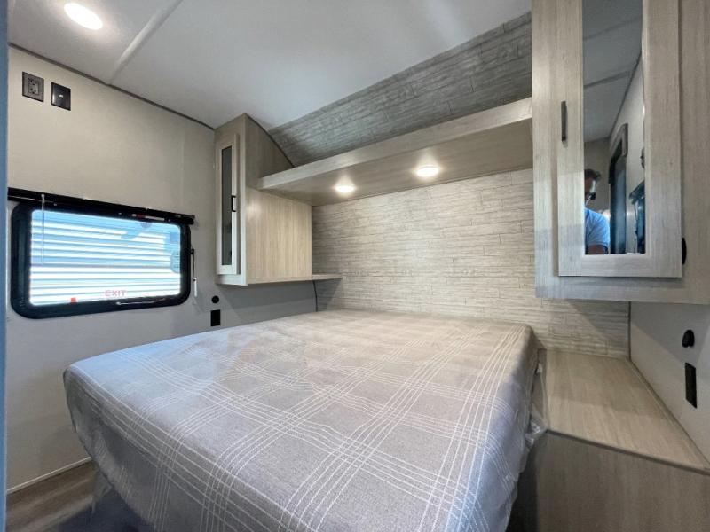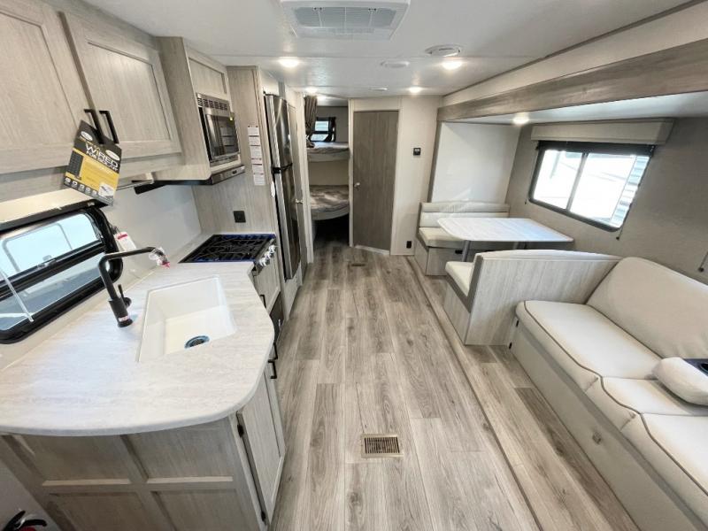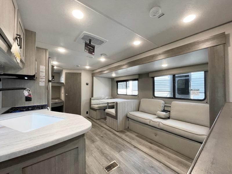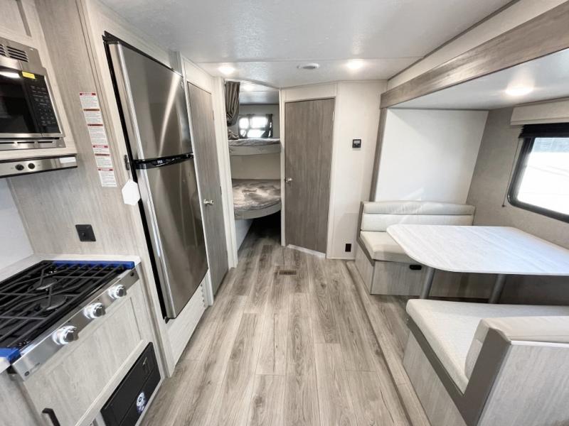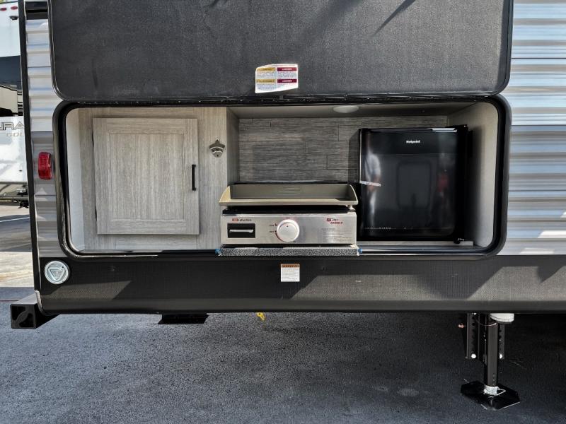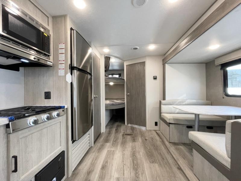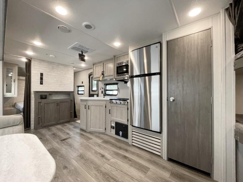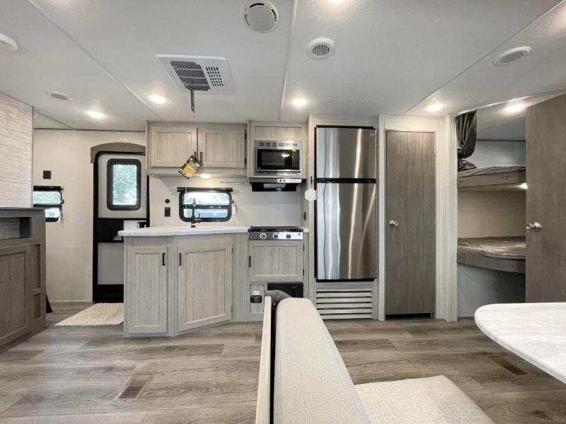 This is the perfect mid-size travel trailer for you and your family! The 46" x 74" double-size bunk beds with lower interior storage offer a comfortable sleeping space for the kids and you will have your own private sleeping space with the 60" x 74" queen bed in the front private bedroom. Freshen up each morning in the rear corner bathroom with the tub/shower and a mirror to get ready each morning. You can prepare your best home cooked meals with the GE stainless three burner cooktop and GE stainless 10.7 cu. ft. 12V refrigerator, then enjoy them together at the booth dinette. The sofa is near the entertainment center for a relaxing movie night. Don't leave any of your outdoor gear behind either thanks to the front pass-through storage area and the exterior outside storage area. You could even add the optional outside camper kitchen to grill the catch of the day on the pull out griddle!