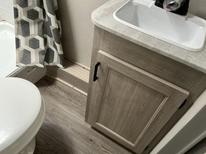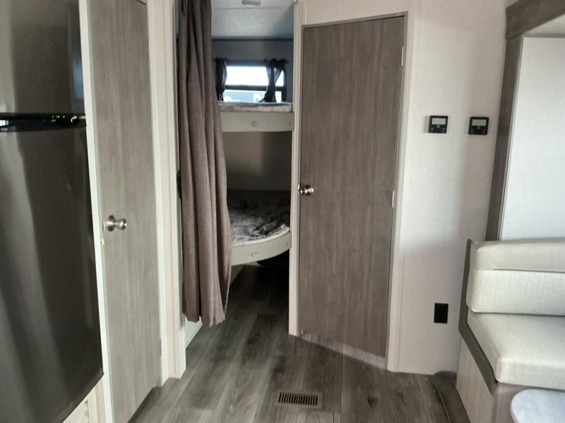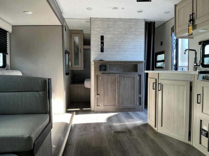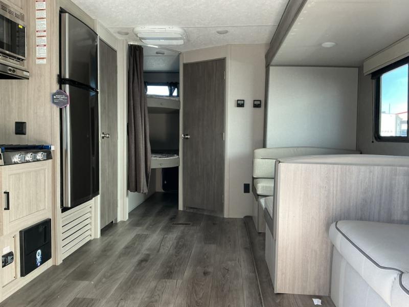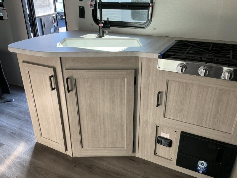 This is the perfect mid-size travel trailer for you and your family! The 46" x 74" double-size bunk beds with lower interior storage offer a comfortable sleeping space for the kids and you will have your own private sleeping space with the 60" x 74" queen bed in the front private bedroom. Freshen up each morning in the rear corner bathroom with the tub/shower and a mirror to get ready each morning. You can prepare your best home cooked meals with the GE stainless three burner cooktop and GE stainless 10.7 cu. ft. 12V refrigerator, then enjoy them together at the booth dinette. The sofa is near the entertainment center for a relaxing movie night. Don't leave any of your outdoor gear behind either thanks to the front pass-through storage area and the exterior outside storage area. You could even add the optional outside camper kitchen to grill the catch of the day on the pull out griddle!