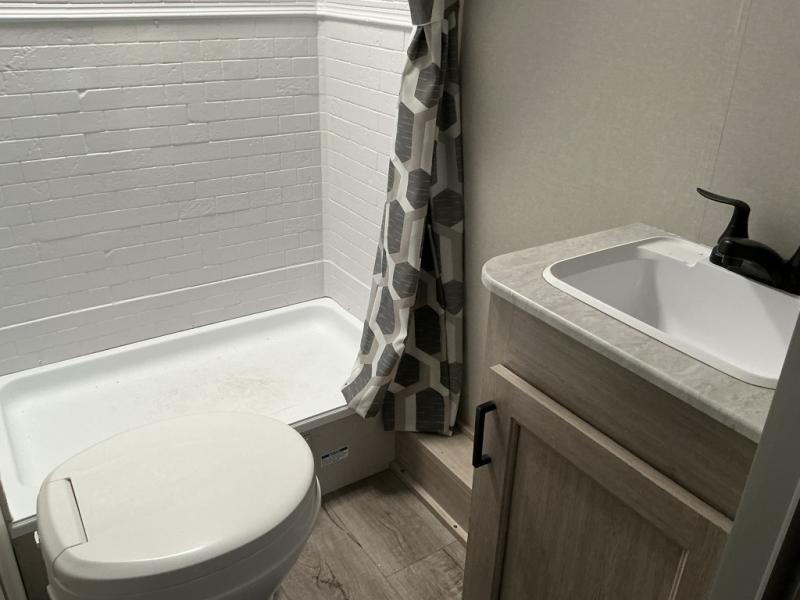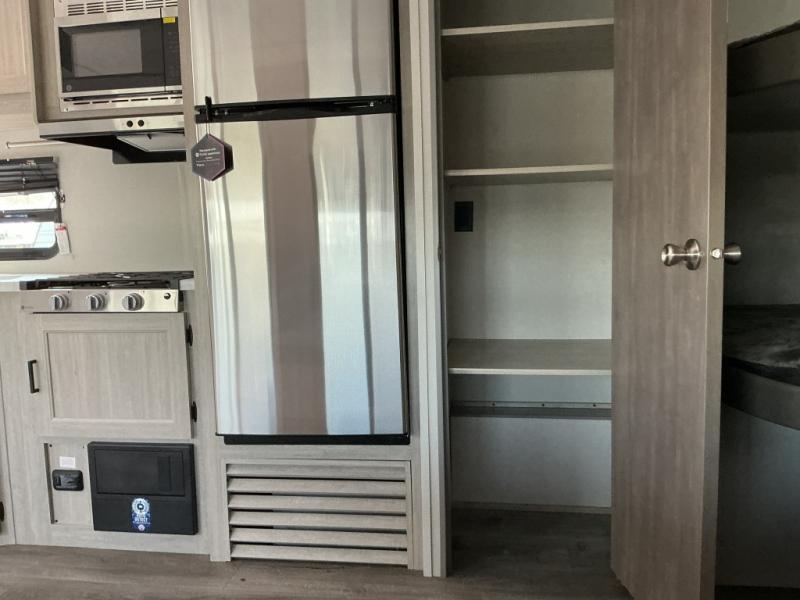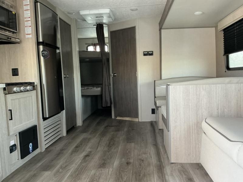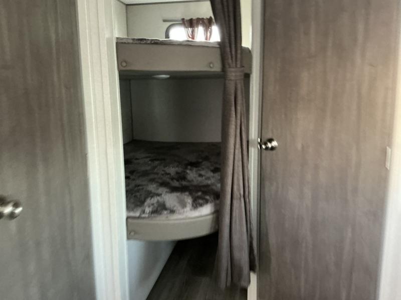 This is the perfect mid-size travel trailer for you and your family! The 46" x 74" double-size bunk beds with lower interior storage offer a comfortable sleeping space for the kids and you will have your own private sleeping space with the 60" x 74" queen bed in the front private bedroom. Freshen up each morning in the rear corner bathroom with the tub/shower and a mirror to get ready each morning. You can prepare your best home cooked meals with the GE stainless three burner cooktop and GE stainless 10.7 cu. ft. 12V refrigerator, then enjoy them together at the booth dinette. The sofa is near the entertainment center for a relaxing movie night. Don't leave any of your outdoor gear behind either thanks to the front pass-through storage area and the exterior outside storage area. You could even add the optional outside camper kitchen to grill the catch of the day on the pull out griddle!