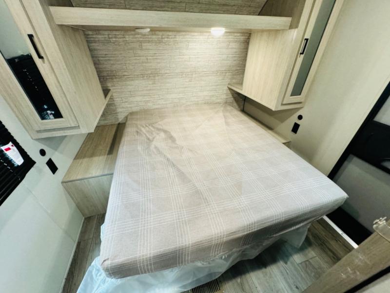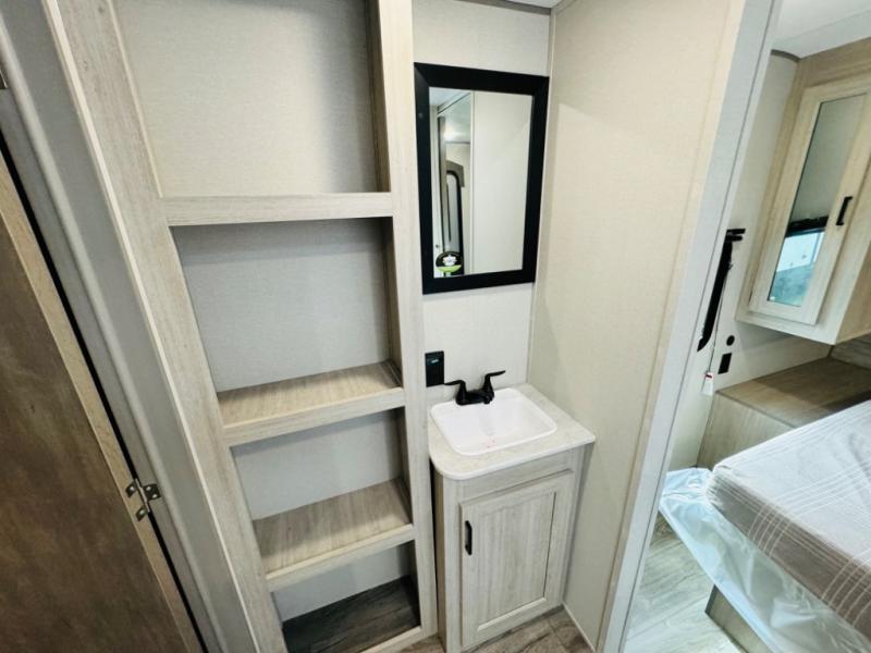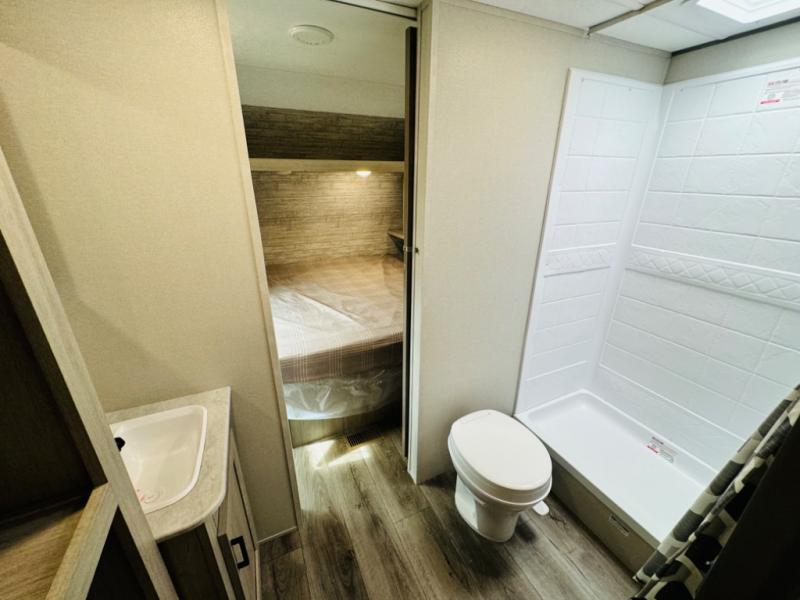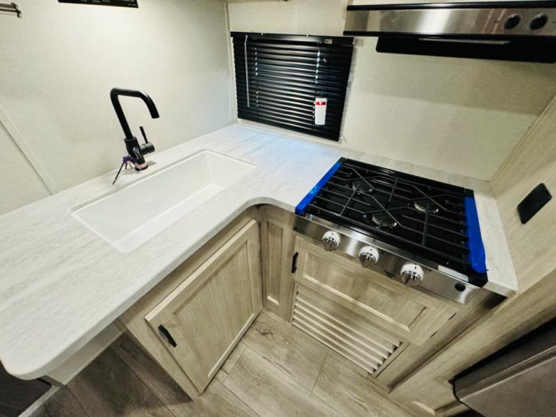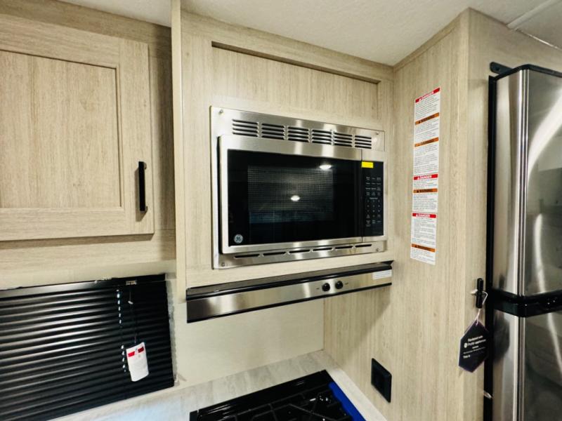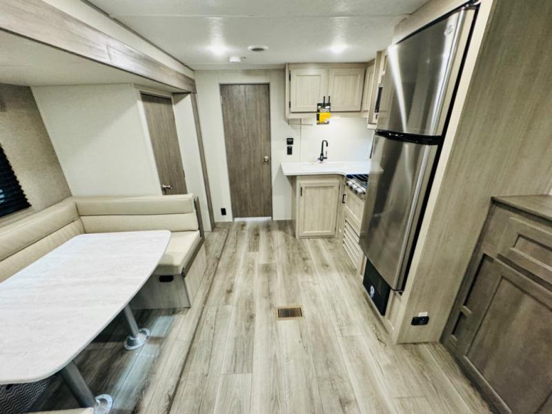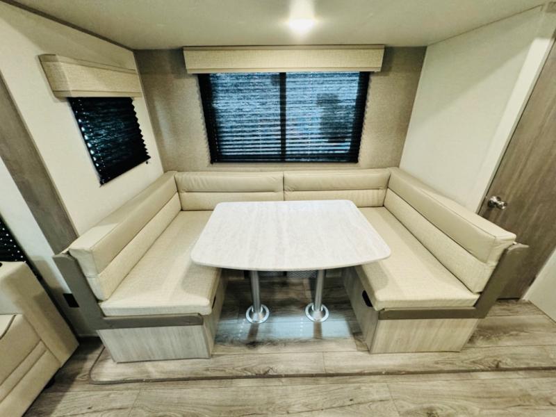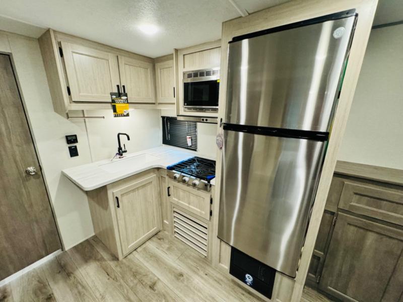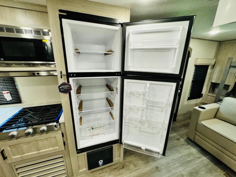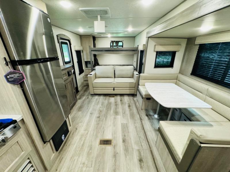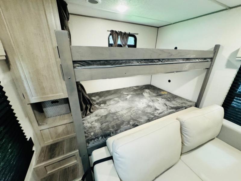 This bunkhouse travel trailer will be perfect for your whole crew! There is a large slide out in the main living area so you can stretch out, and here you'll find the U-shaped dinette and spacious pantry for snacks! The double-size bunks include steps leading up to them plus a wardrobe nearby for your guests' clothes. This model includes a walk-through bath with a tub/shower that will make bath time for little ones easier than ever, and you'll love having your own bedroom up front. A queen bed comes standard, along with dual wardrobes, plus one of the dual entry doors for convenience. The interior kitchen includes a three burner cooktop and a microwave oven, and the outdoor camper kitchen includes a pull-out griddle, a refrigerator, and a cabinet for storage!