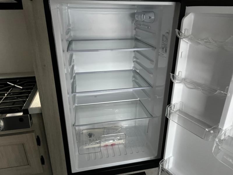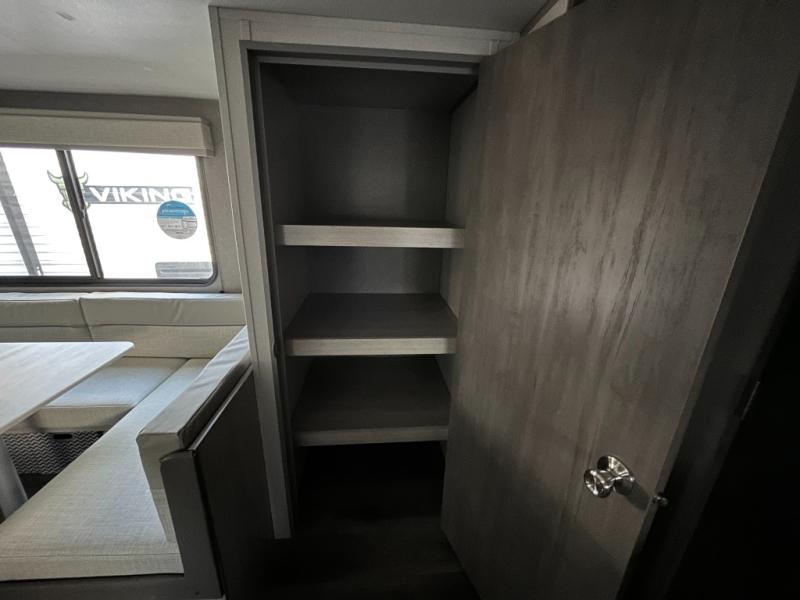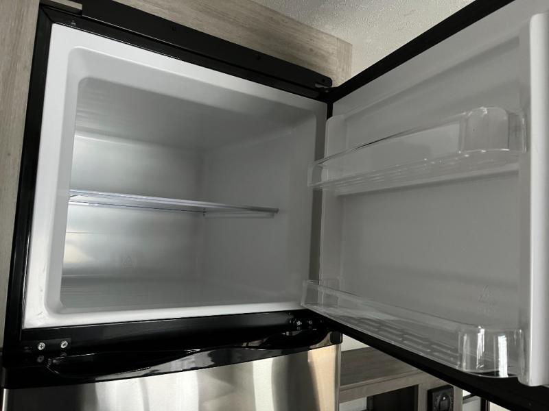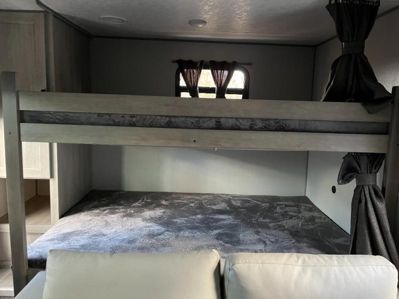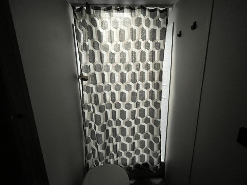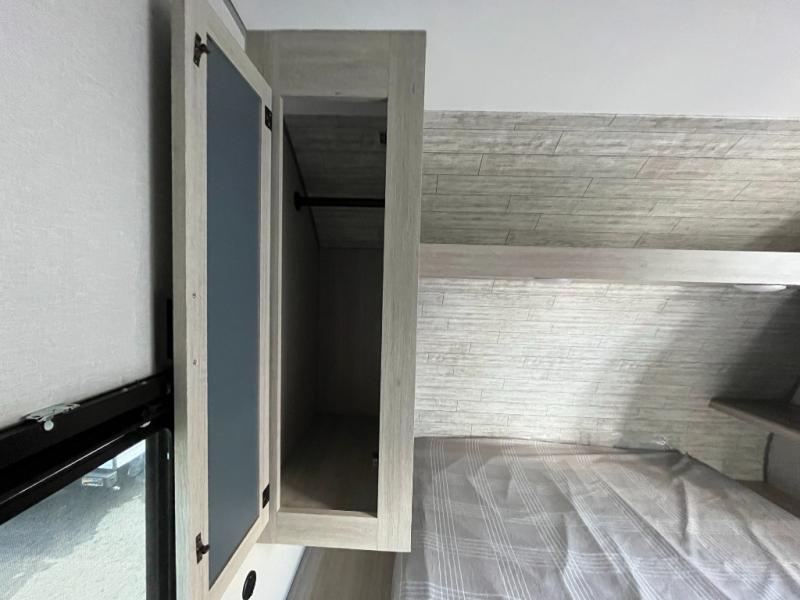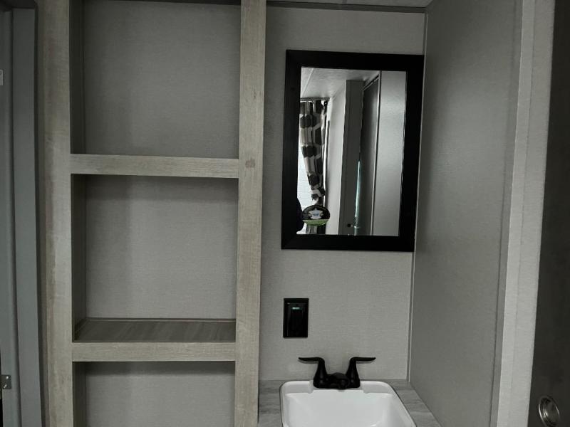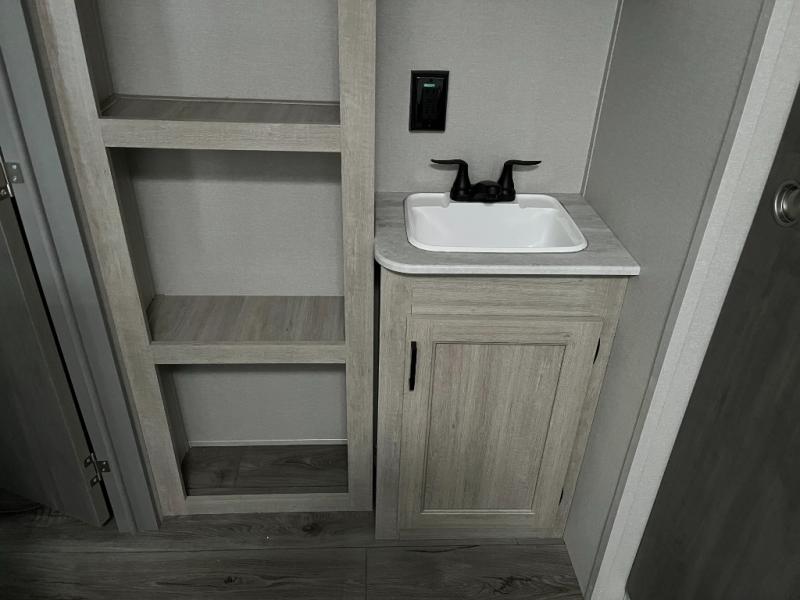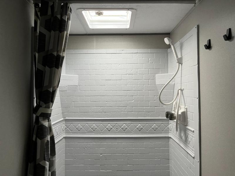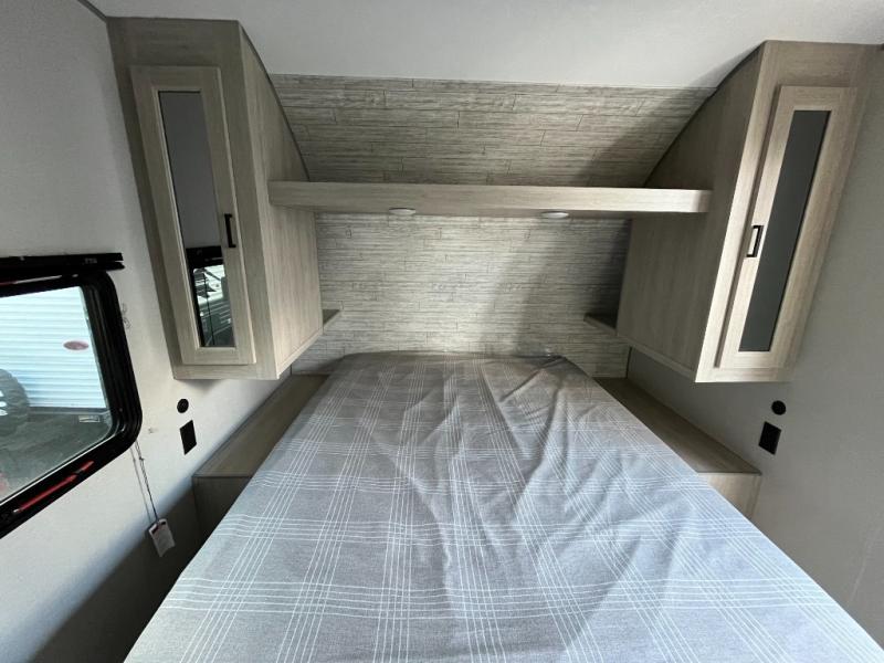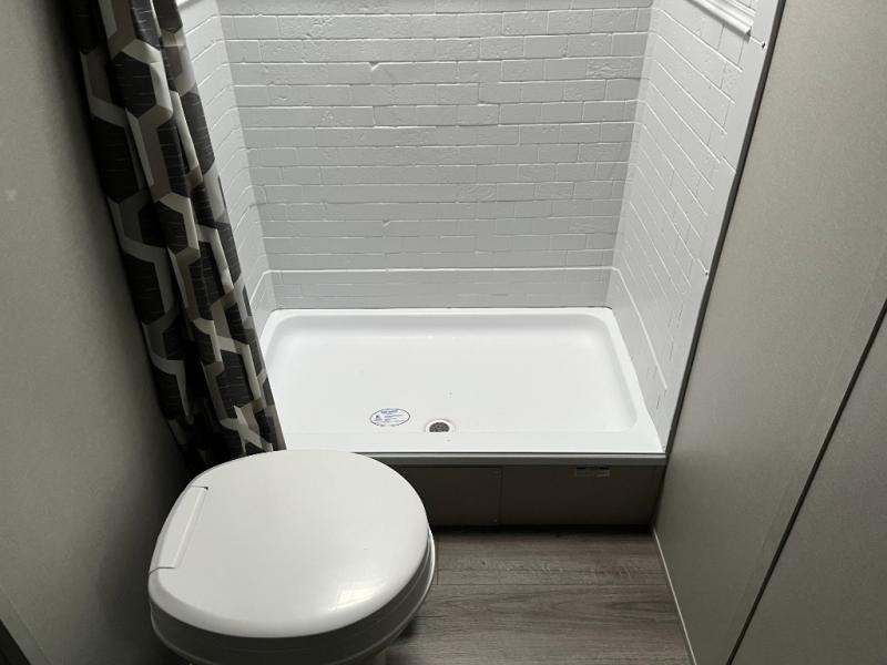 After a full day of outdoor fun, retreat to the private master bedroom with a cozy bed and storage for personal belongings. The full bathroom is conveniently located and outfitted with a shower, sink, and toilet — giving you all the comforts of home no matter where you park for the night.