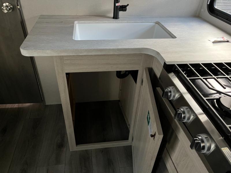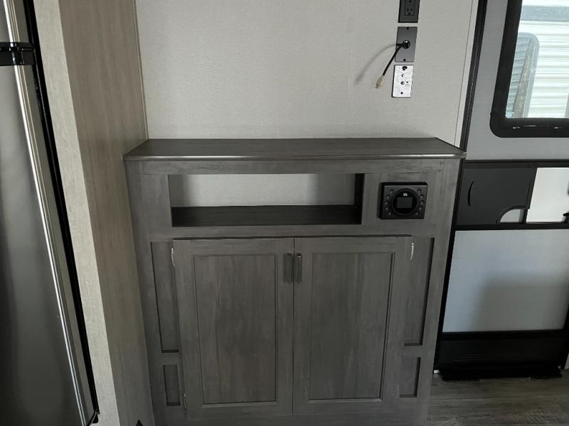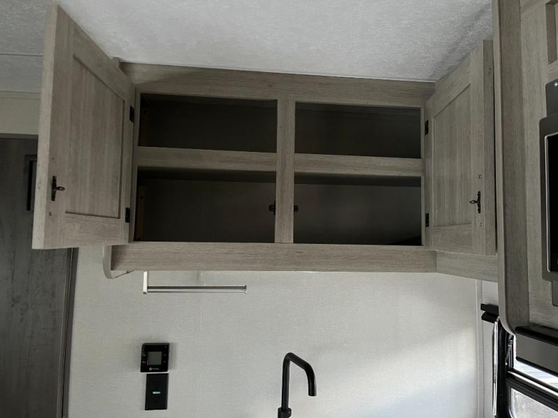 The well-appointed kitchen is designed to make meal prep simple and enjoyable. Featuring a three-burner stovetop, refrigerator, microwave, and ample countertop space, this kitchen gives you everything you need to prepare quick snacks or full meals on the road. Smart cabinetry and storage solutions ensure your cookware, dishes, and pantry items stay organized and accessible.