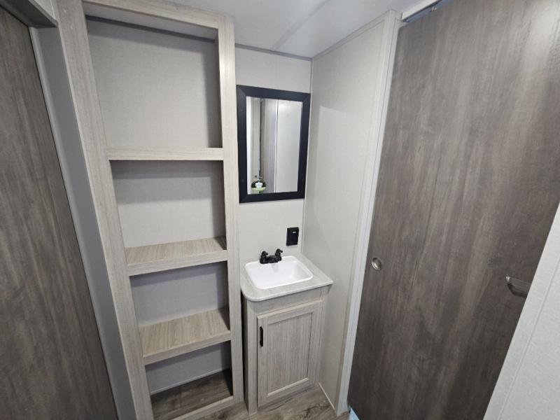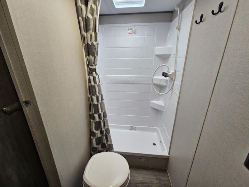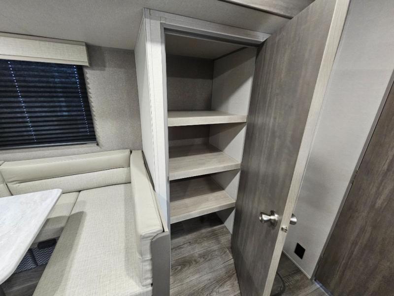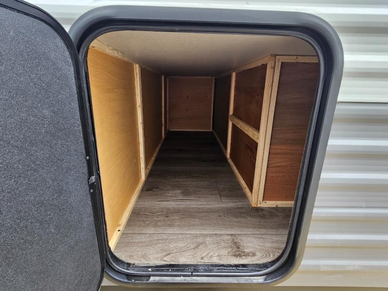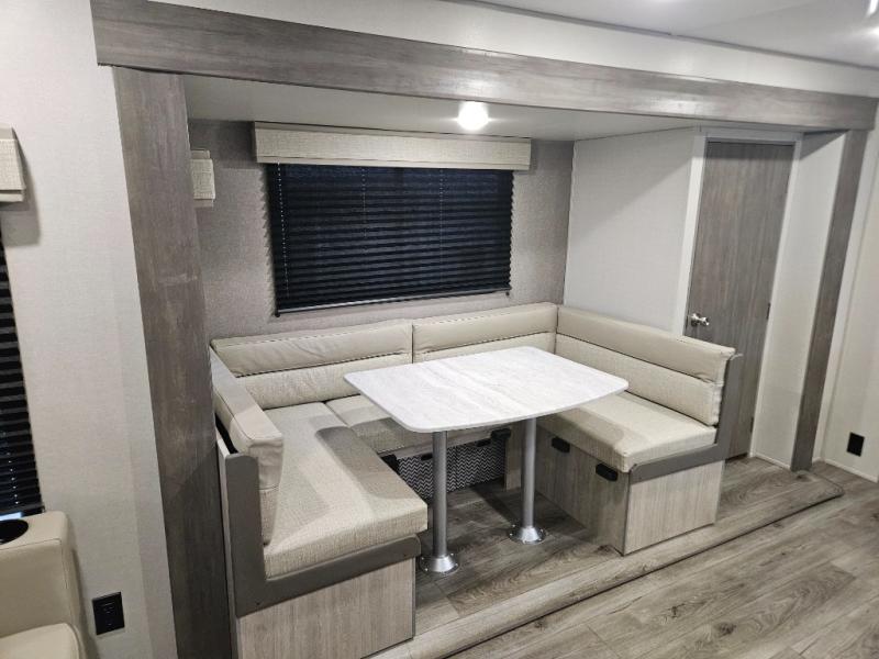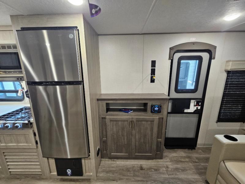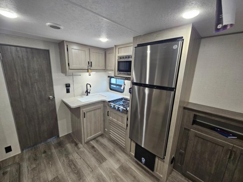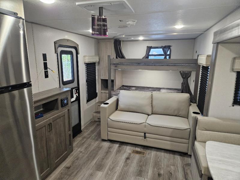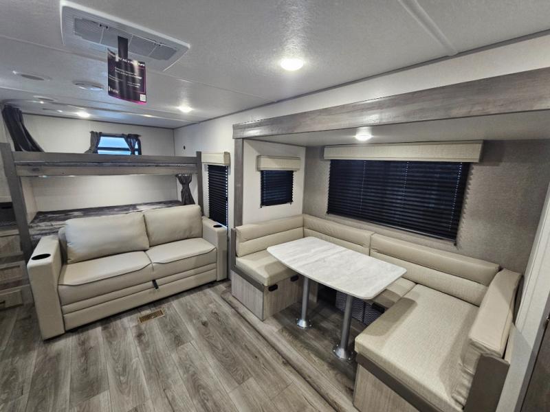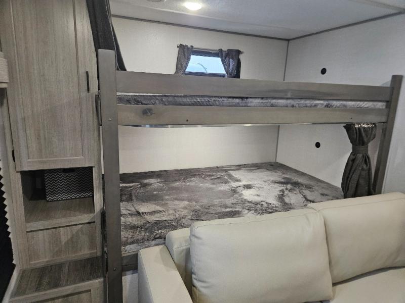 This bunkhouse travel trailer will be perfect for your whole crew! There is a large slide out in the main living area so you can stretch out, and here you'll find the U-shaped dinette and spacious pantry for snacks! The double-size bunks include steps leading up to them plus a wardrobe nearby for your guests' clothes. This model includes a walk-through bath with a tub/shower that will make bath time for little ones easier than ever, and you'll love having your own bedroom up front. A queen bed comes standard, along with dual wardrobes, plus one of the dual entry doors for convenience. The interior kitchen includes a three burner cooktop and a microwave oven, and the outdoor camper kitchen includes a pull-out griddle, a refrigerator, and a cabinet for storage!
